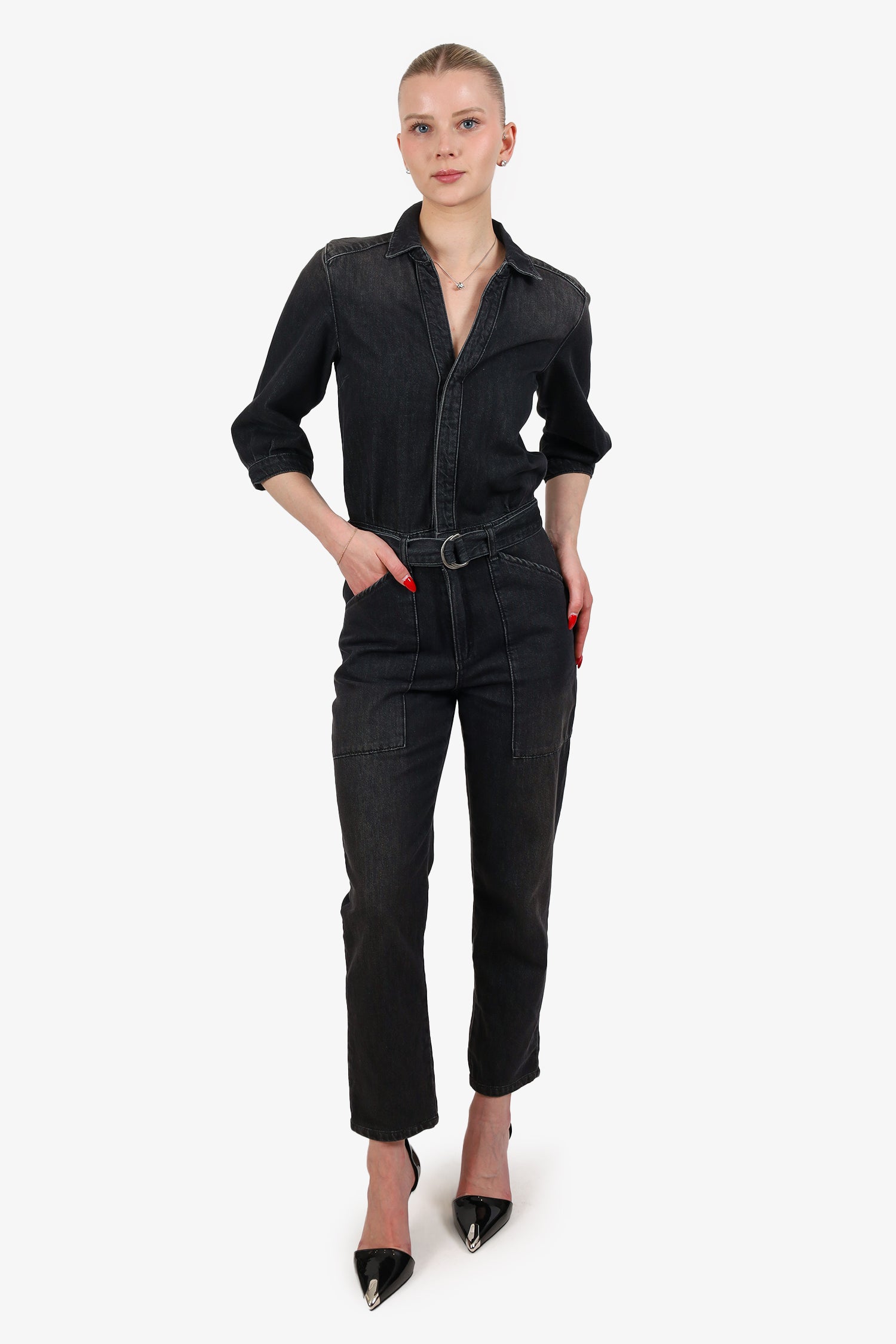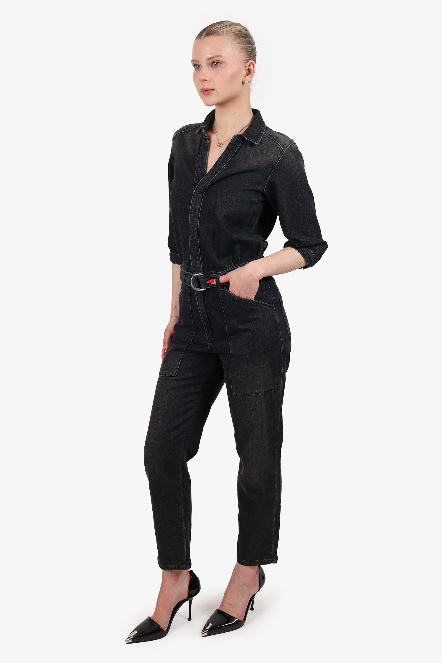 Refresh availabilityBa&sh Black Denim Belted Jumpsuit. Slip-on. Collared v-neckline. Front zip and button-up closure. 2 front exterior side slip pockets. Belt with adjustable pull-through closure at waistline. Tonal stitching.