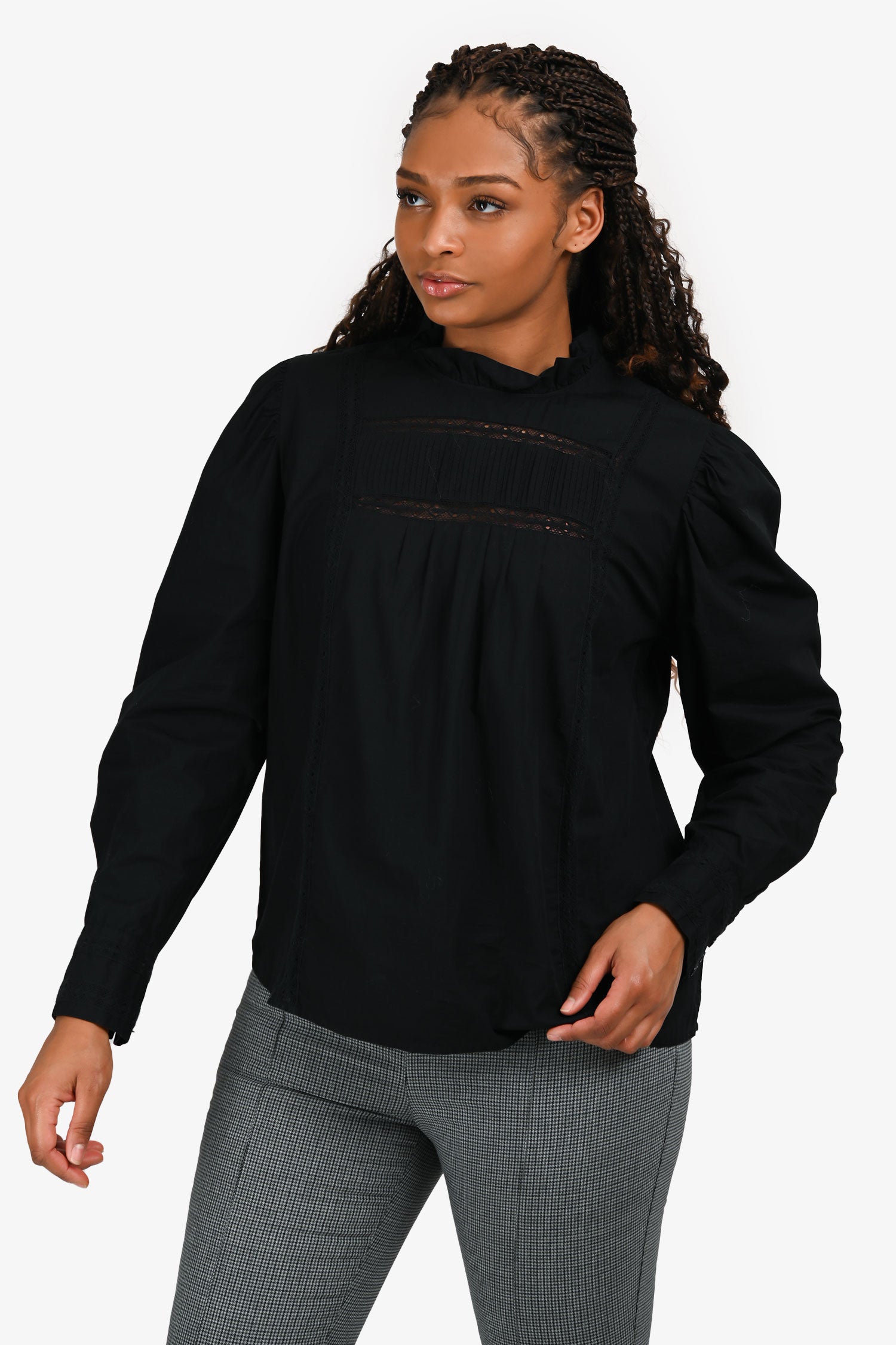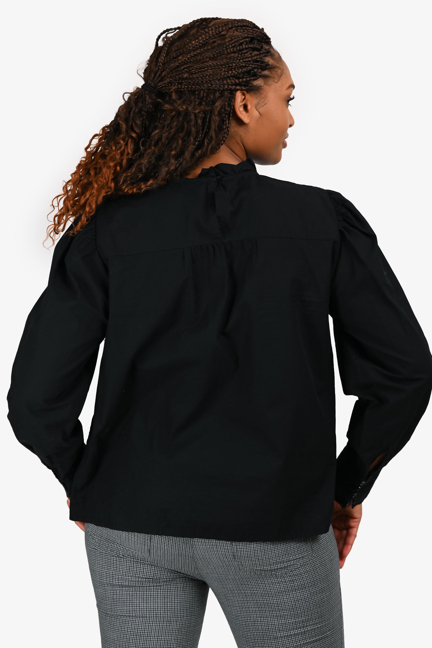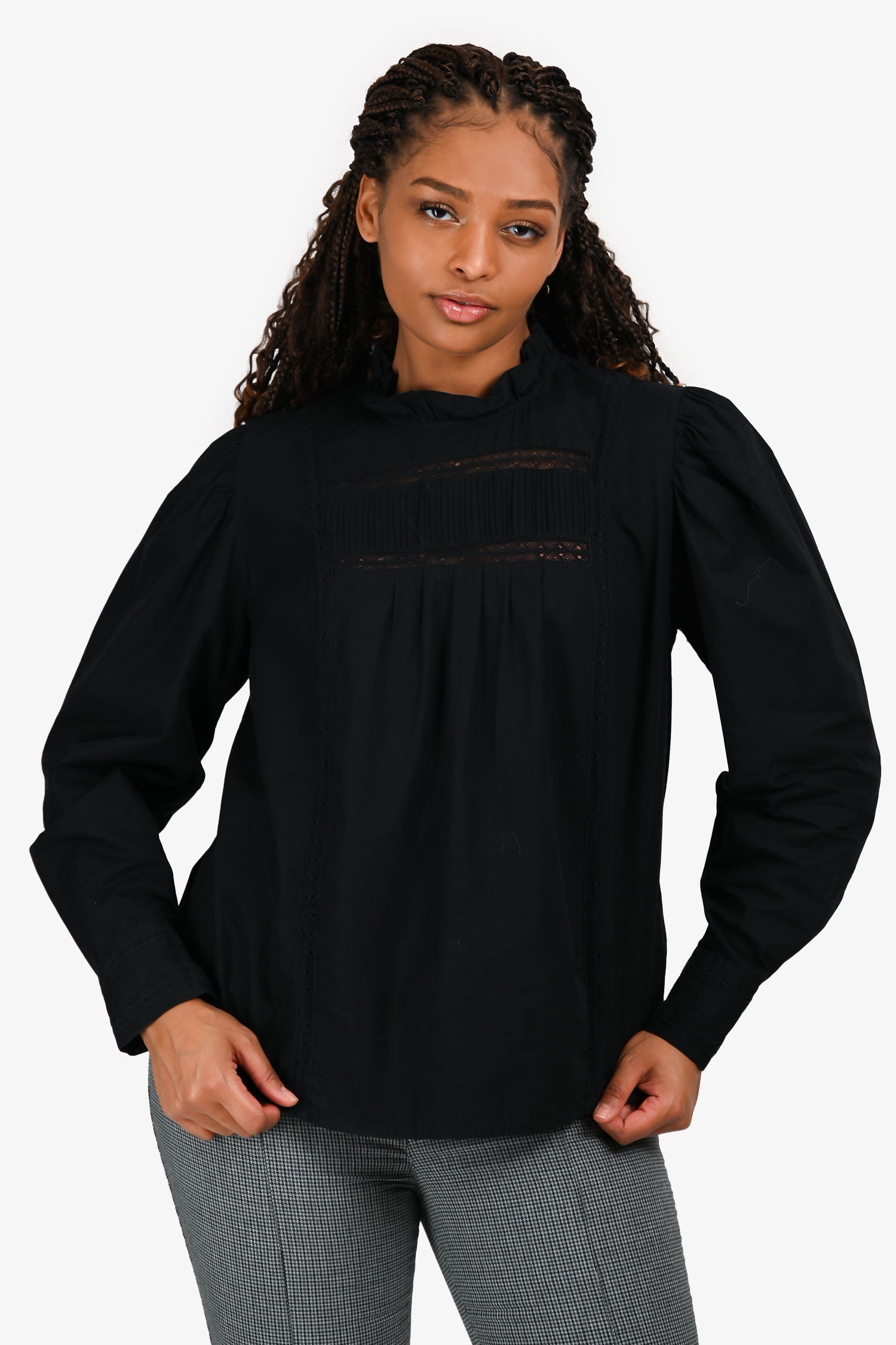 Refresh availabilityBa&sh Black Eyelet Mockneck Top. Ruffled collar. Eyelet trim. Single rear button closure. Buttoned cuffs. Tonal stitching.