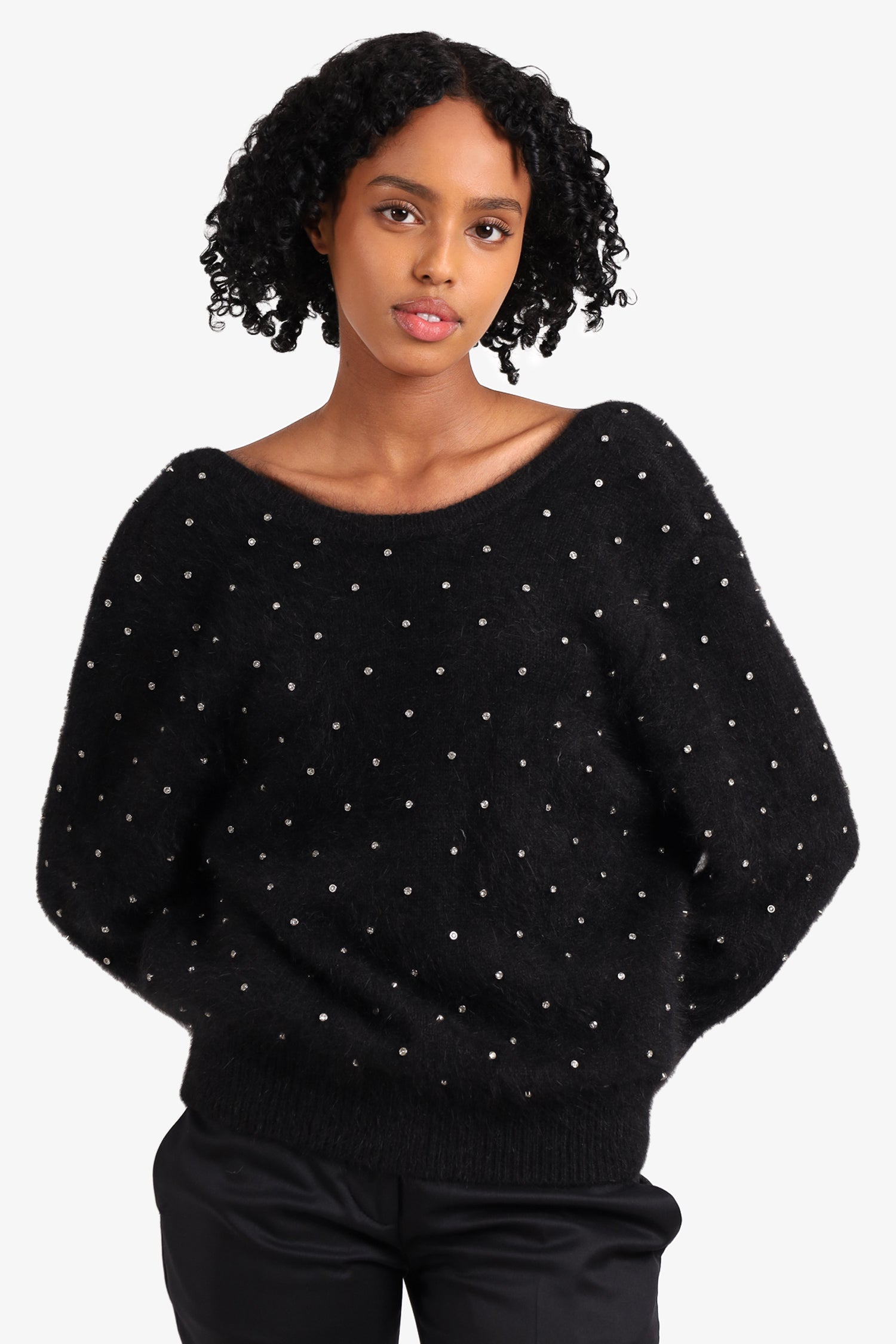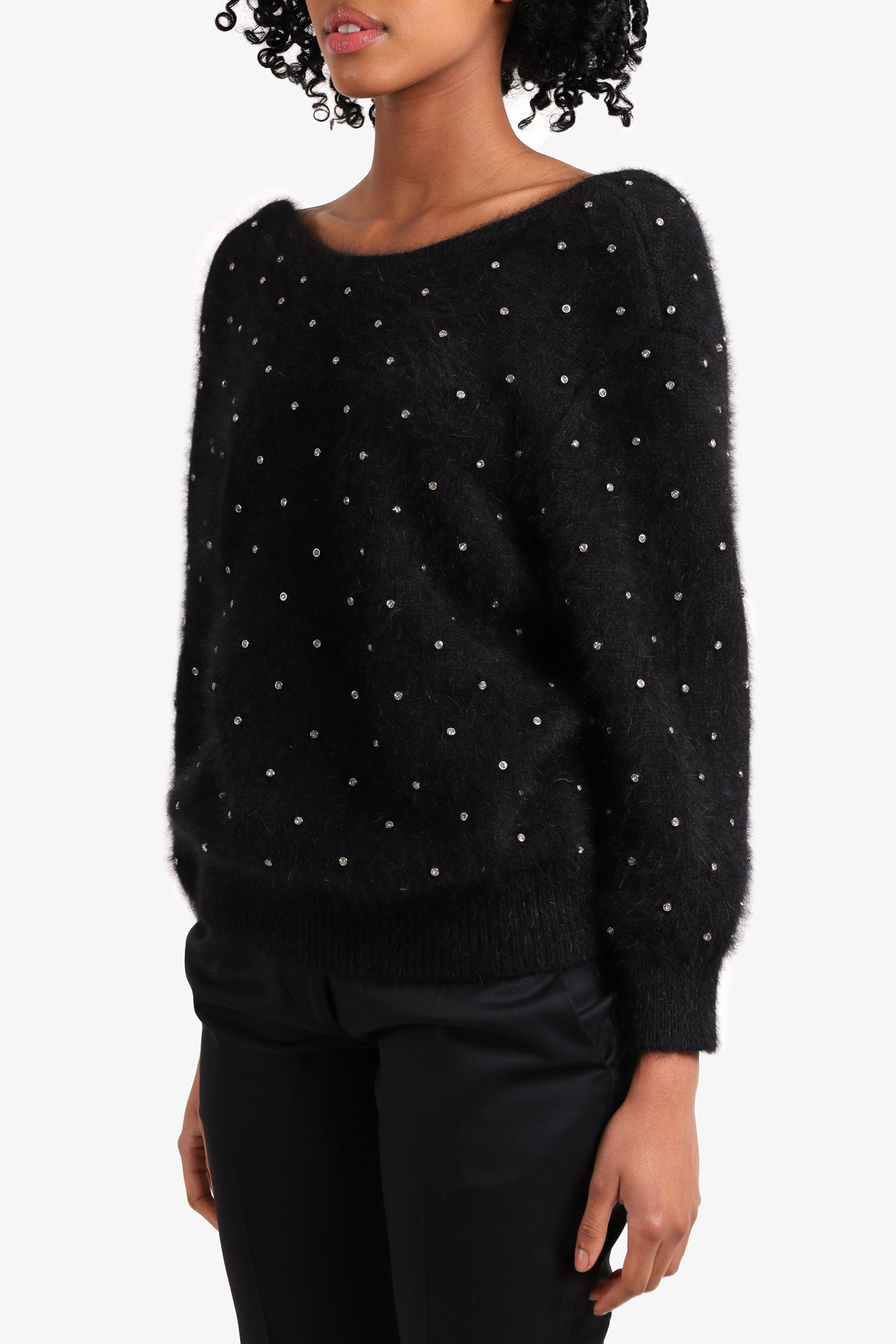 BA&SH Black Low Back Sweater With Crystals. Pull over. Unlined. Ribbed cuffs, hem, and neckline. Tonal stitching.