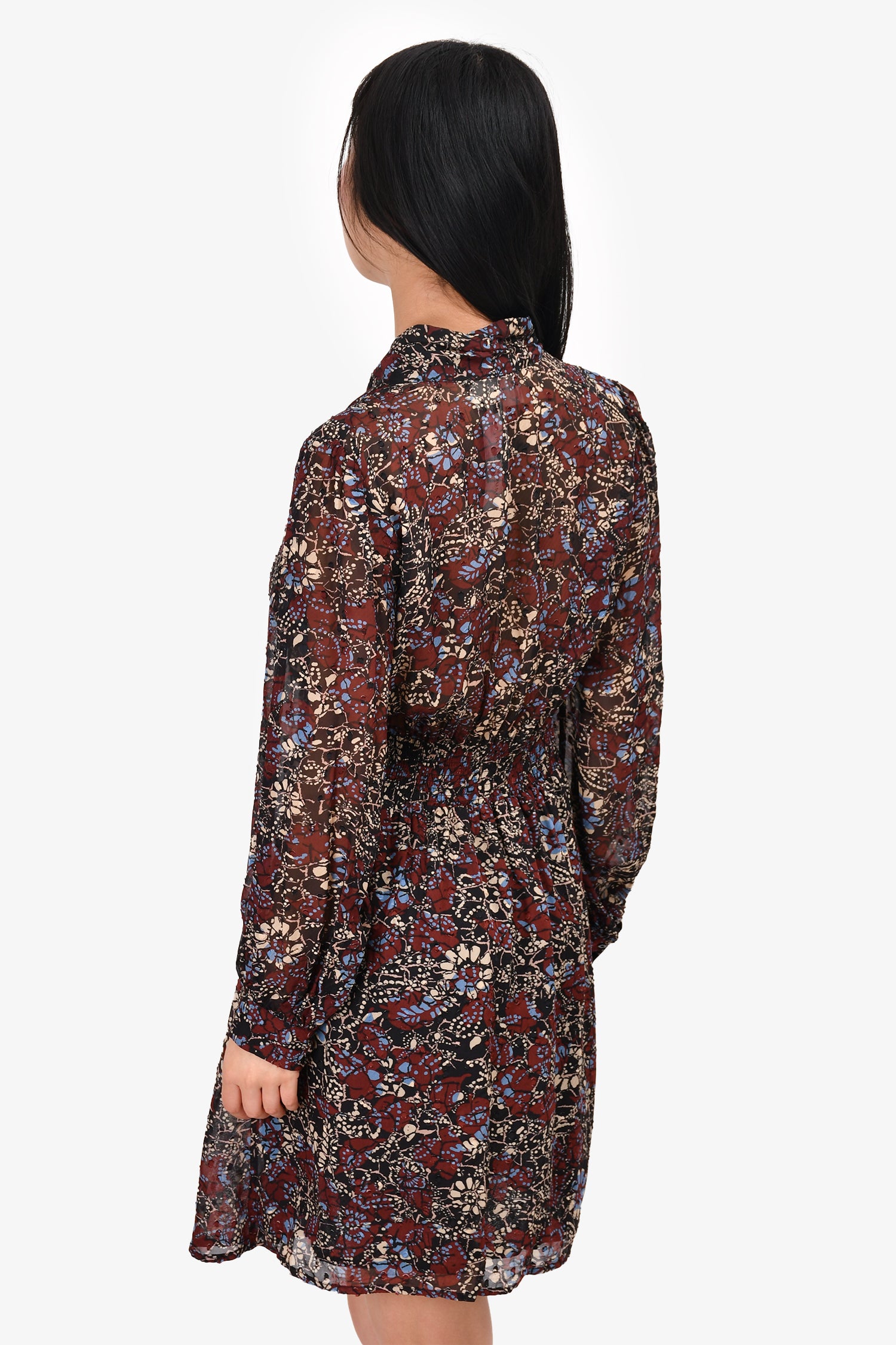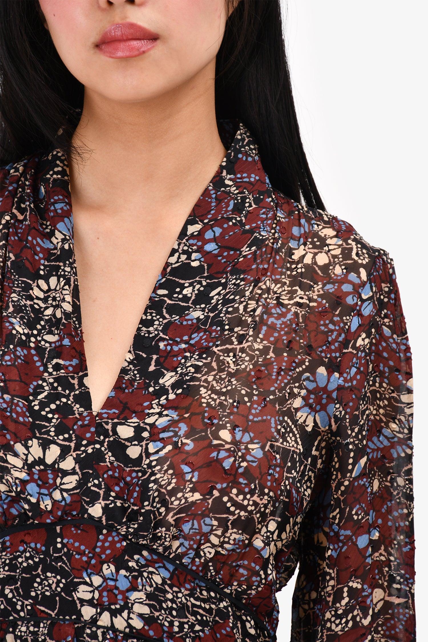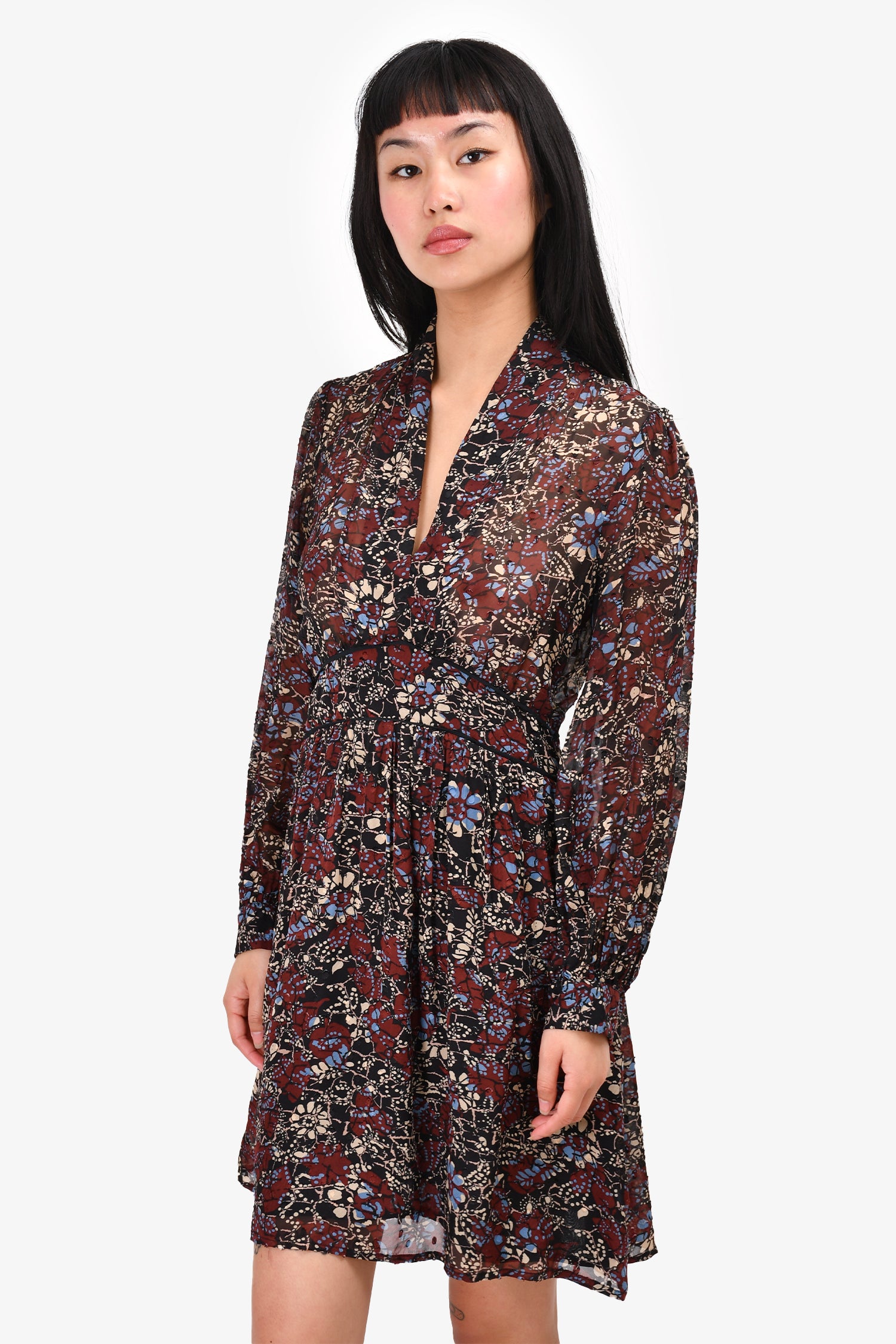 Refresh availabilityBa&sh Black/Maroon Floral Mini Dress. V-neck. Pull-on. Button closure on the cuffs. Half-lined.