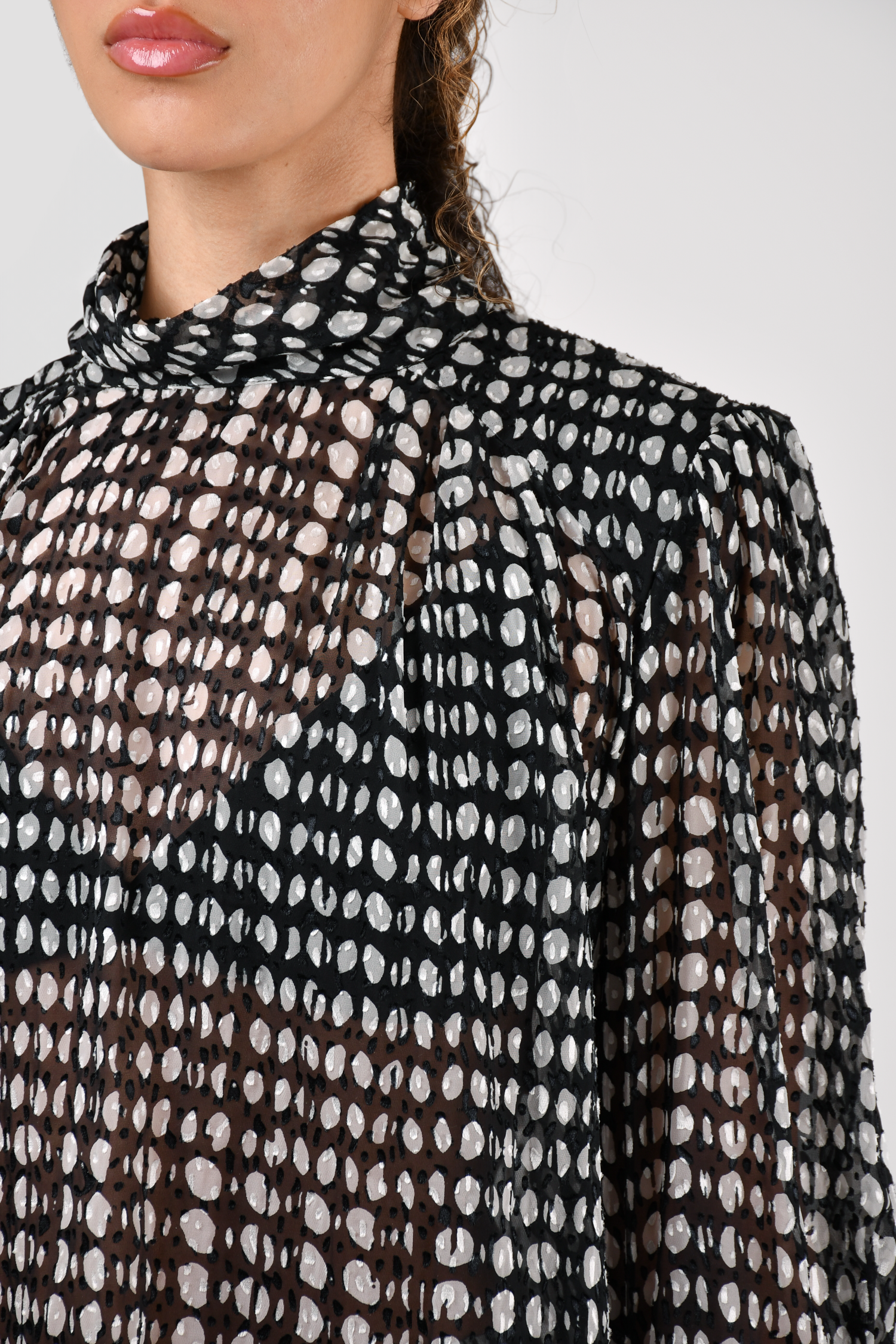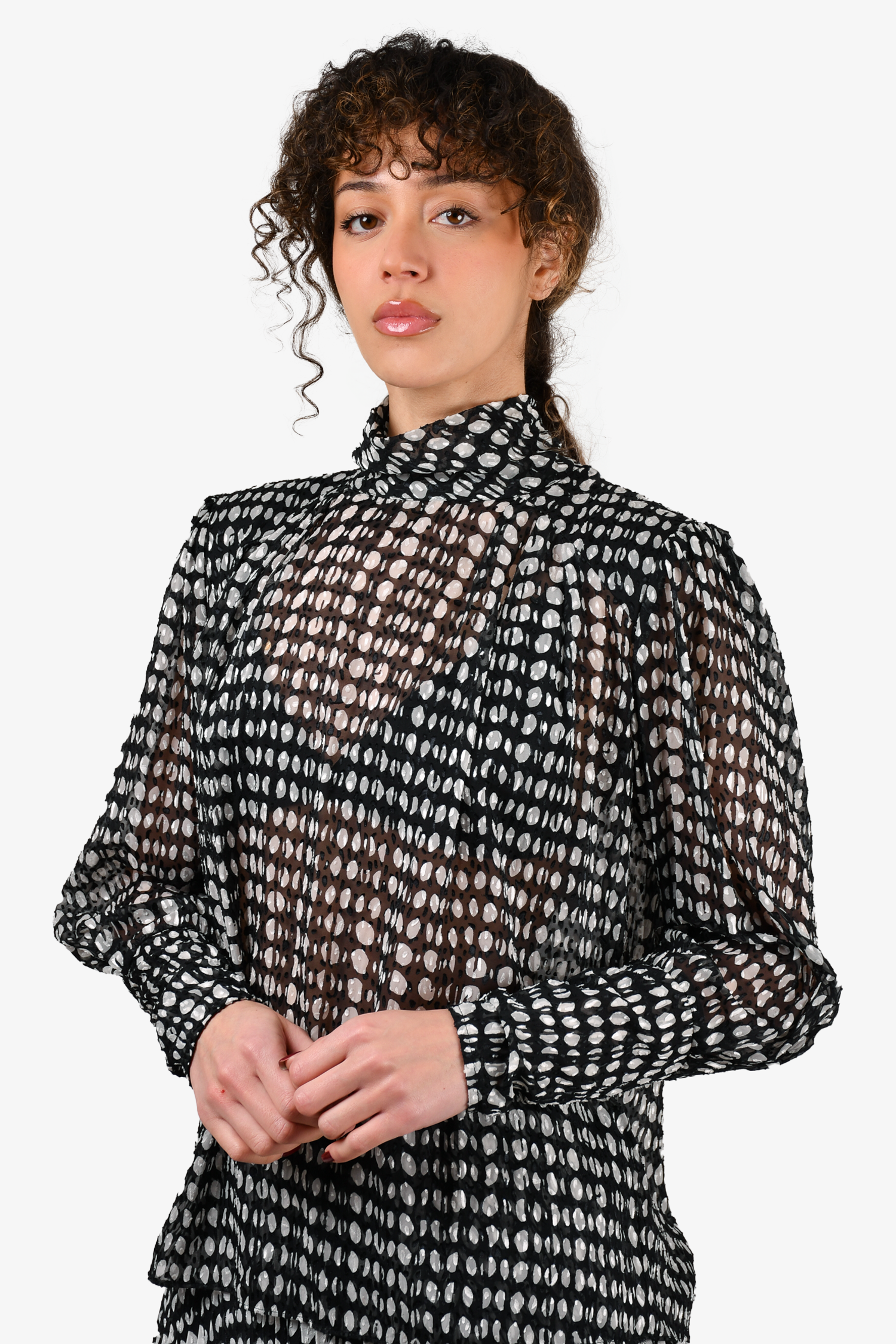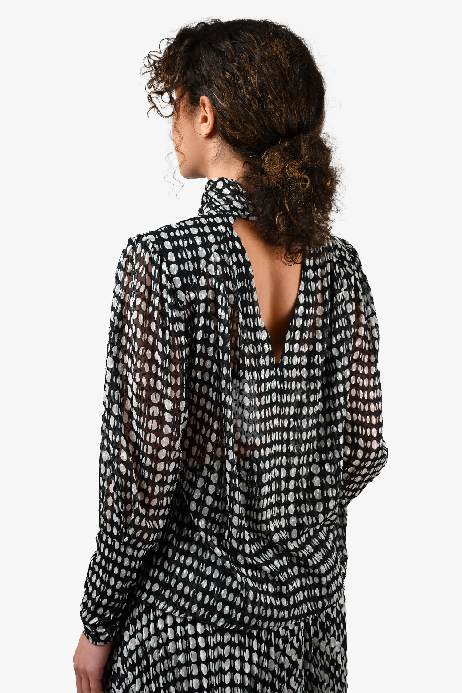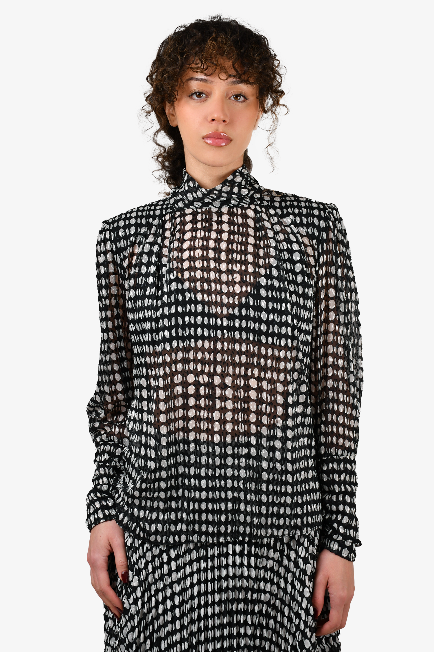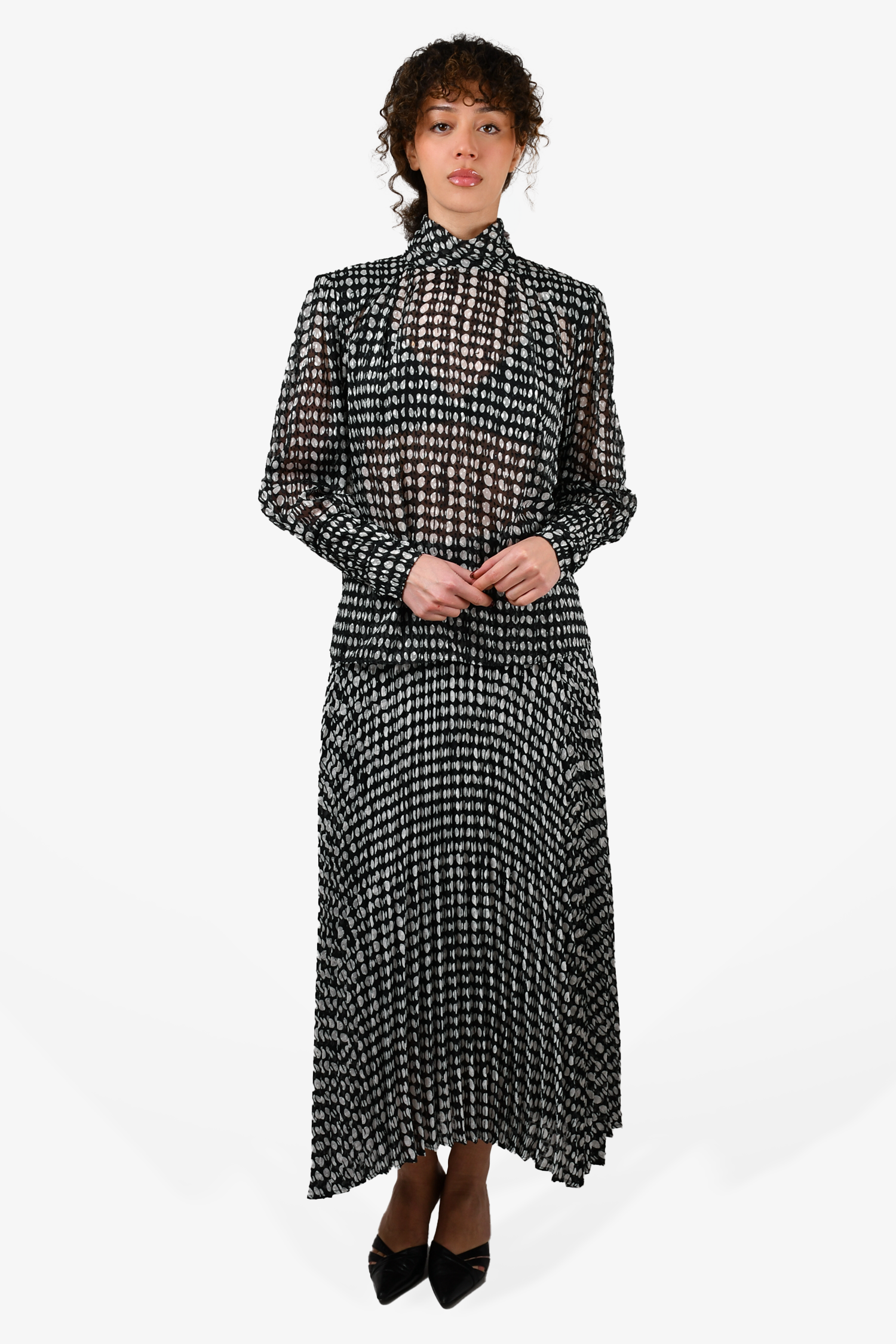 Refresh availabilityBa&sh Black/White Polka Dot Sheer Blouse + Pleated Midi Skirt. Blouse: Button closure on the neckline. Padded shoulders. Skirt: Side zip and hook closure. Elasticized waist. Lined. Tonal stitching.
