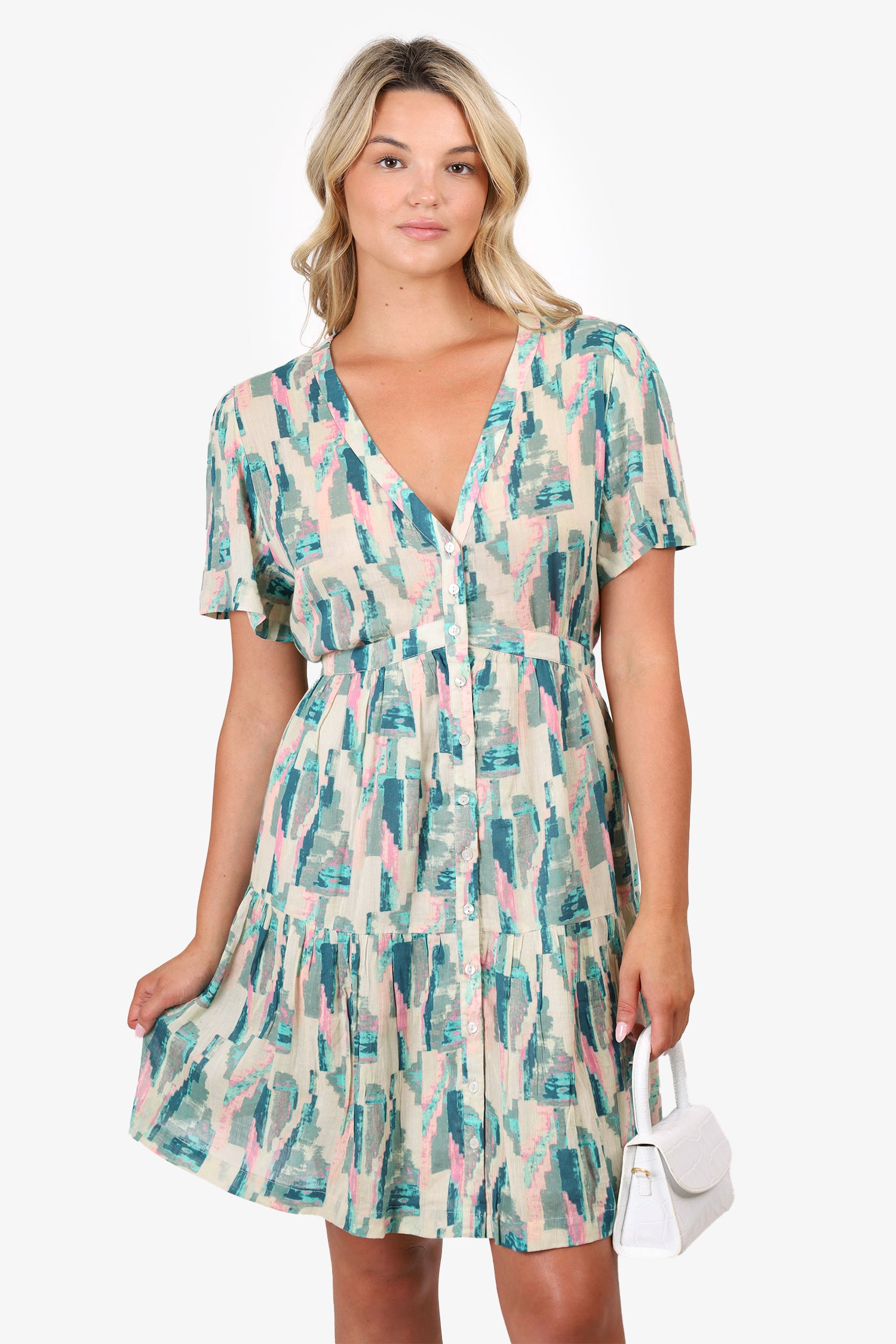 Refresh availabilityBa&sh Blue/Pink Pattern Short Sleeve Button-Up Dress. V-neck with button-down closure. Lined. Tonal stitching.