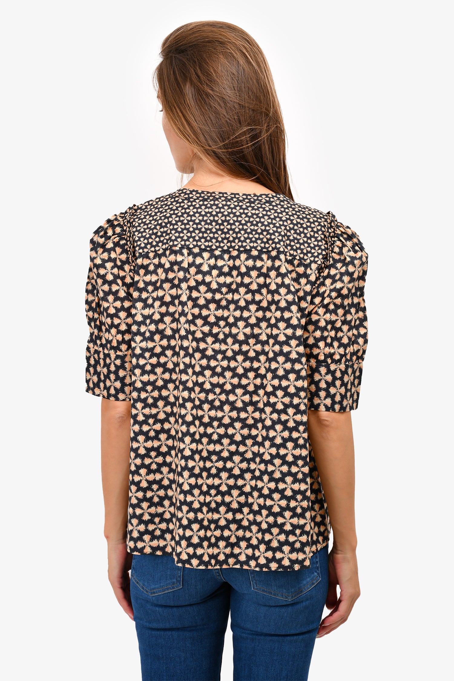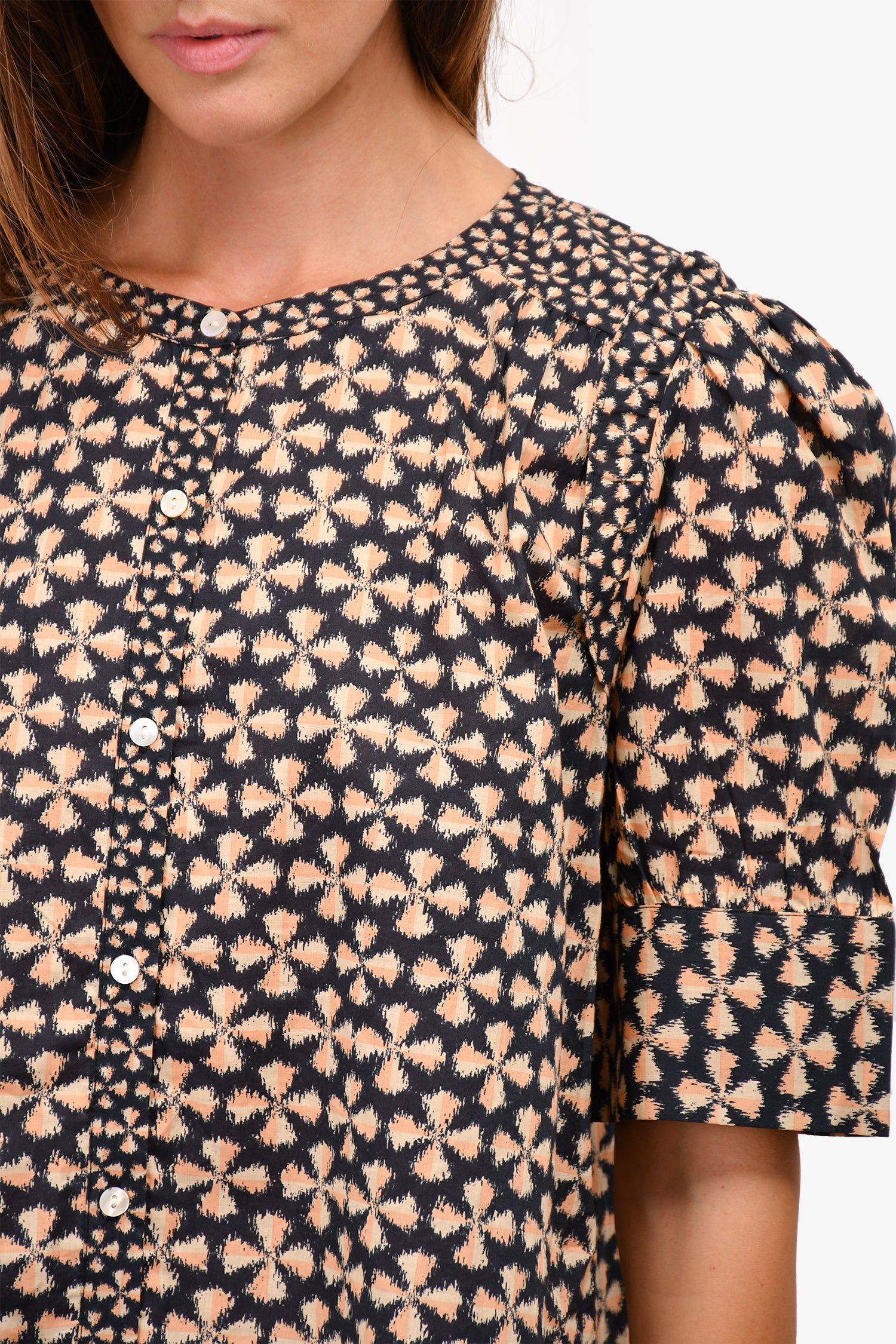 Refresh availabilityBa&Sh Brown/Black Patterned Top. Round collar. Front Button-up closure. Tonal stitching.