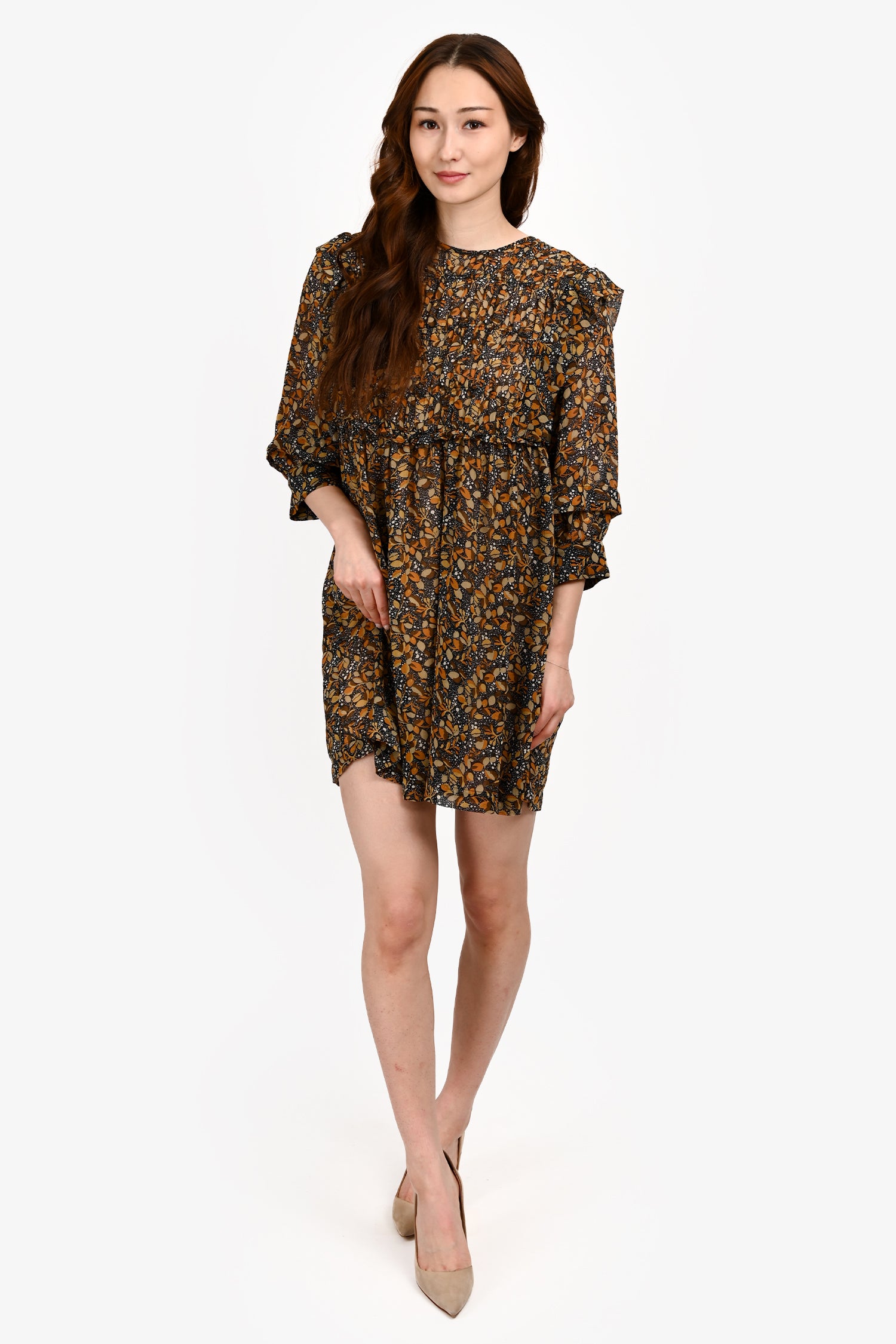 Refresh availabilityBa&sh Brown/Orange Printed Puff Sleeve Mini Dress. Pull-on. Round neckline. Back-of-neck button closure. Lined interior. Tonal stitching.