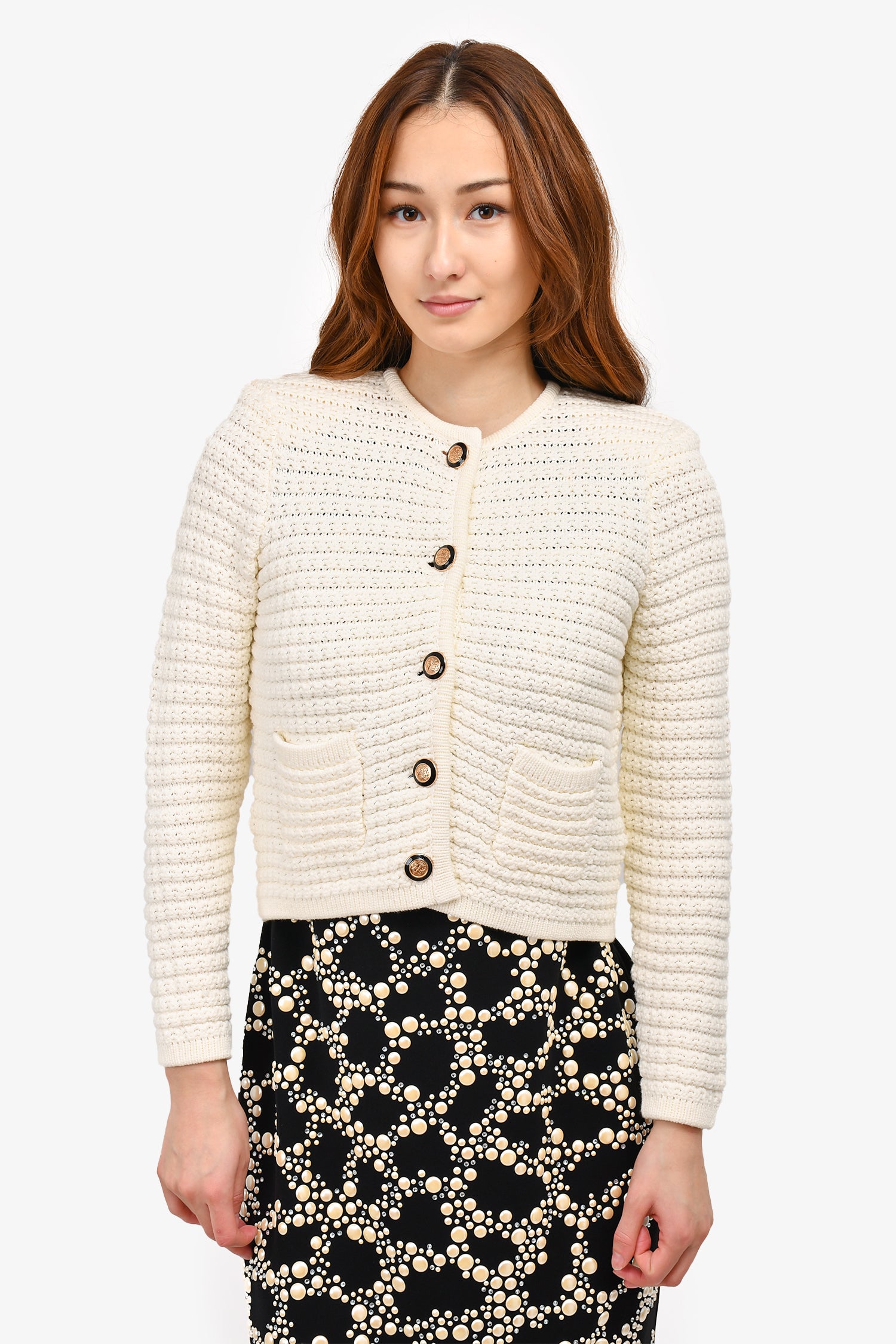 Refresh availabilityBa&Sh Cream Knit Button Down Cardigan. Shoulder pads. Front button-up closure. Gold-tone hardware. Tonal stitching.