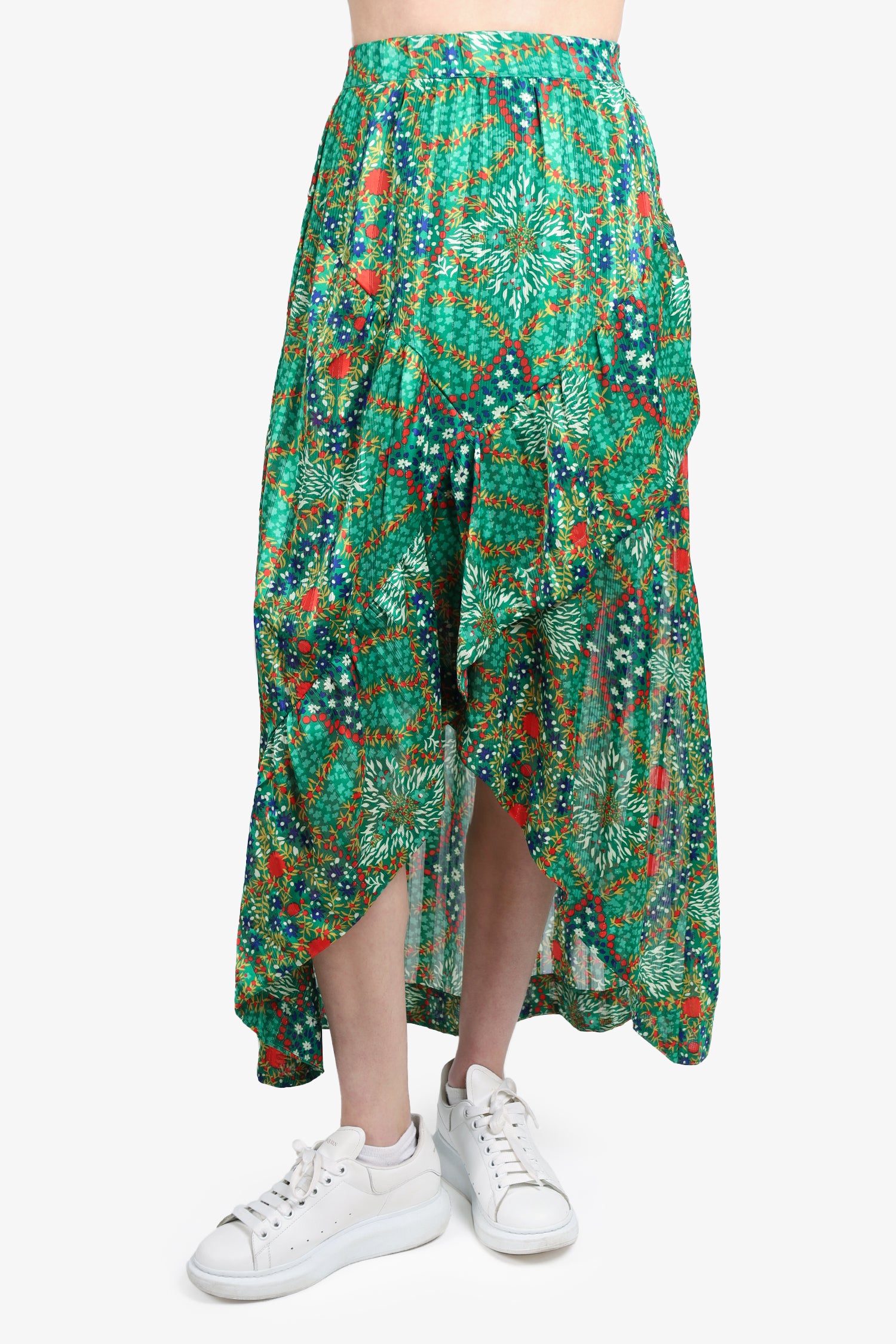 Ba&sh Green Floral Print Ruffle Maxi Dress. Asymmetrical hem. Elasticated band. Tonal stitching.