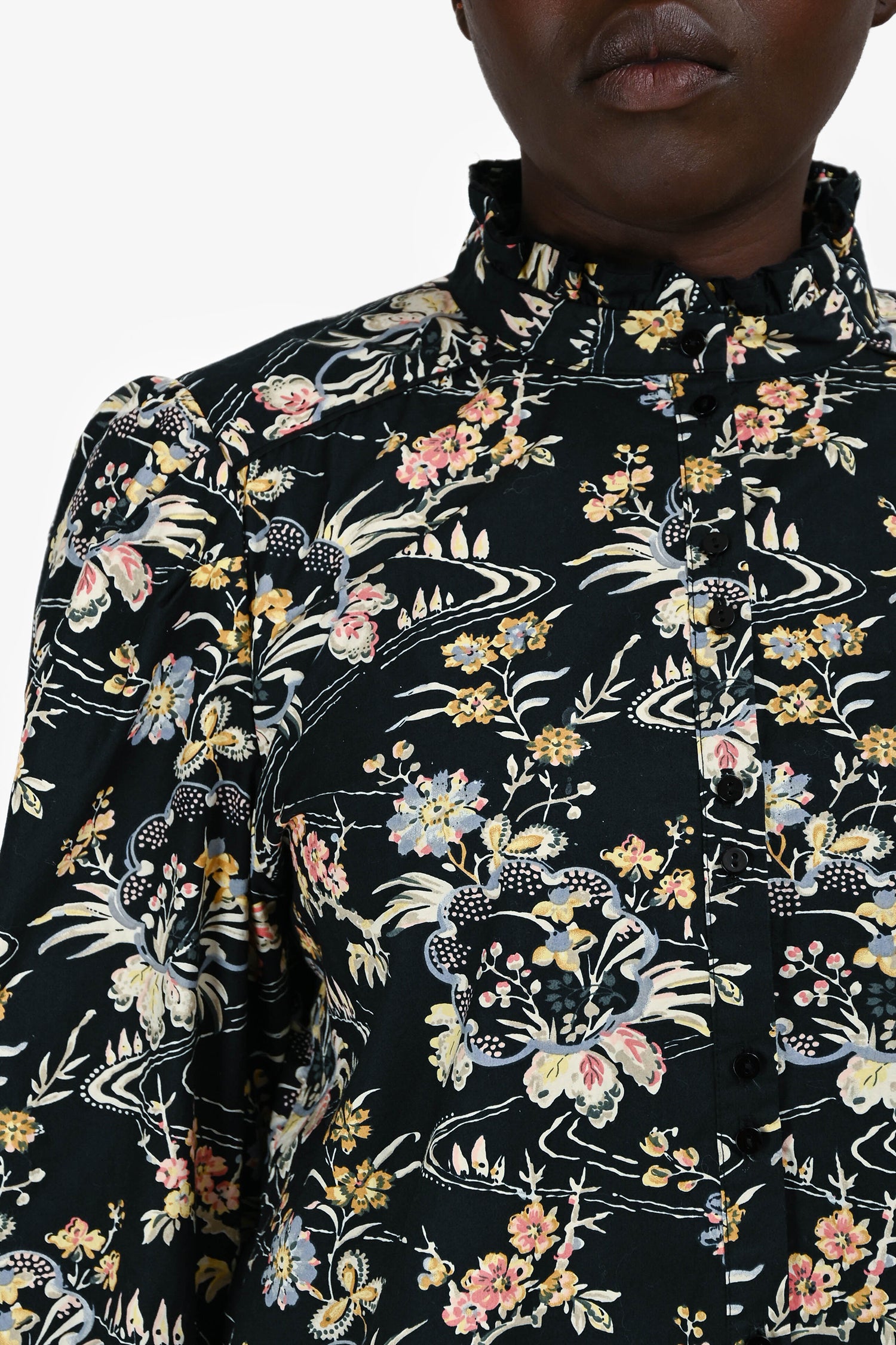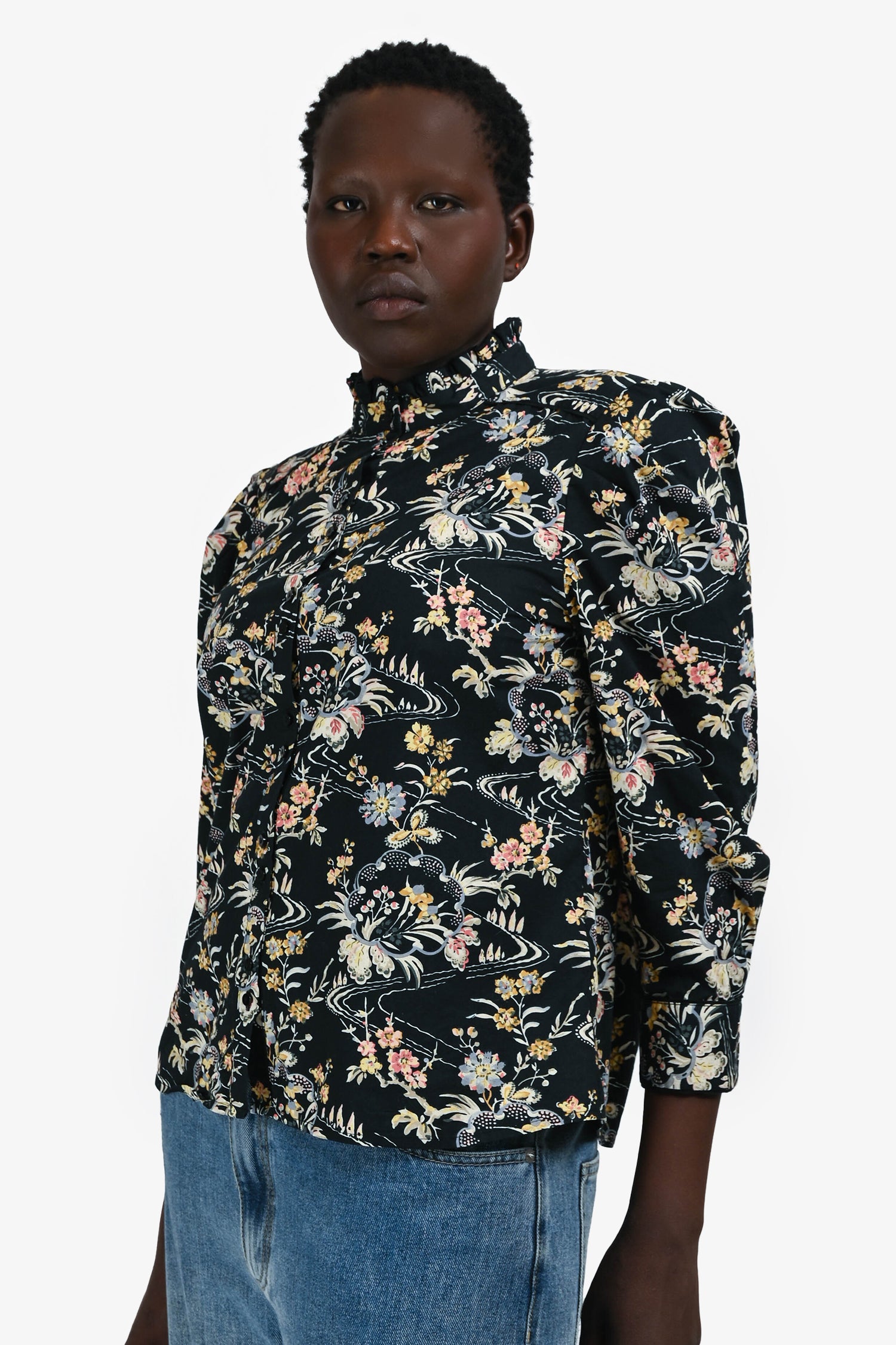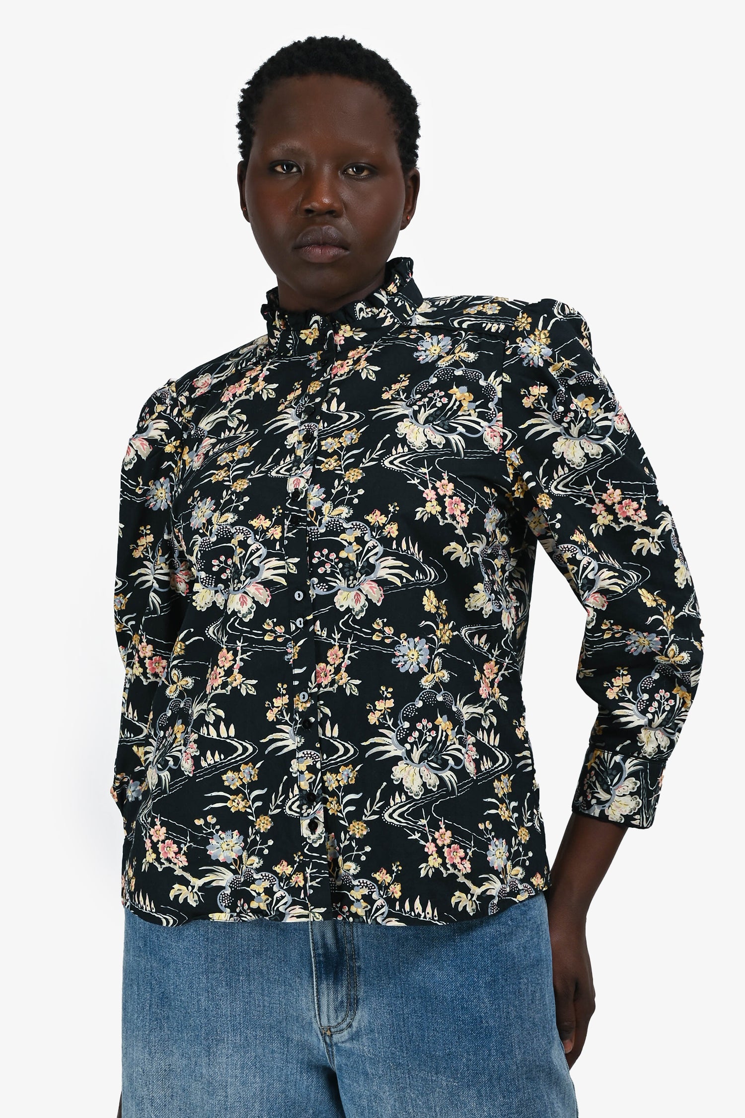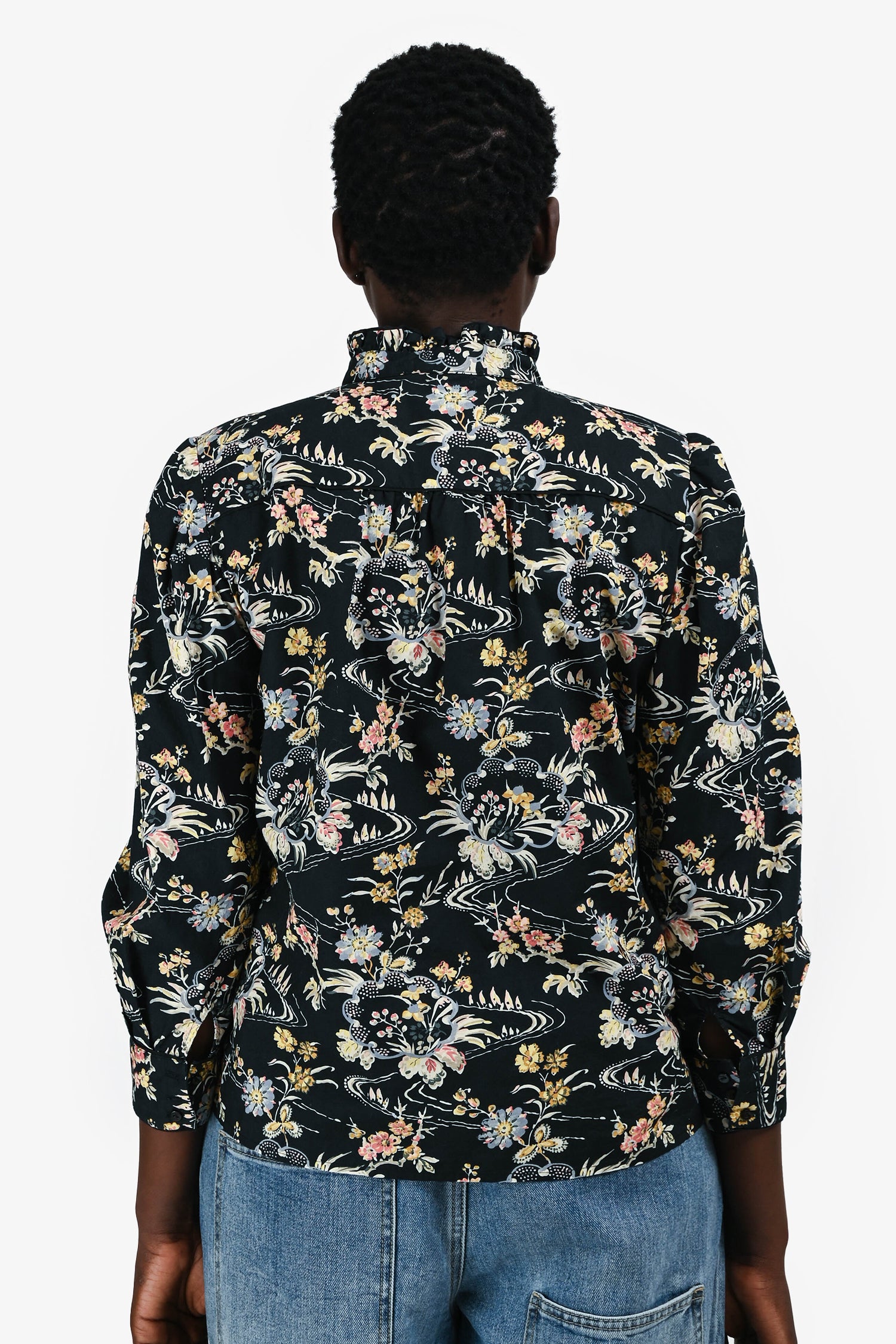Refresh availabilityBa&sh Navy Blue/Cream Floral Ruffle Button-Up Blouse. Round neckline with ruffle trim. Long sleeves with buttoned cuffs. Button-up front closure. Tonal stitching.