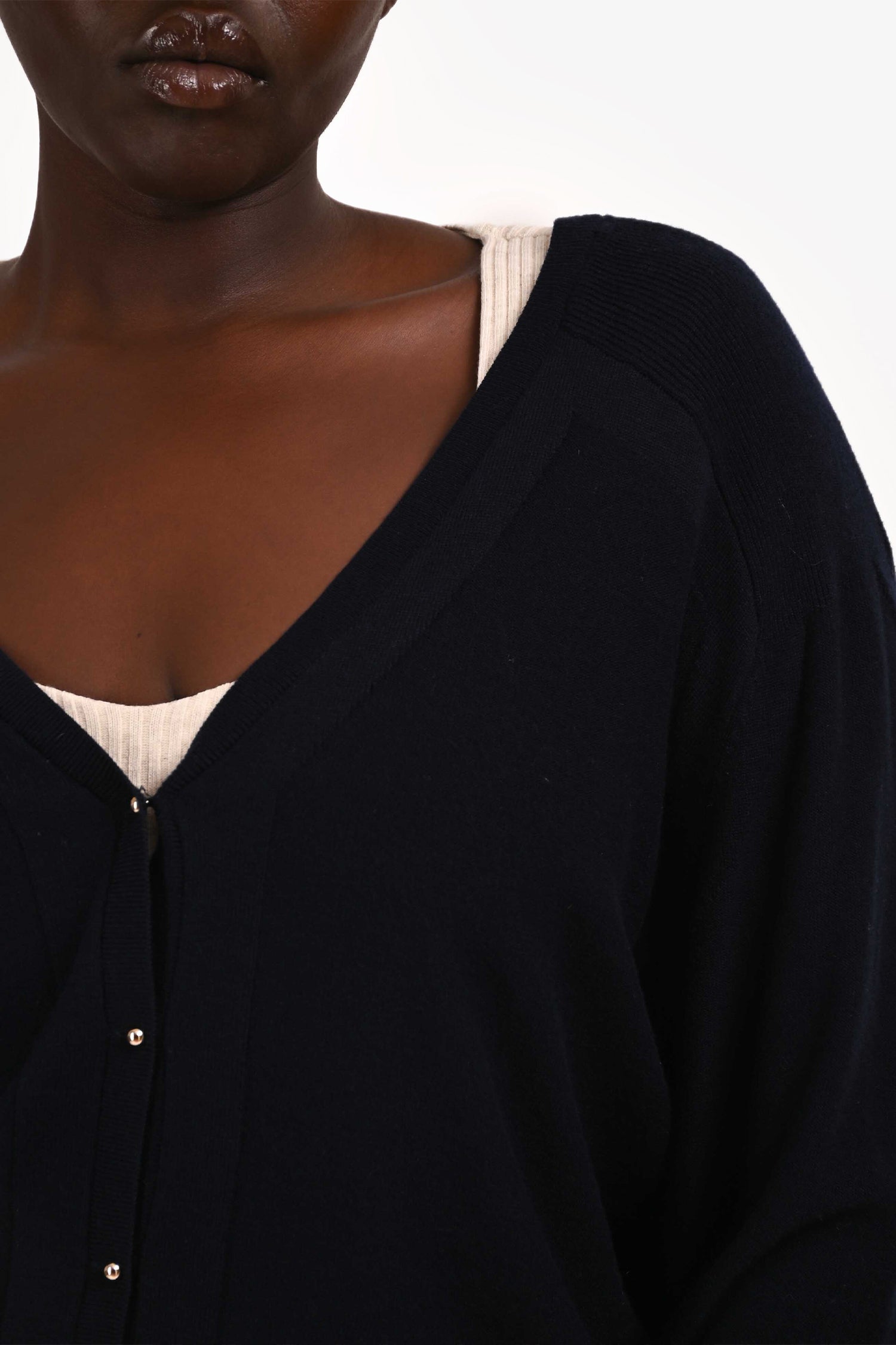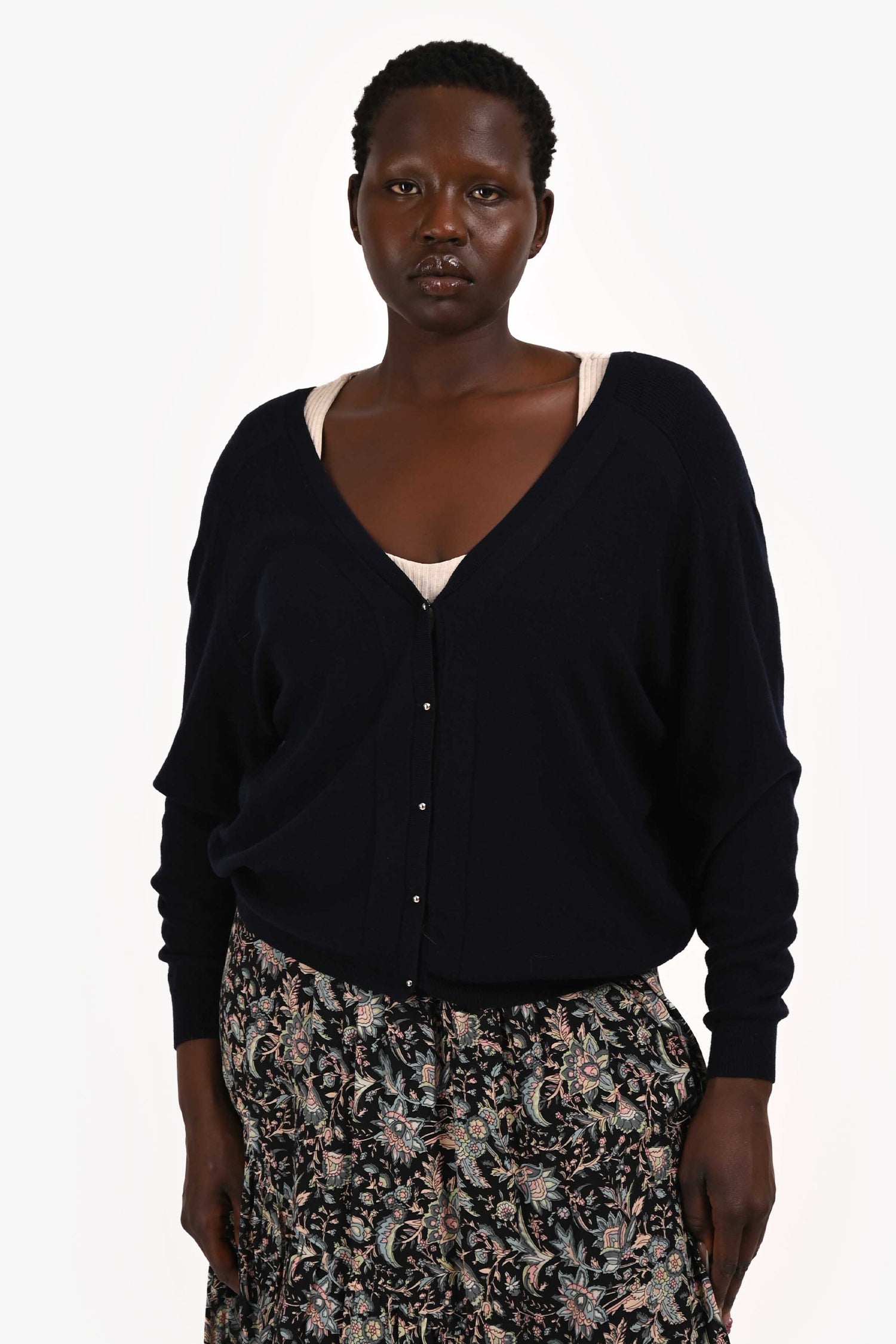 Refresh availabilityBa&sh Navy Wool Blend Cardigan. V-neckline. Front button closure. Long sleeves. Ribbed cuffs and hem. Tonal stitching.