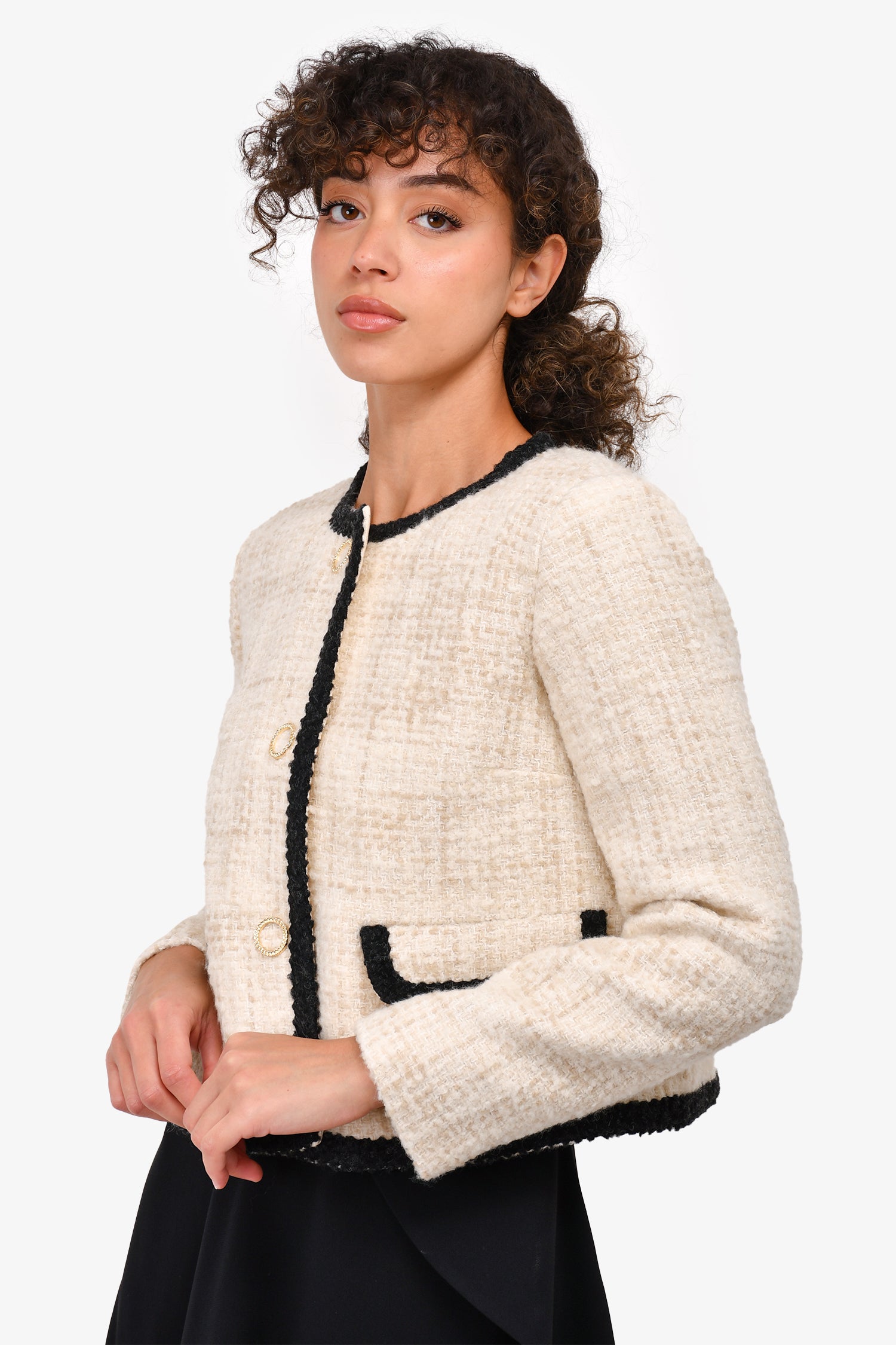 Refresh availabilityBa&sh White/Black Boucle Evening Jacket. Front snap button closure. Gold-tone hardware. Front decorative pockets. Lined. Tonal stitching.