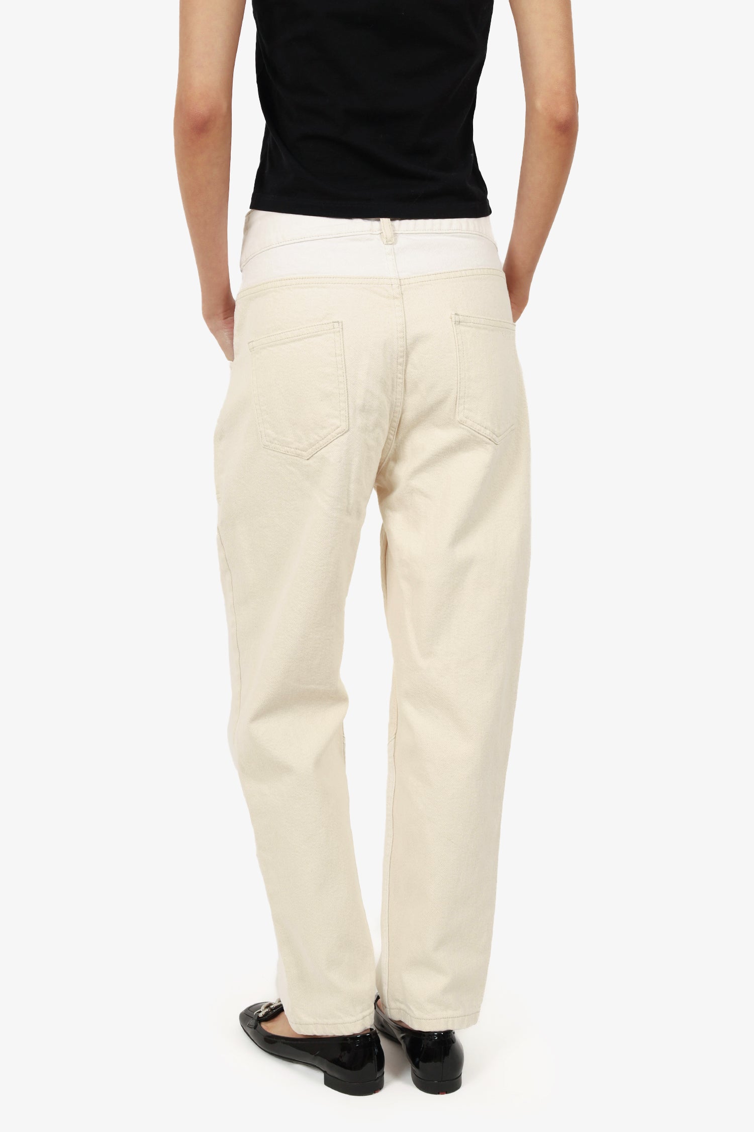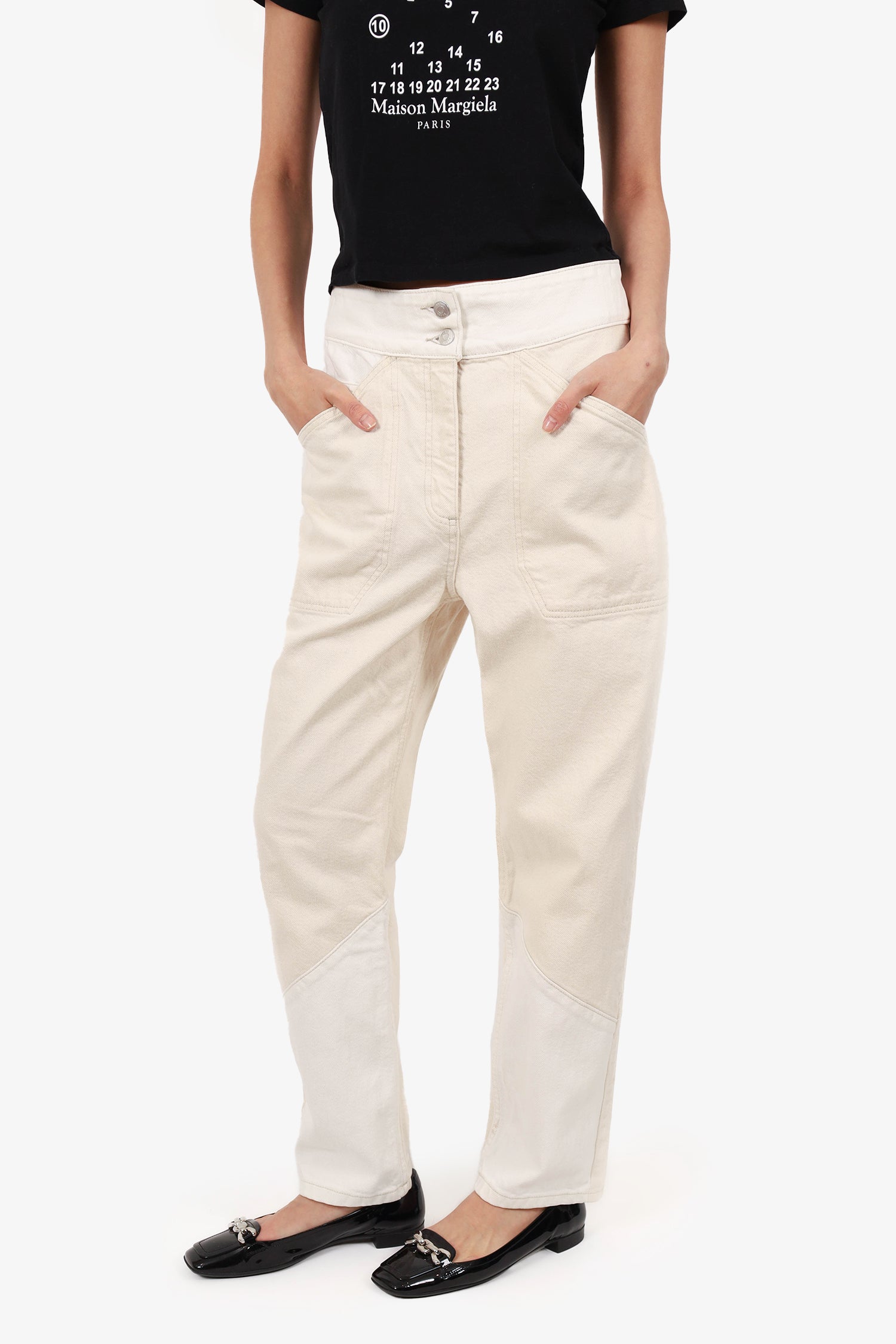 Refresh availabilityBa&sh White/Cream Denim Patch Jeans. Front zip with double button closure. 2 front and 2 rear slip pockets. Belt loops along waistline. Silver-tone hardware. Unlined. Tonal stitching.