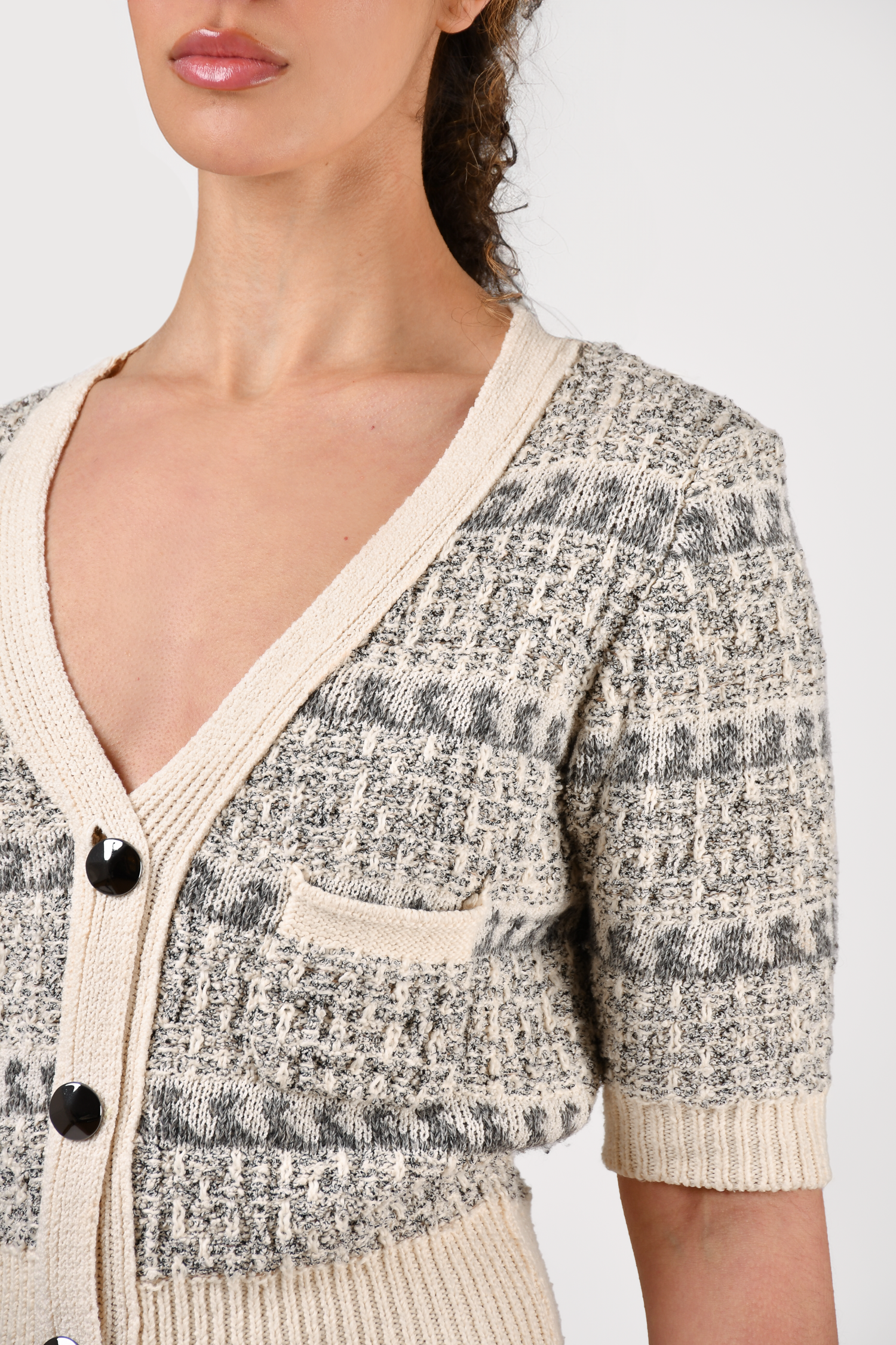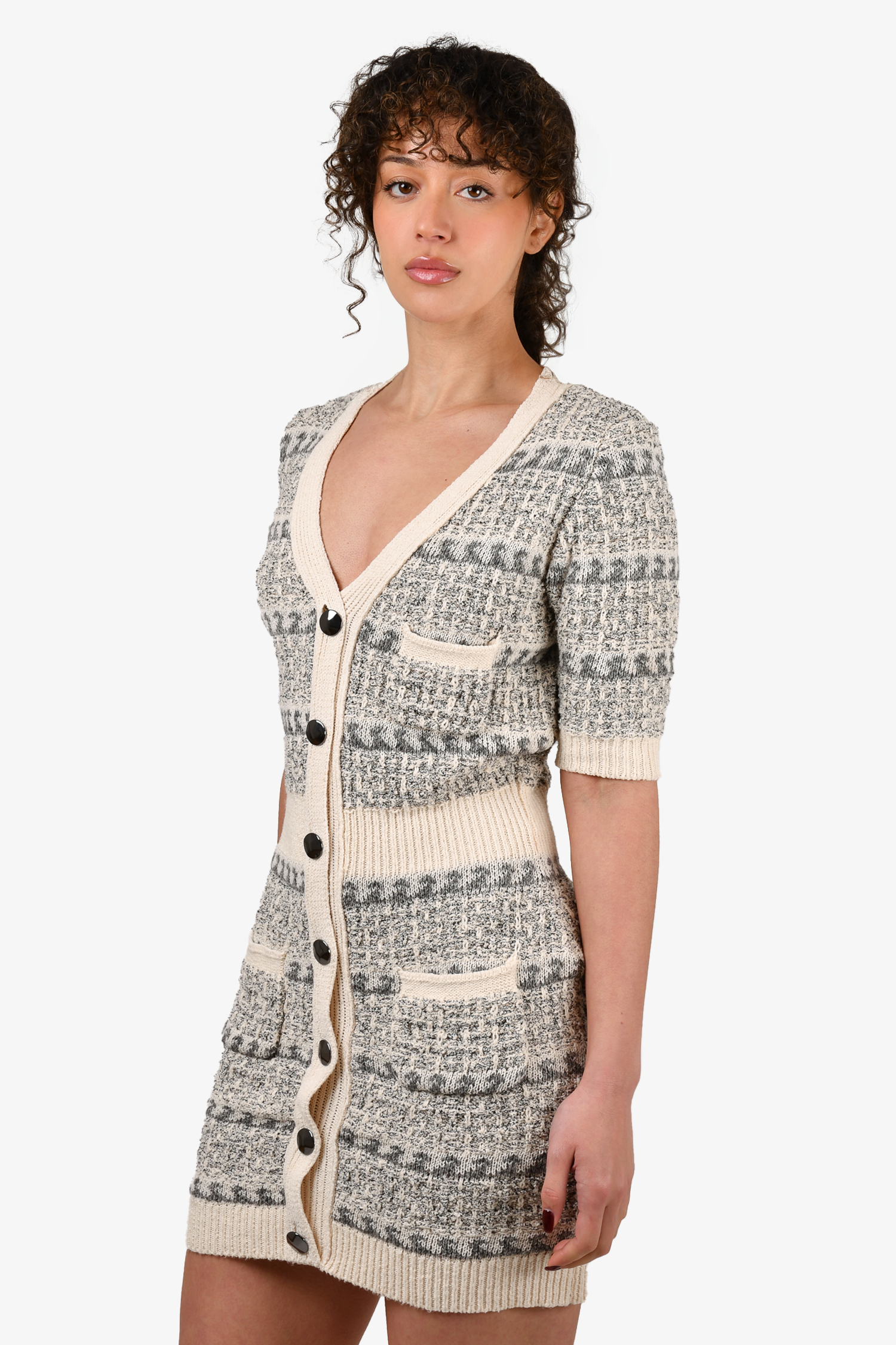 Ba&sh White/Grey Knitted Dress. V-neck. Front button-up closure. Front pockets. Unlined. Tonal stitching.