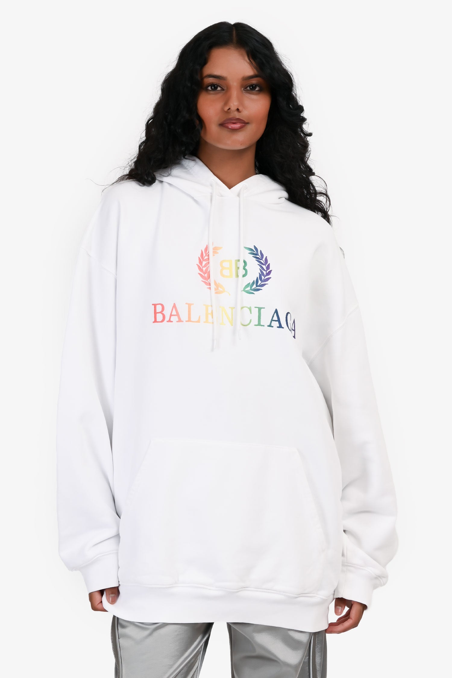Refresh availabilityBalenciaga 2018 White/Rainbow Embroidered Logo Hoodie. Drawstring hood. Long sleeves. Kangaroo pocket. Ribbed cuffs and hem. Pull-on style. Tonal stitching.