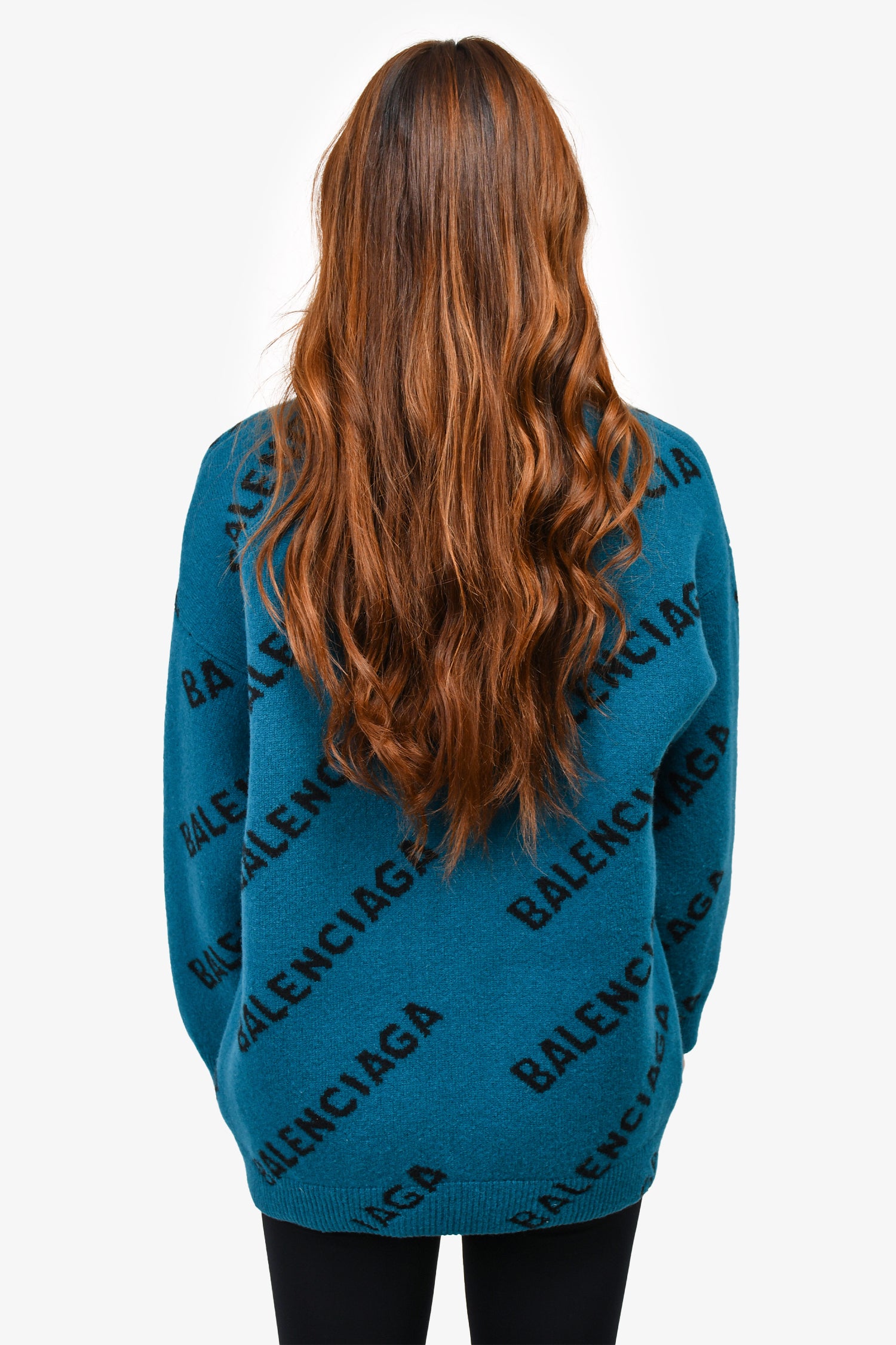 Refresh availabilityBalenciaga 2021 Teal Wool Monogram Sweater. Contrast black interior. 'Balenciaga' logo motif throughout.