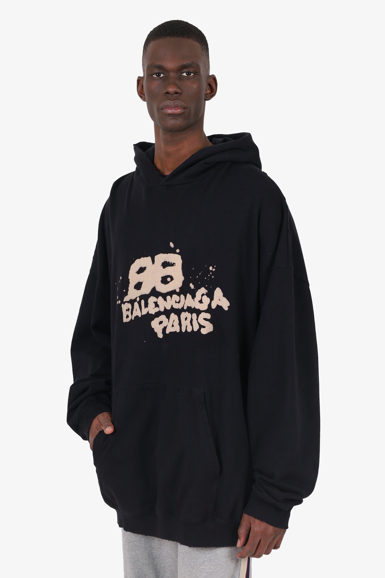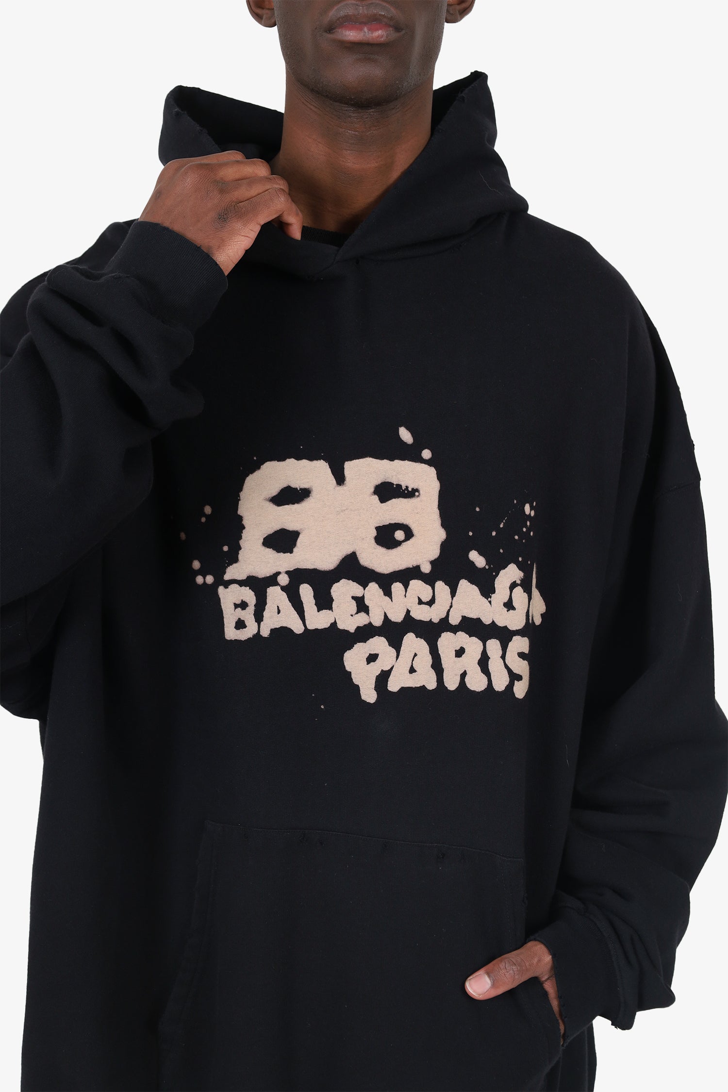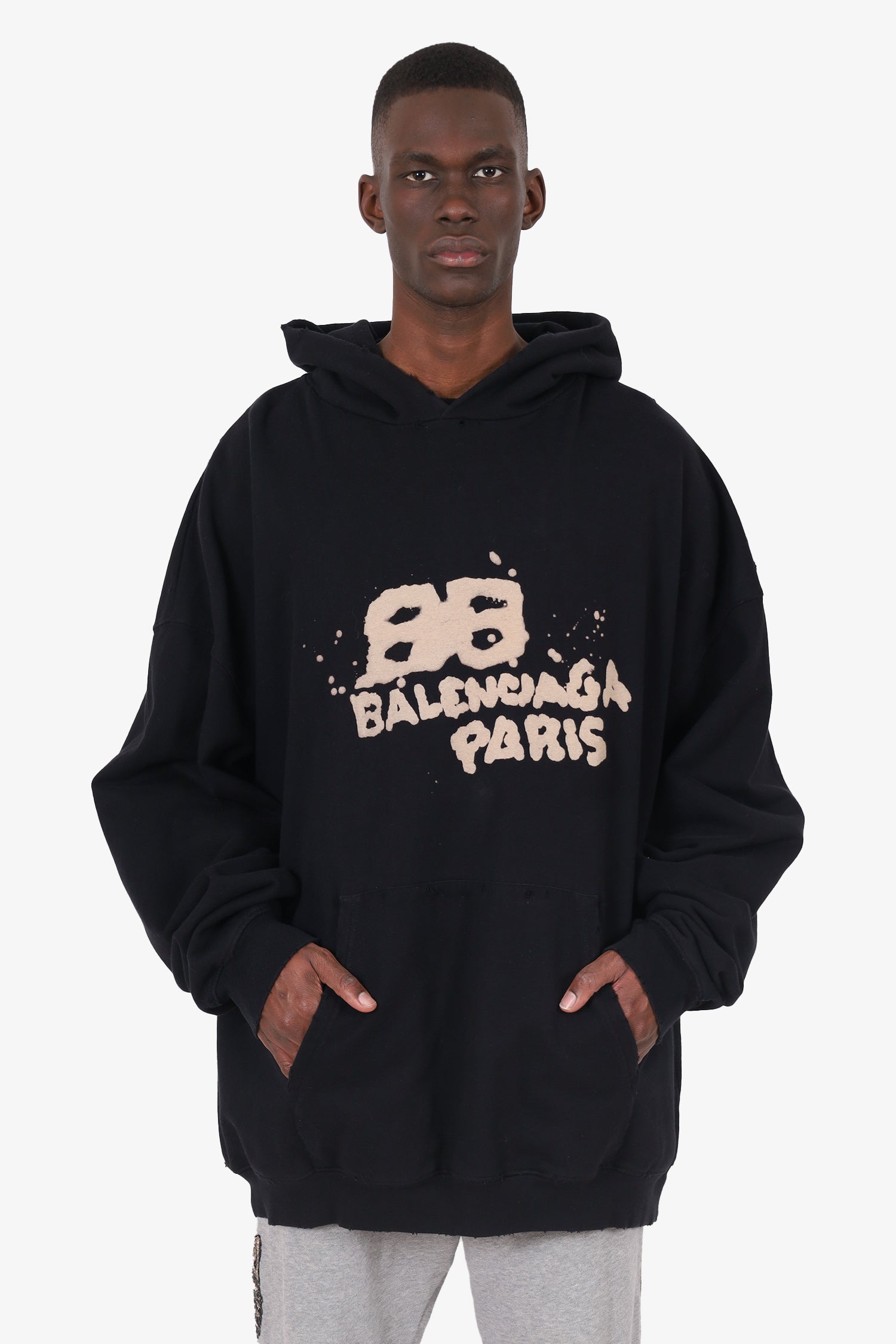Refresh availabilityBalenciaga 2022 Black Logo Distressed Hoodie. Front slip pocket. Distressed design throughout.