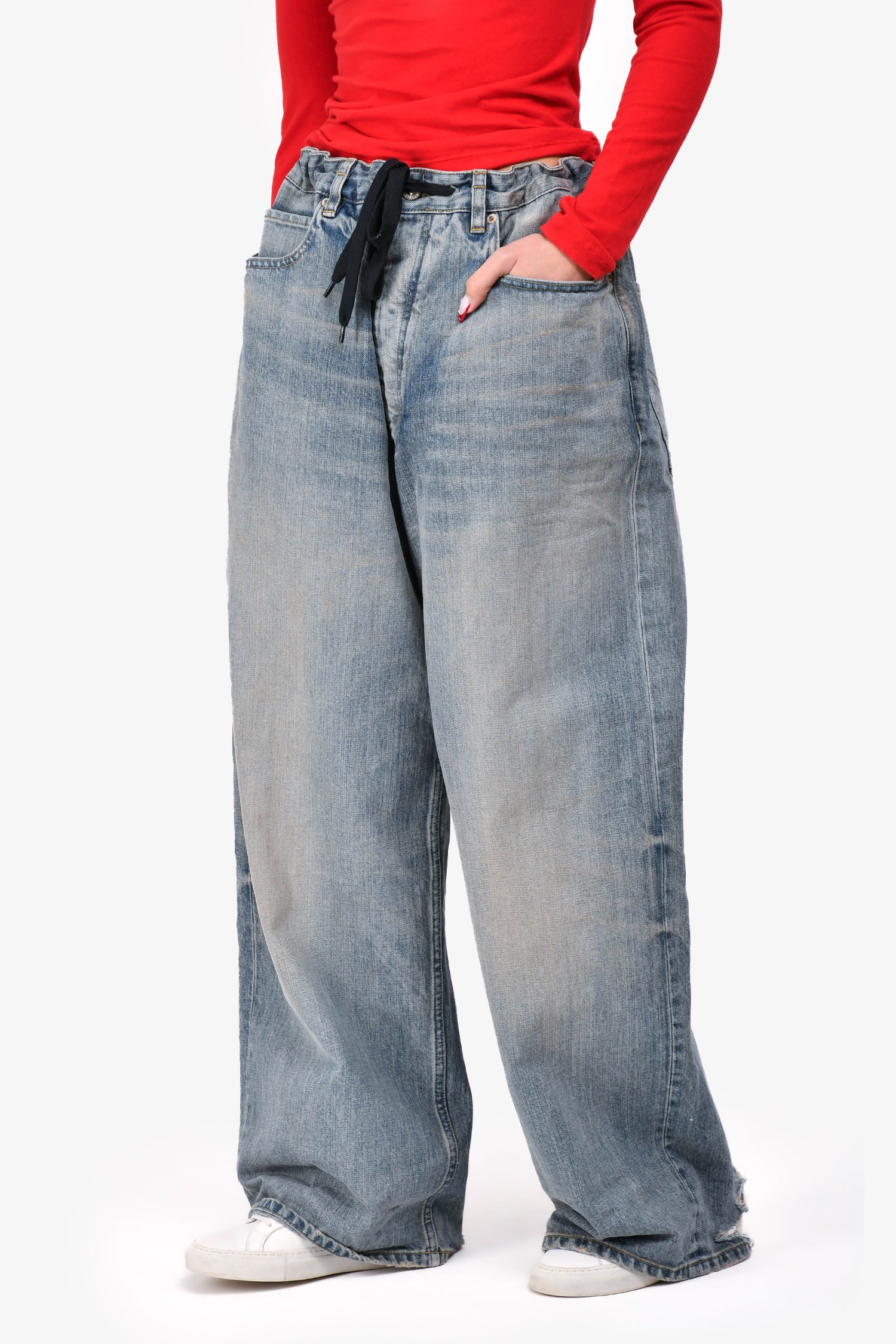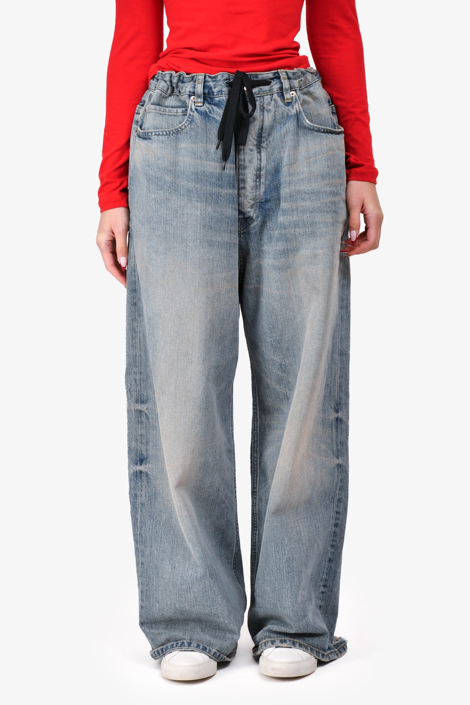 Refresh availabilityBalenciaga 2023 Blue Washed Denim Oversized Wide Legged Jeans. Pull-on. Front button-up closure with drawstring at waist. 5 Pocket design. Silver-tone hardware. Intentional pant leg distressing. Tonal stitching.