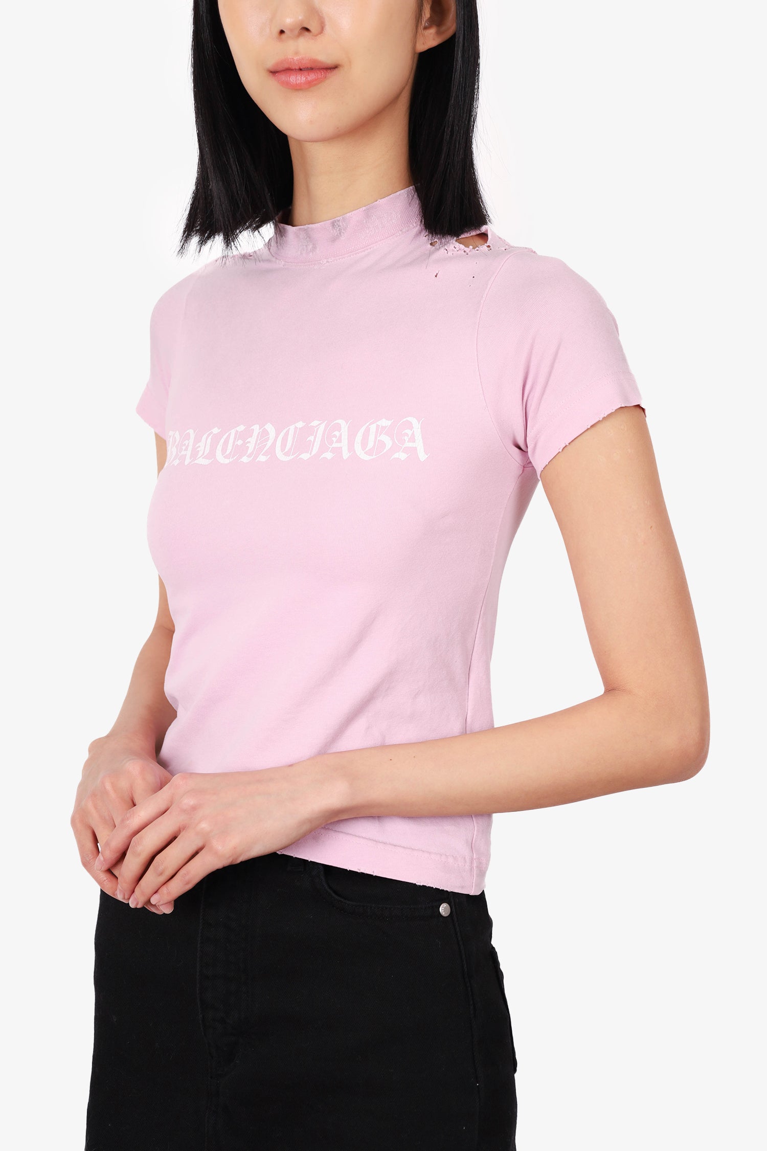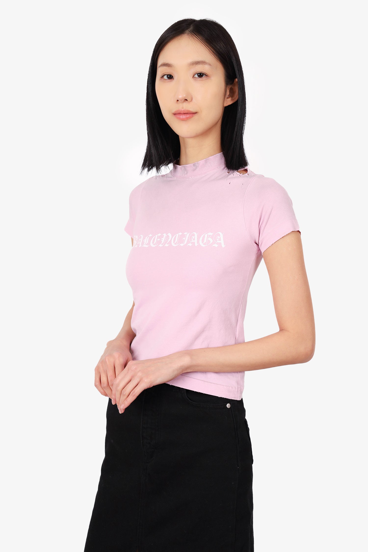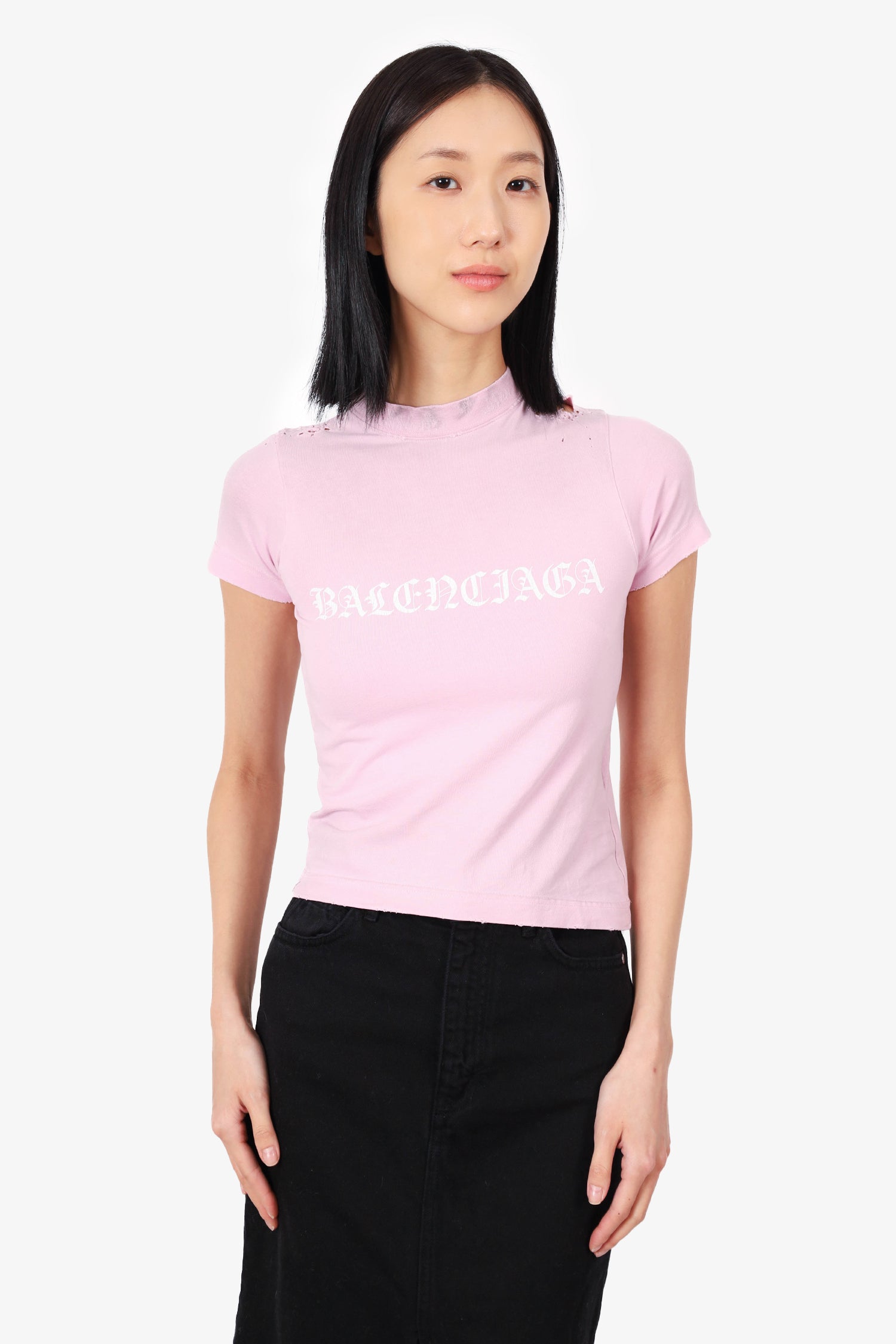 Refresh availabilityBalenciaga Baby Pink Logo Distressed T-Shirt. Crew neckline. Unlined. Tonal stitching.