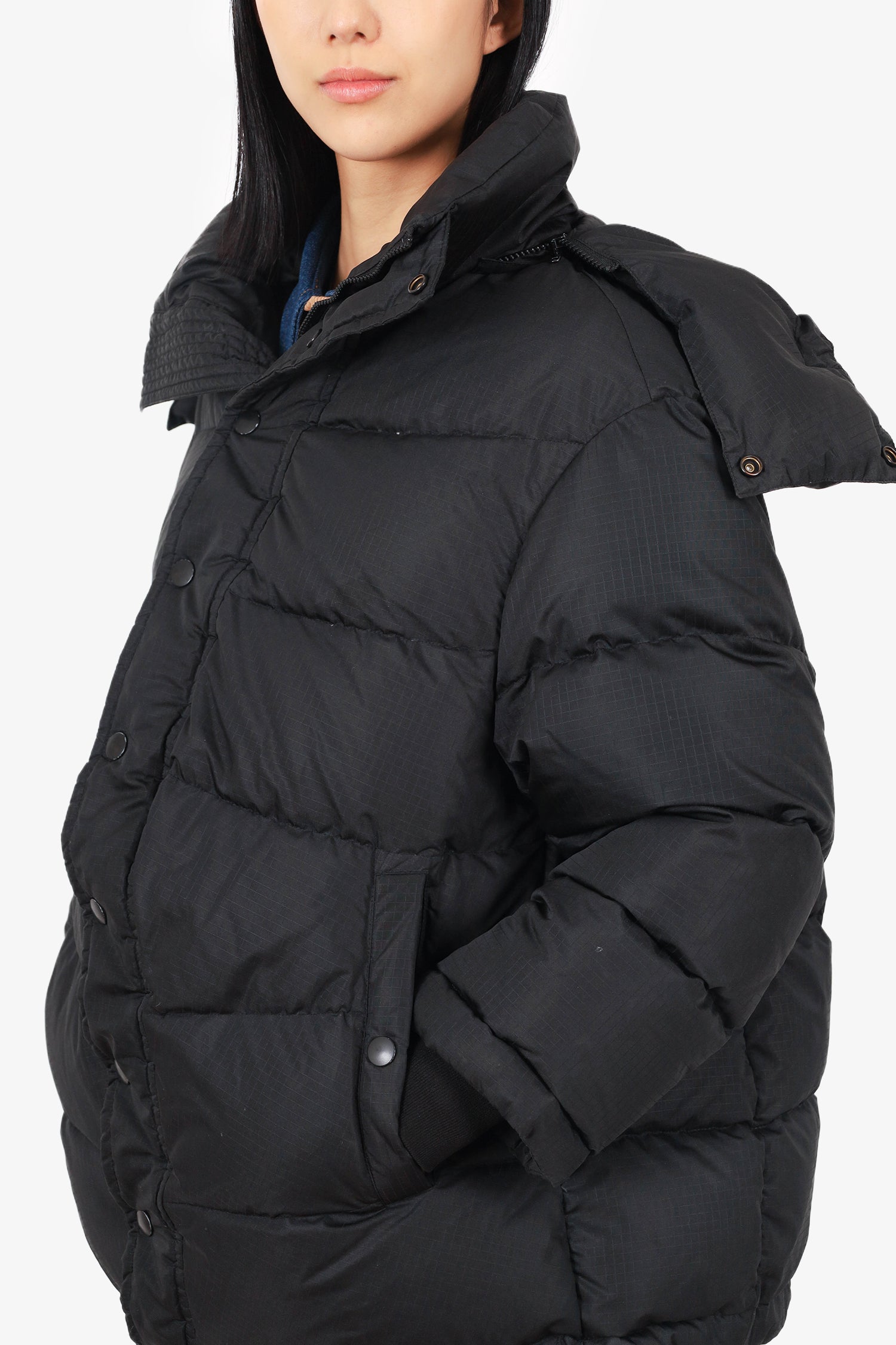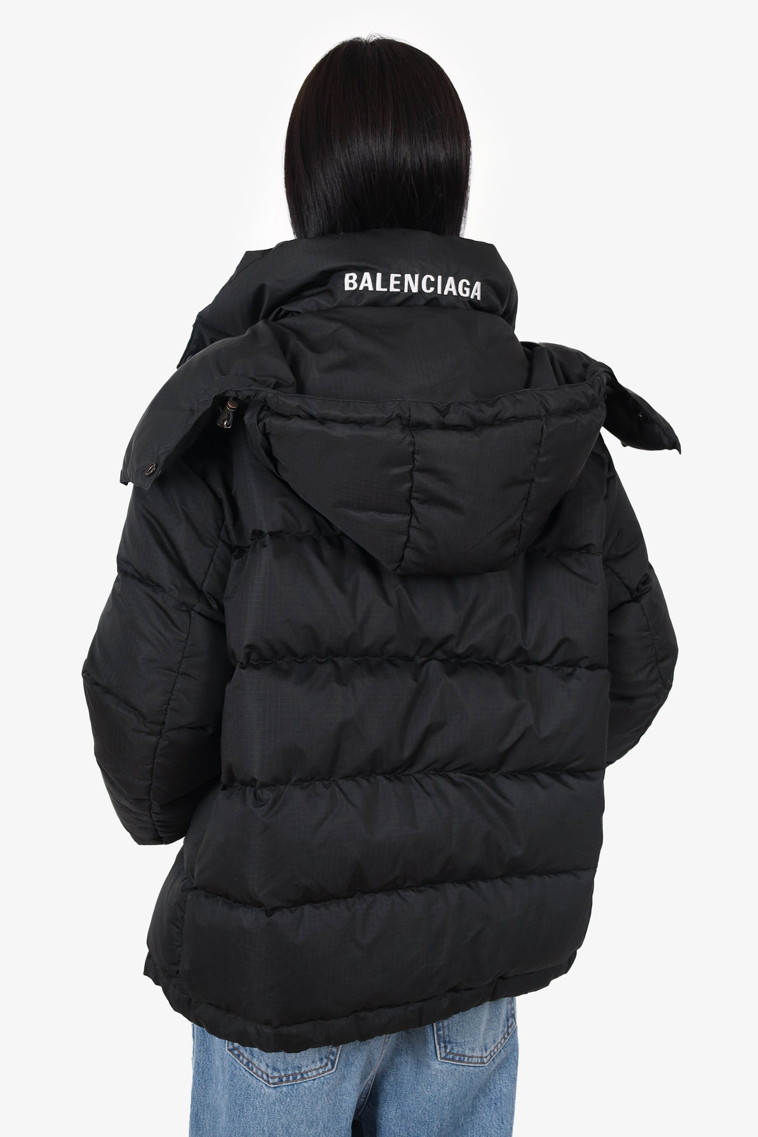 Refresh availabilityBalenciaga Black Archetype Logo Down Jacket. Removable zip hood. Front double-ended zipper with snap button closure overlay. 2 front slip pockets with snap button closure. Pull tabs around waist. Single interior zip closure pocket. Ribbed sleeve cuffs. Lined. Tonal stitching.