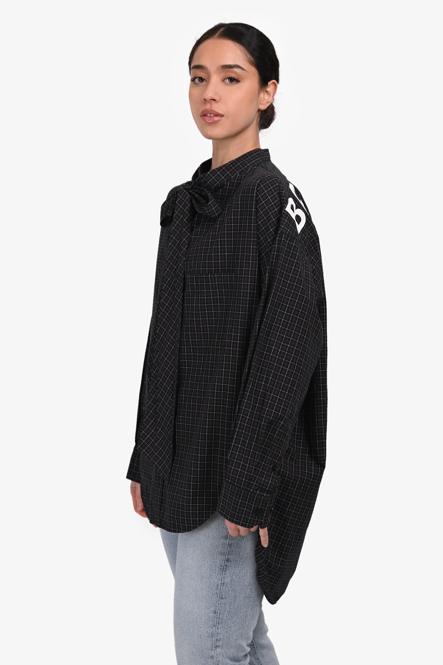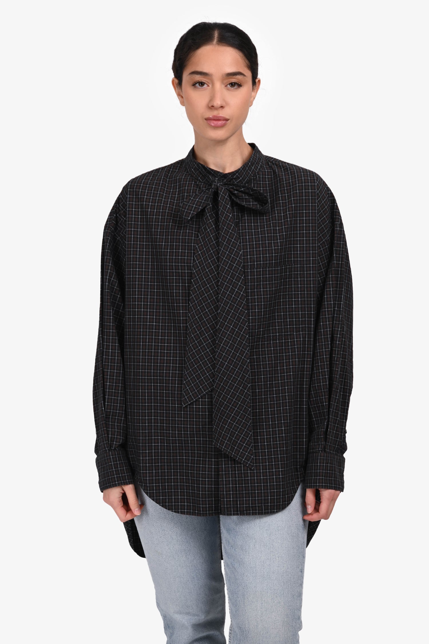 Refresh availabilityBalenciaga Black/Brown Plaid Cotton Button-Up Shirt with Logo Back. Collarless neckline with self-tie detail. Cuffs with button-up closure. Tonal stitching.