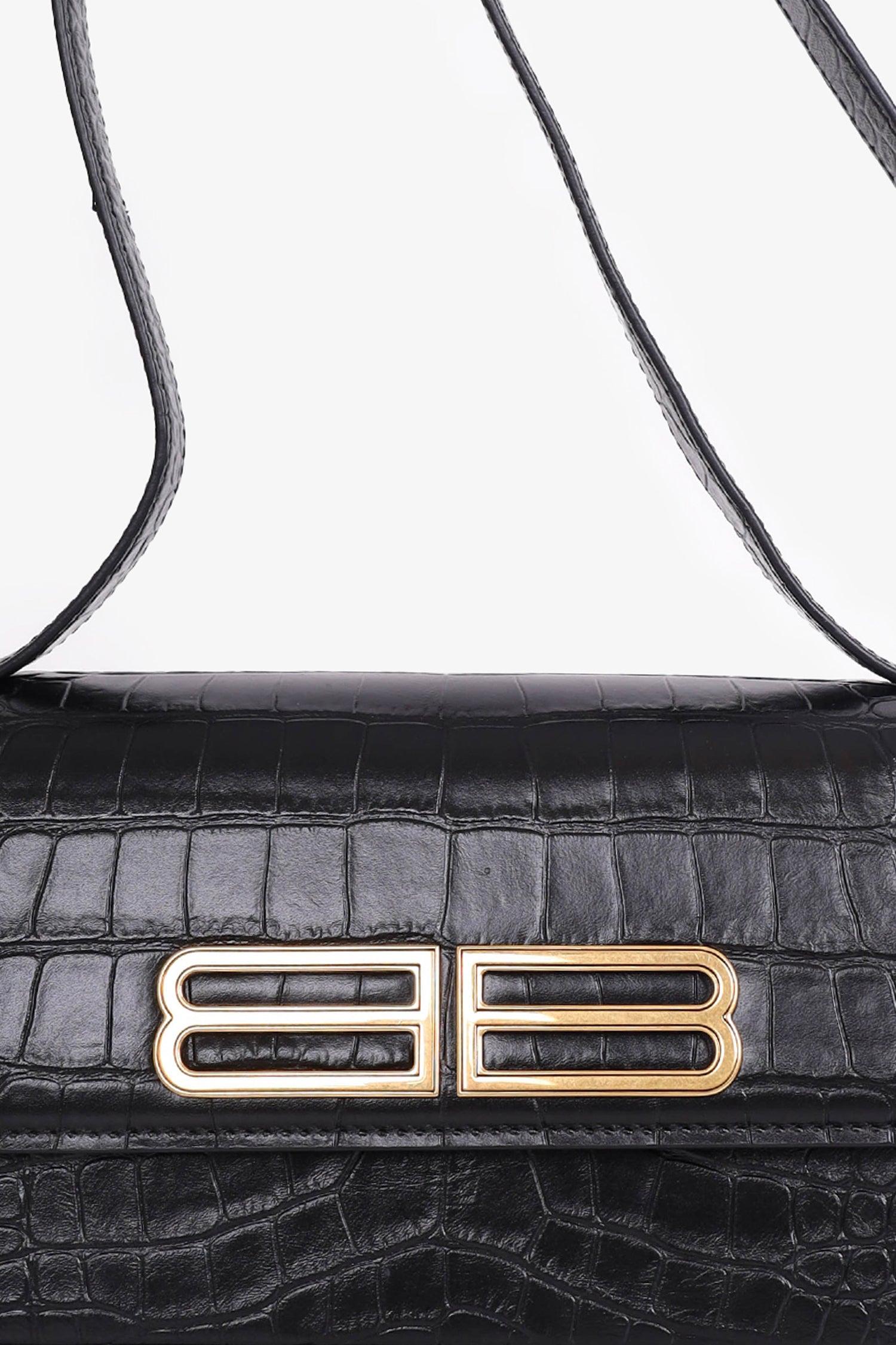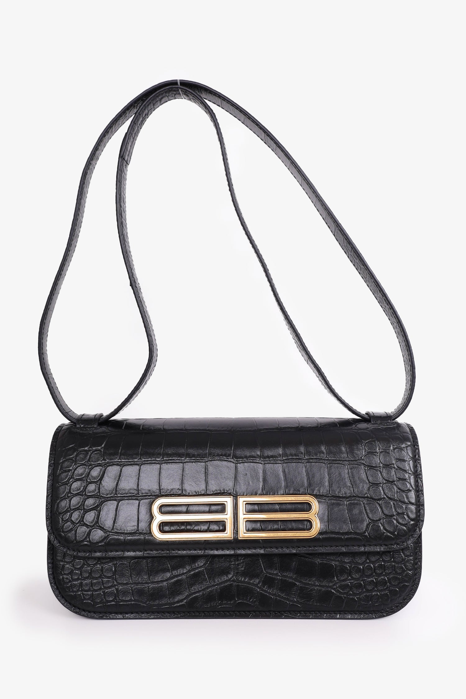 Refresh availabilityBalenciaga Black Calfskin Crocodile Embossed Medium Gossip Bag. One internal zip-closure compartment and one open compartment. One exterior rear slip pocket. Front lock closure. Gold-tone hardware. Tonal stitching.