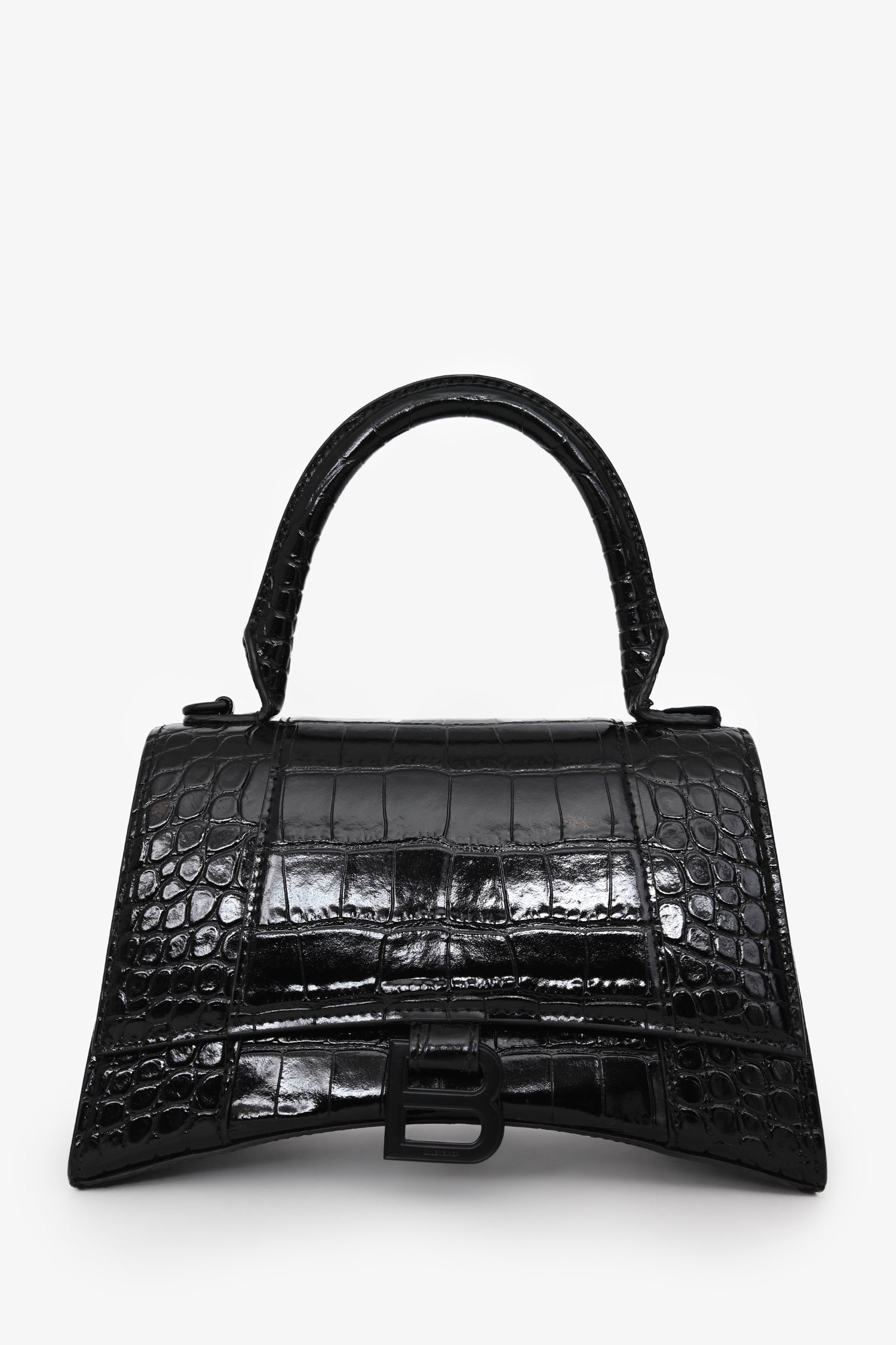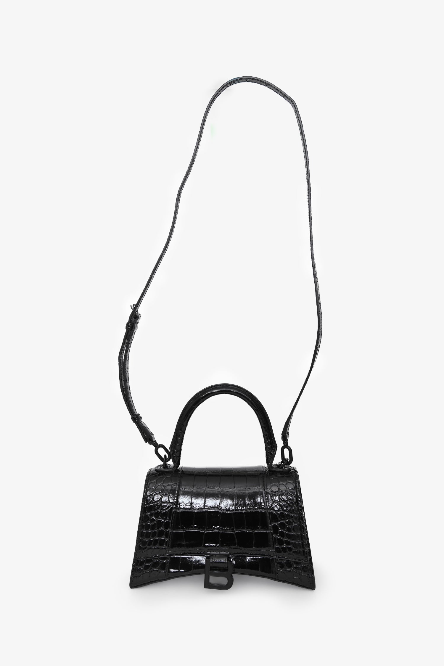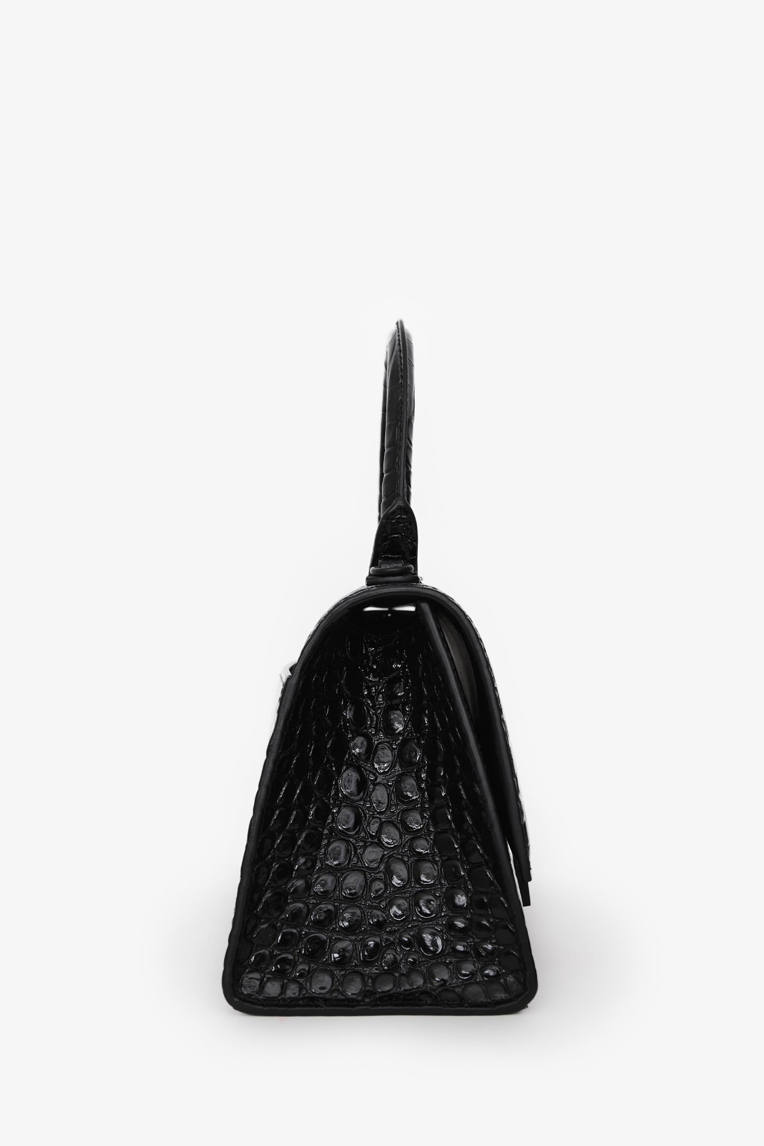 Refresh availabilityBalenciaga Black Croc Embossed Small Hourglass Top Handle Bag with Strap. Top fold-over flap with snap button closure. Single top handle. Detachable shoulder strap with lobster clasp. 1 interior compartment. 1 wall pocket with zip closure. Leather-lined interior. Tonal hardware. Tonal stitching.