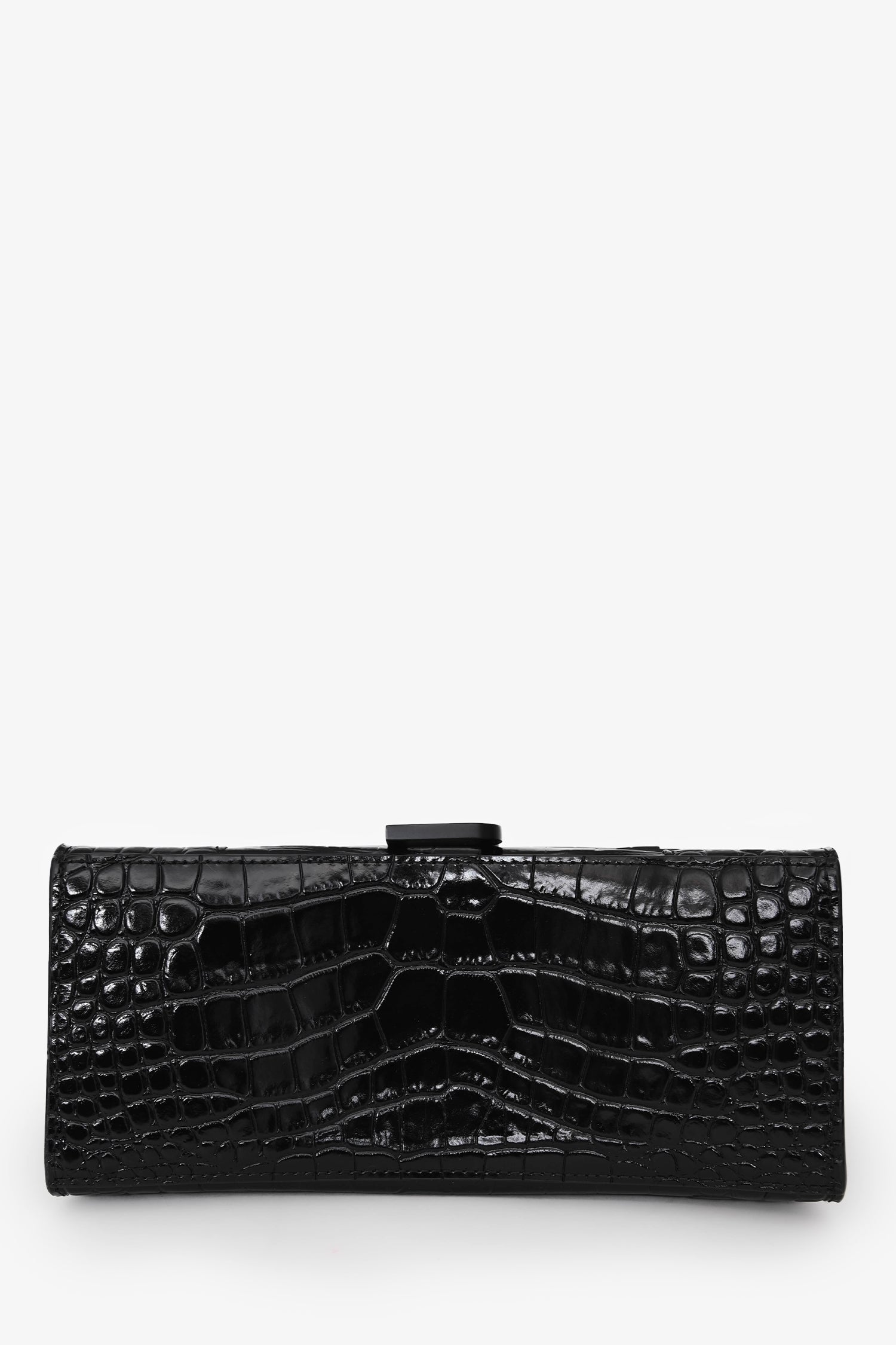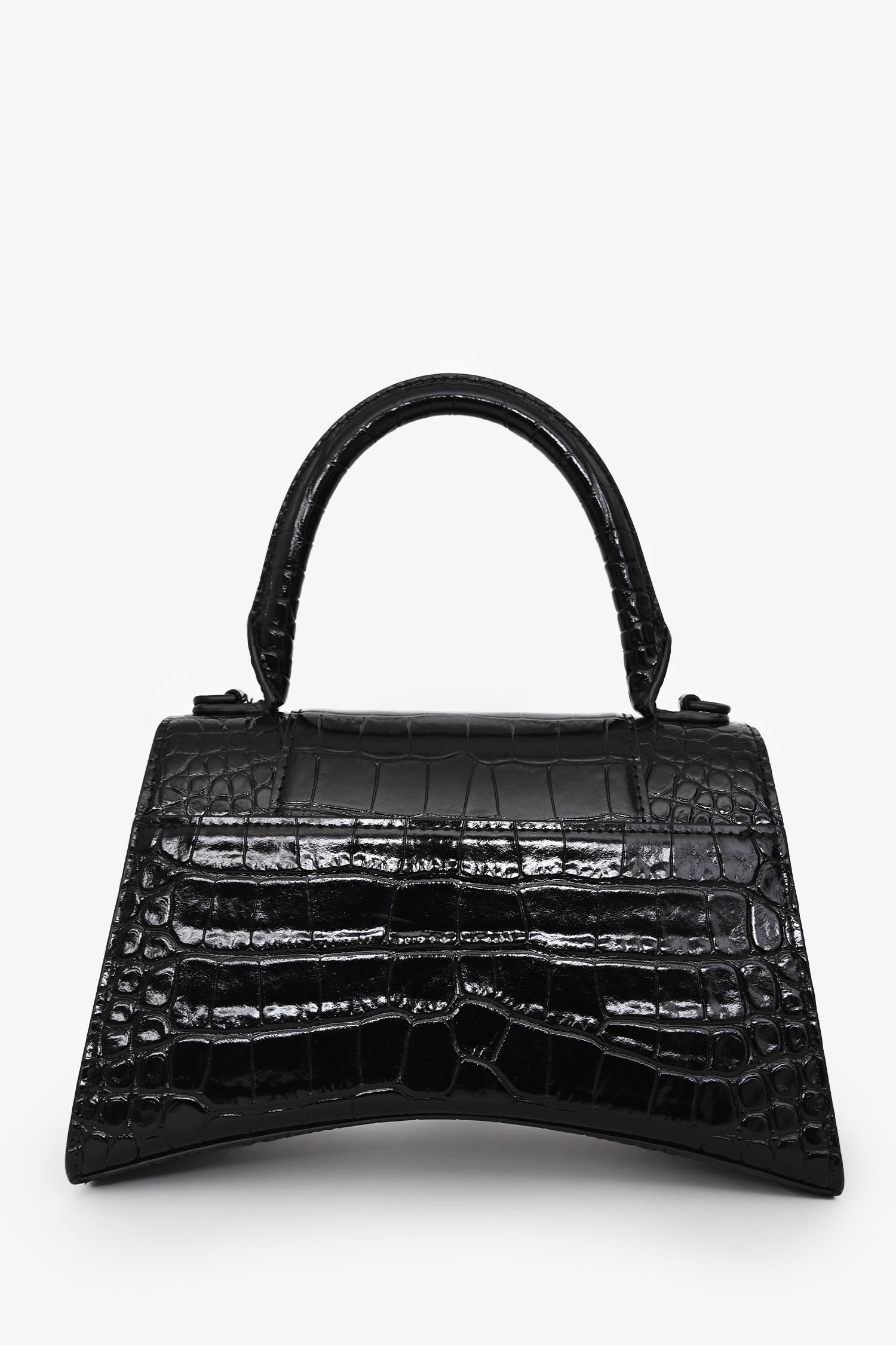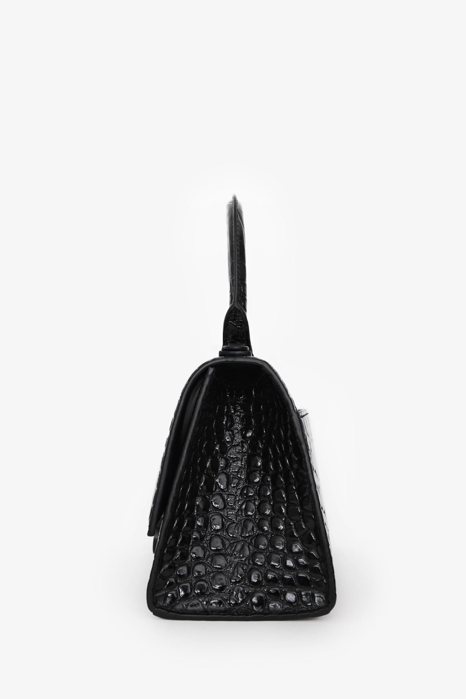 Refresh availabilityBalenciaga Black Croc Embossed Small Hourglass Top Handle Bag with Strap. Top fold-over flap with snap button closure. Single top handle. Detachable shoulder strap with lobster clasp. 1 interior compartment. 1 wall pocket with zip closure. Leather-lined interior. Tonal hardware. Tonal stitching.