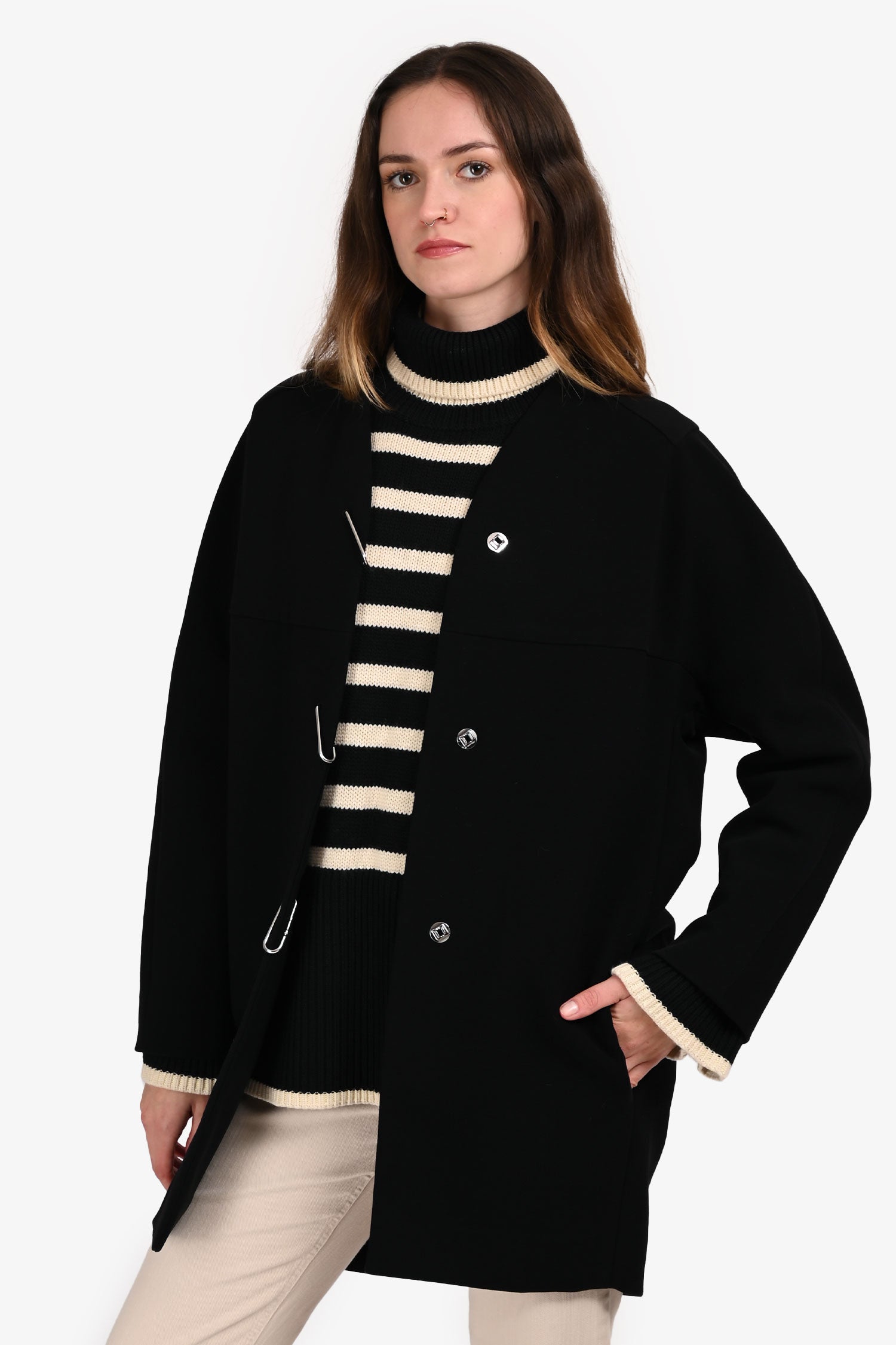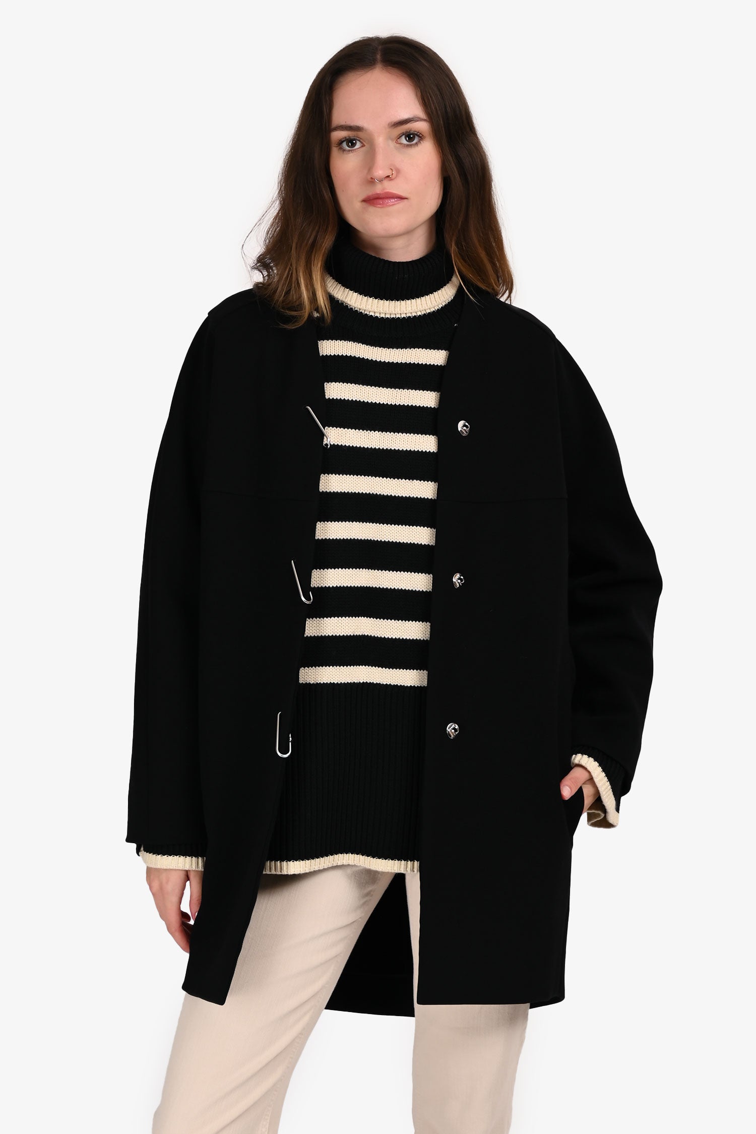Refresh availabilityBalenciaga Black Knee Length Coat. Front button-up closure. Round neckline. 2 exterior side slip pockets and 2 interior slip pockets. Unlined. Silver-tone hardware. Tonal stitching.