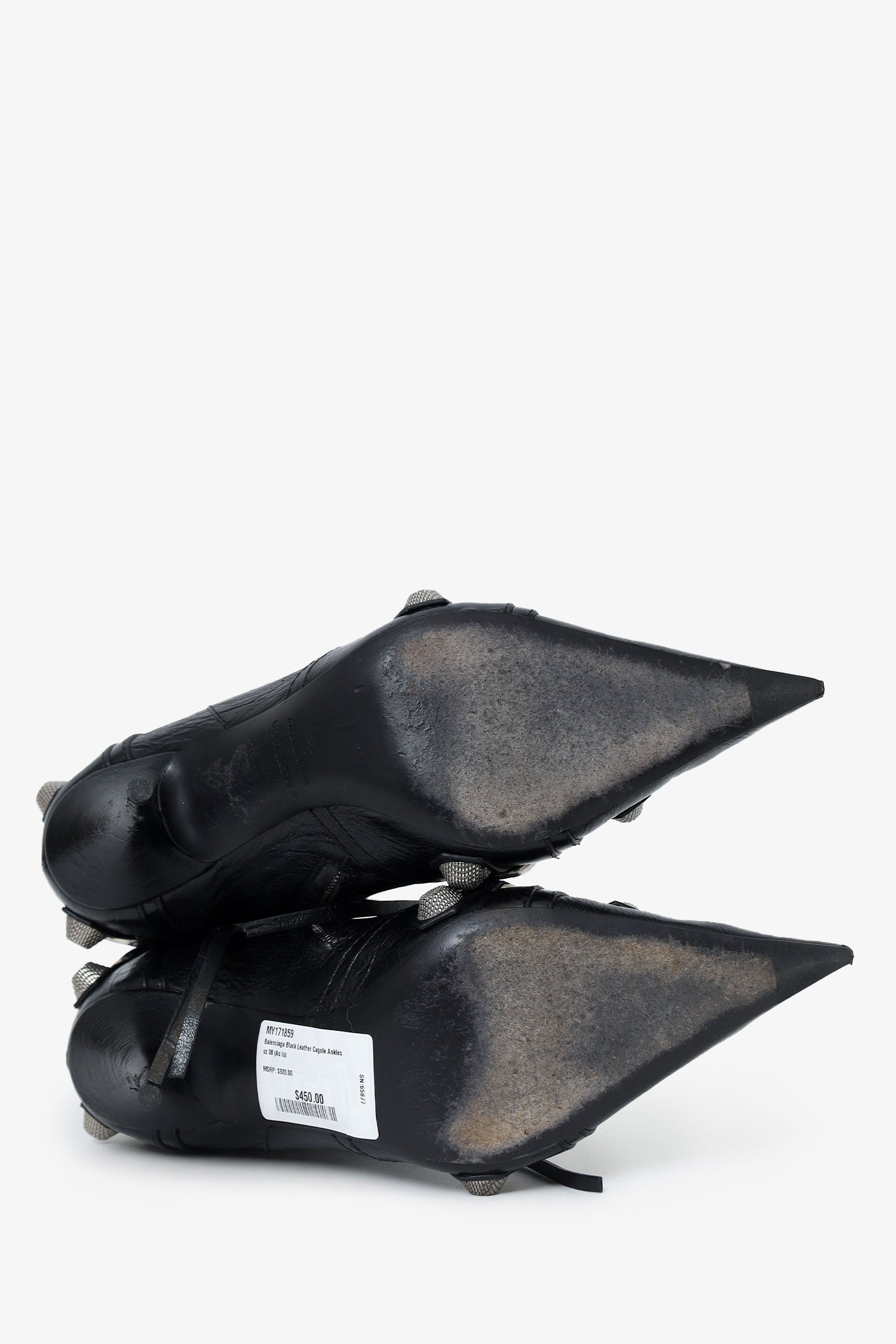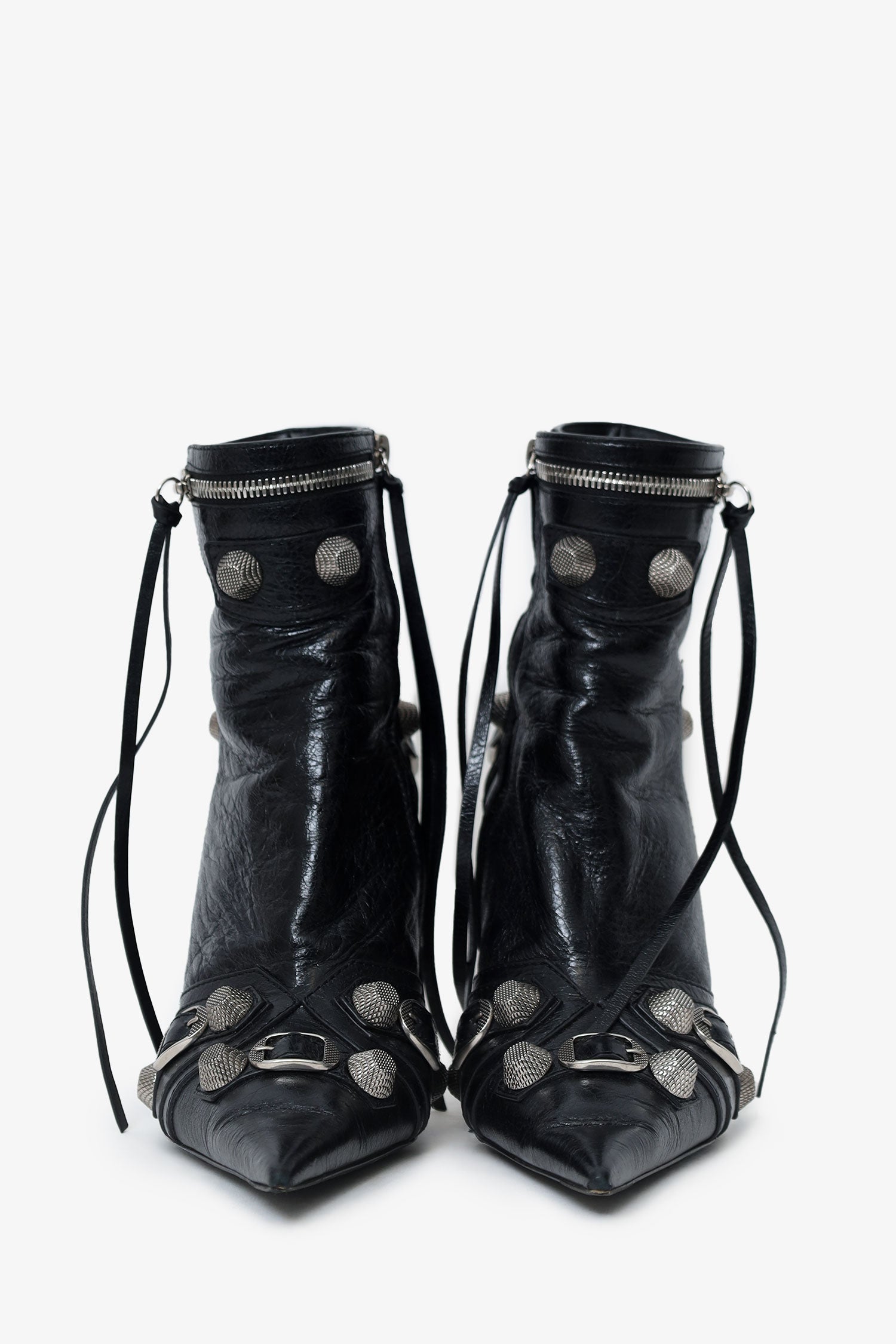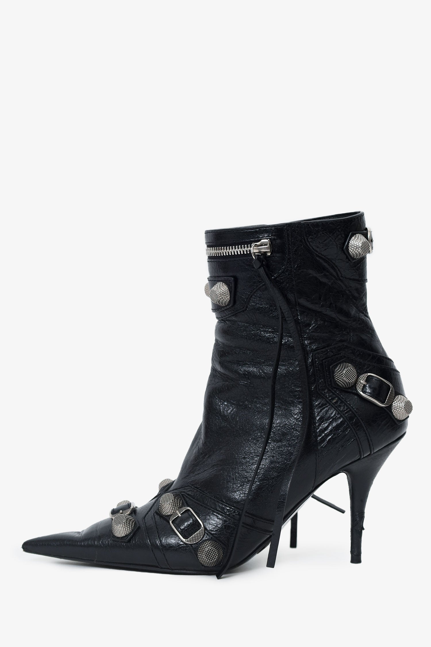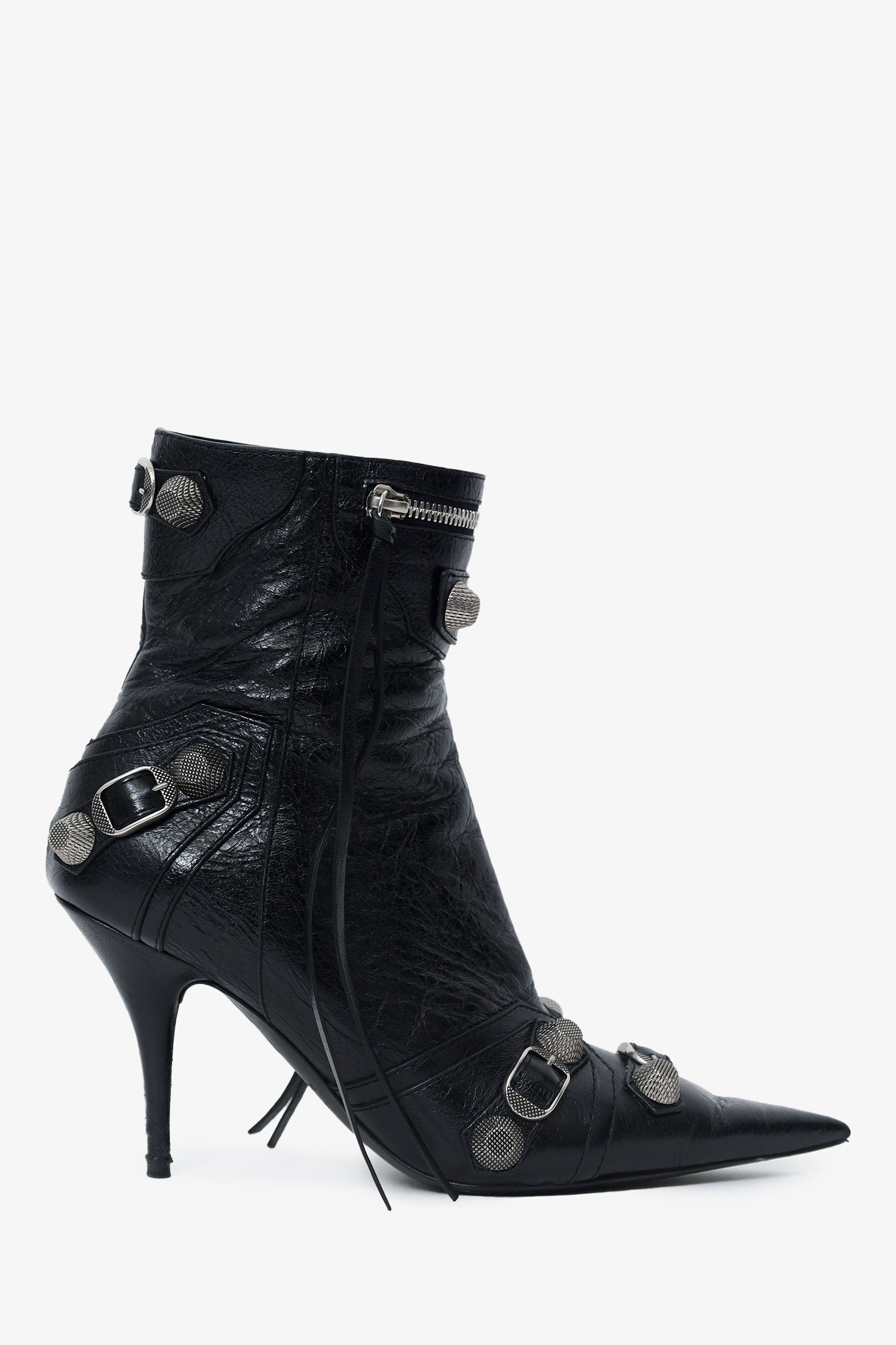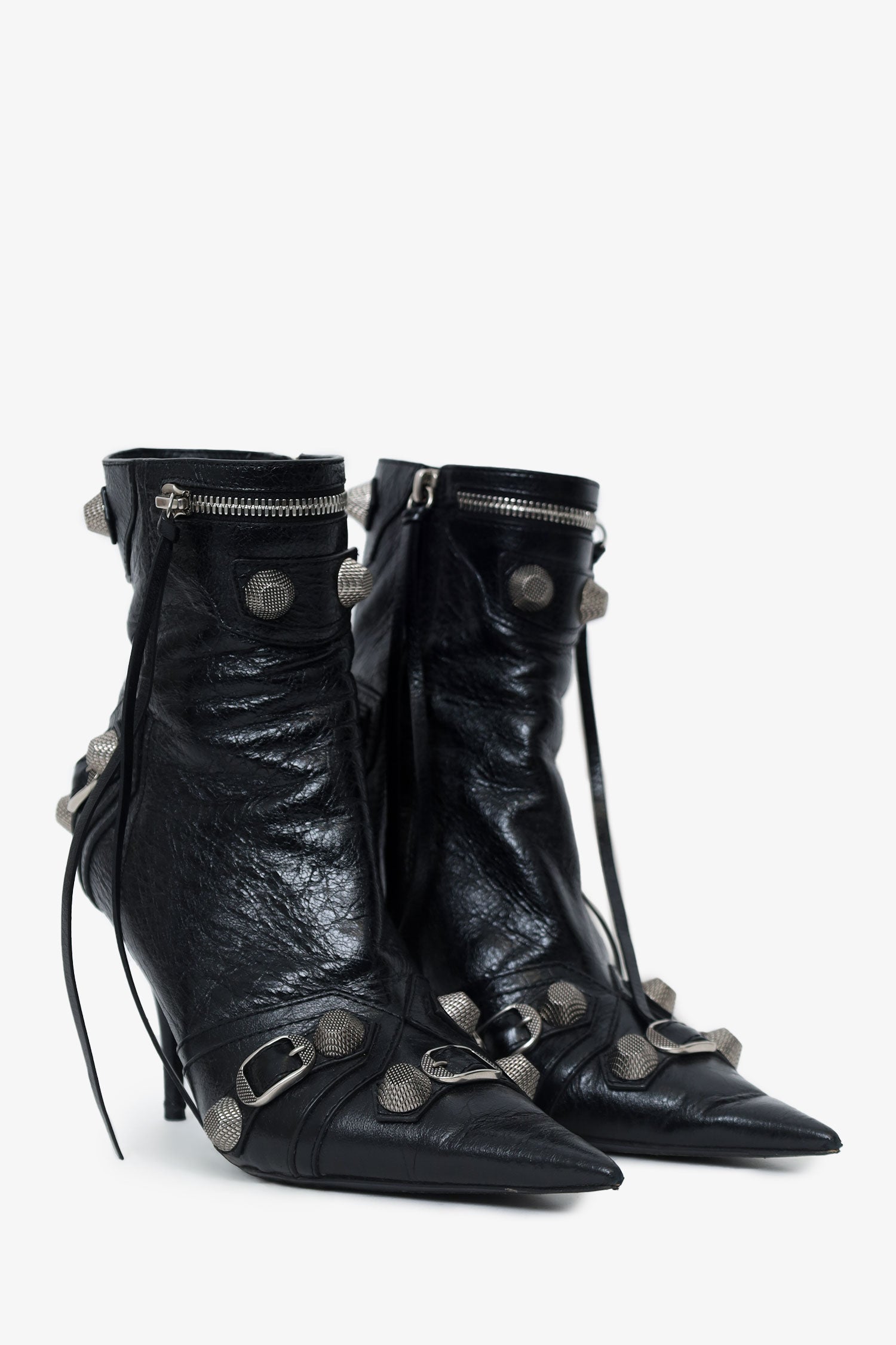 Refresh availabilityBalenciaga Black Leather Cagole Ankle Boot. Pull-on. Side zip closure. Functional front zip detail. Embellishments on toe, front, and heel. Leather-lined interior. Silver-tone hardware. Tonal stitching.