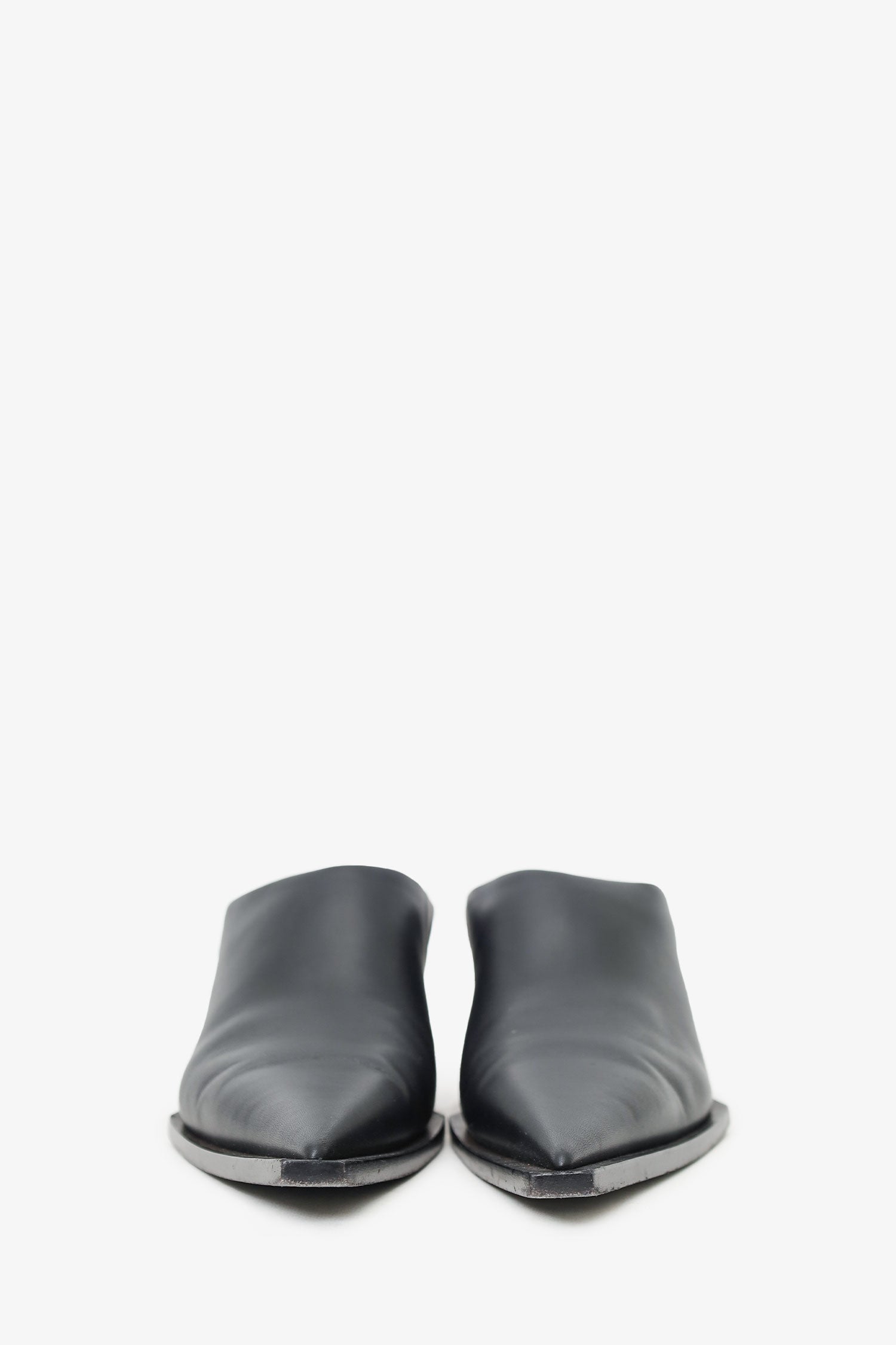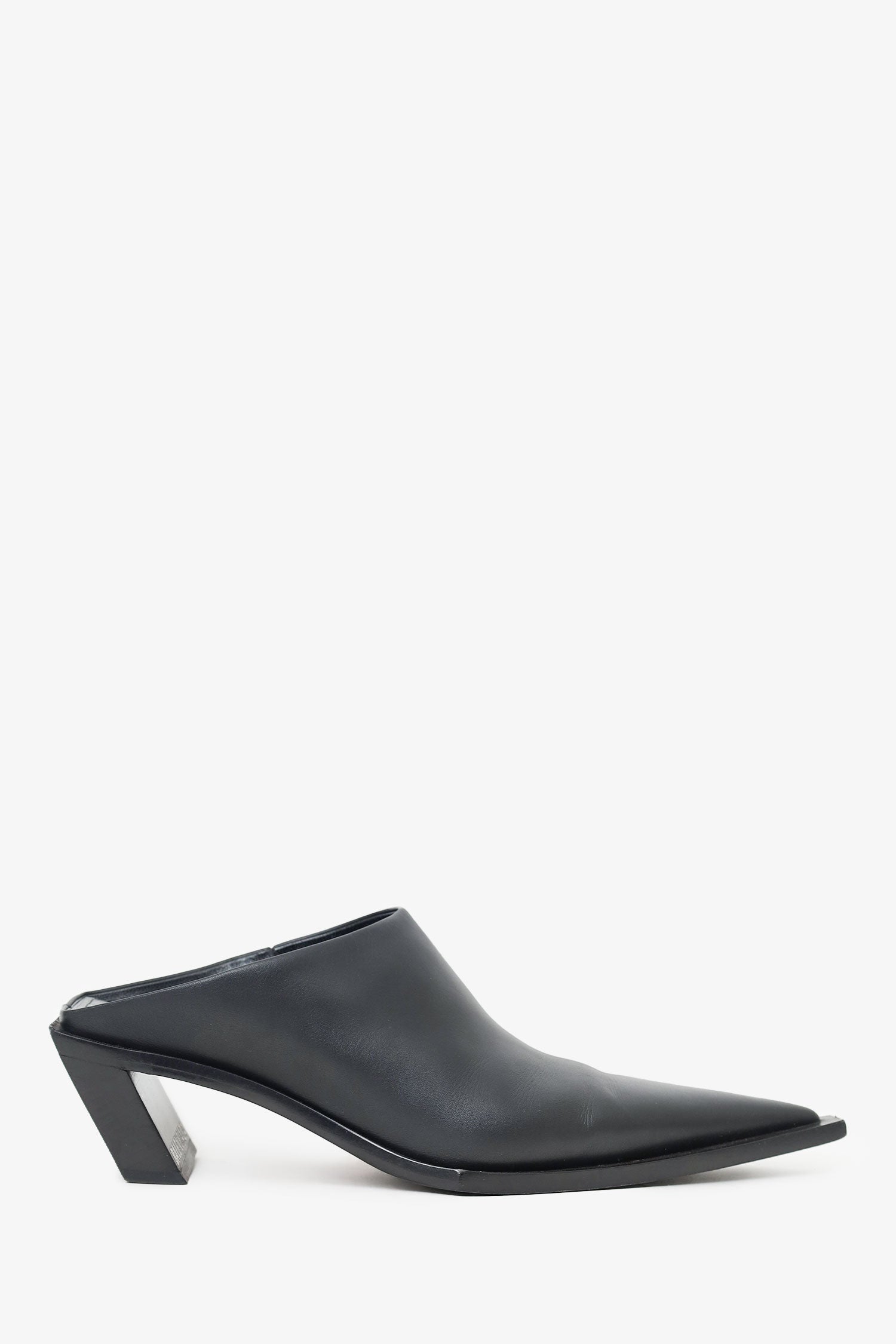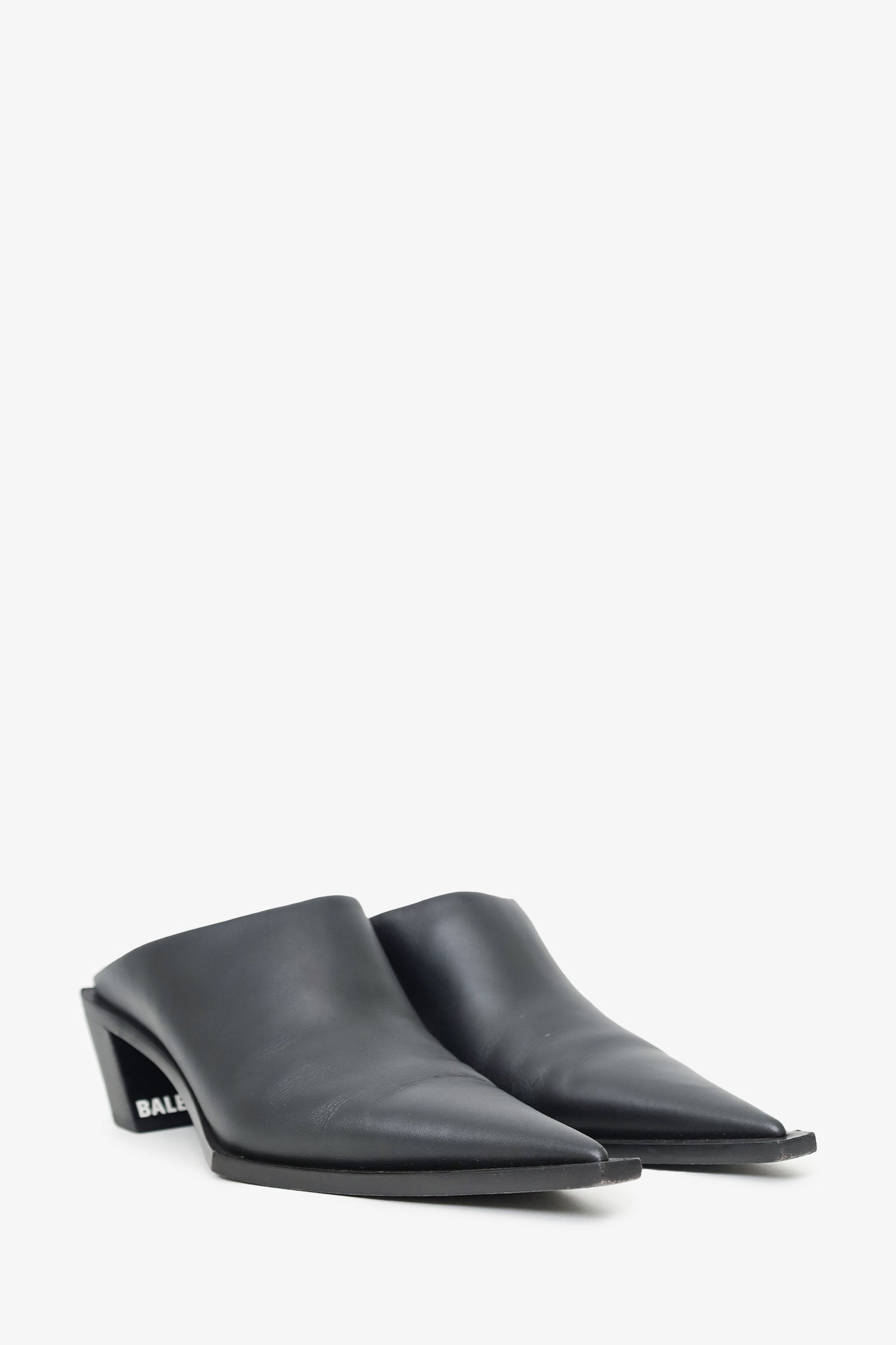 Refresh availabilityBalenciaga Black Leather Point Toe 'Tiaga' Heeled Mules. Slip-on. Pointed toe. Tonal stitching.