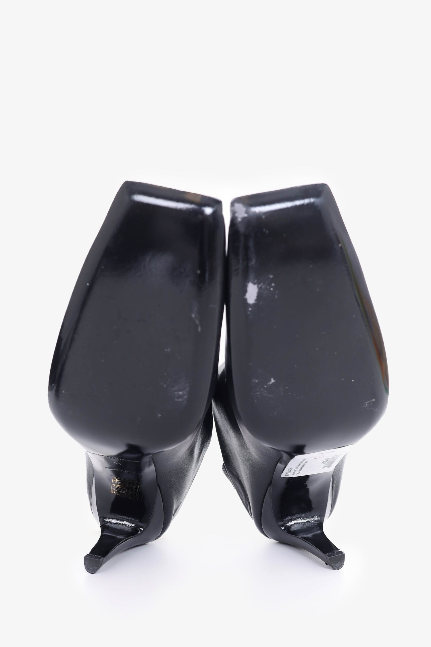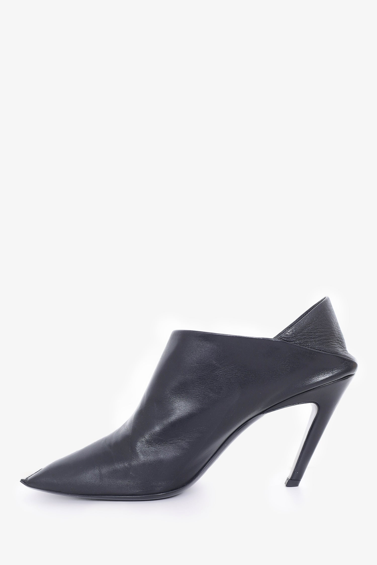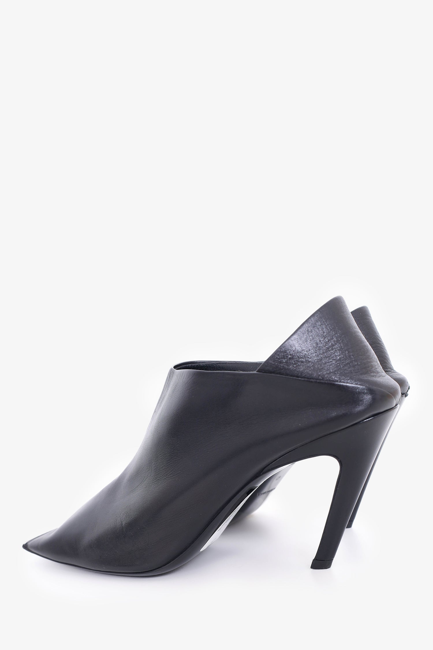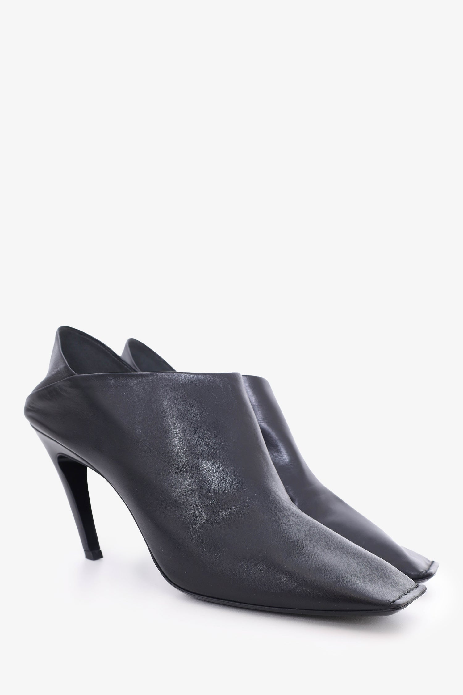 Refresh availabilityBalenciaga Black Leather Quadro Square Toe Foldable Heel Mule. Slip-on. Slanted heel. Tonal stitching.