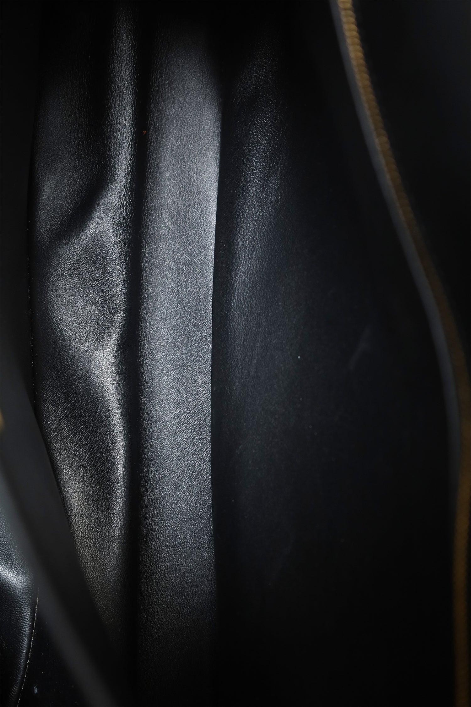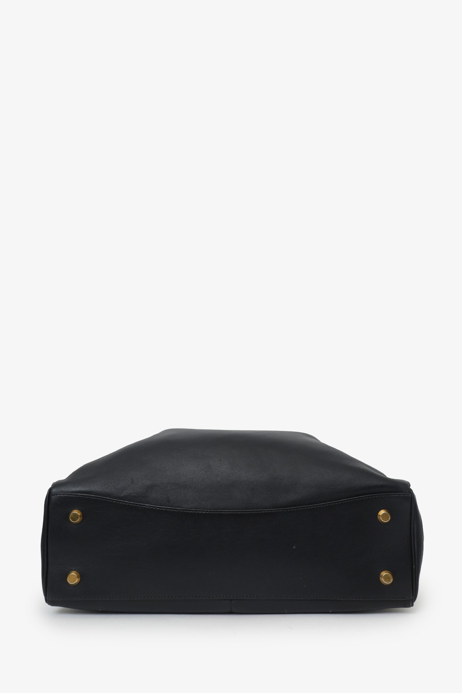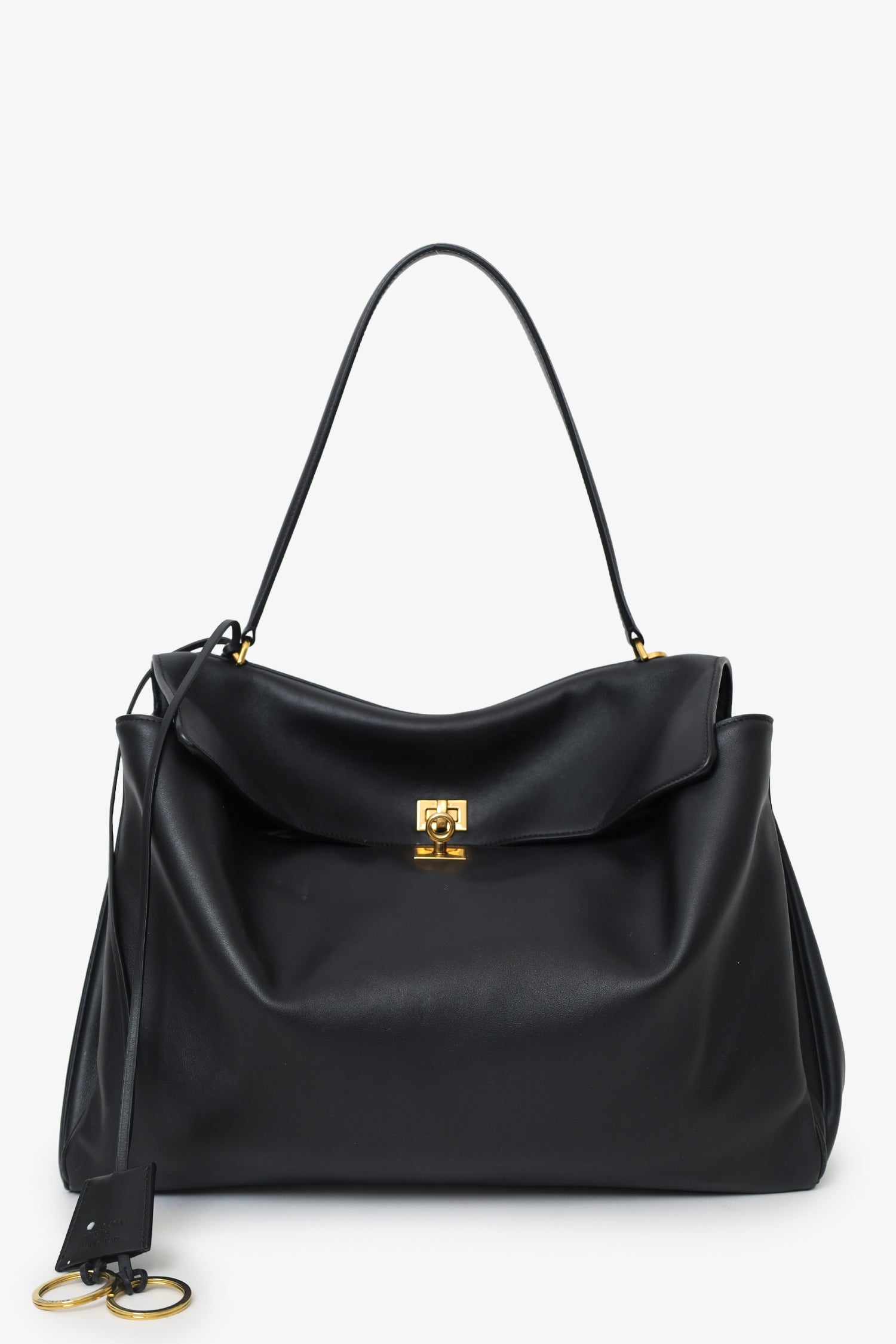 Refresh availabilityBalenciaga Black Leather 'Rodeo' Medium Top Handle. Front-fold-over-flap with turn-lock closure. Top handle. Removable leather shoulder strap with clasp closure. Side snap-button-up closures. 2 exterior rear slip pockets Protective base studs. Leather-lined interior with 2 compartments; front compartment contains 1 open large pocket, rear compartment contains 1 large pocket with single rear zip-up pocket. Removable bag tag with 2 key rings. Gold-tone hardware. Tonal stitching.