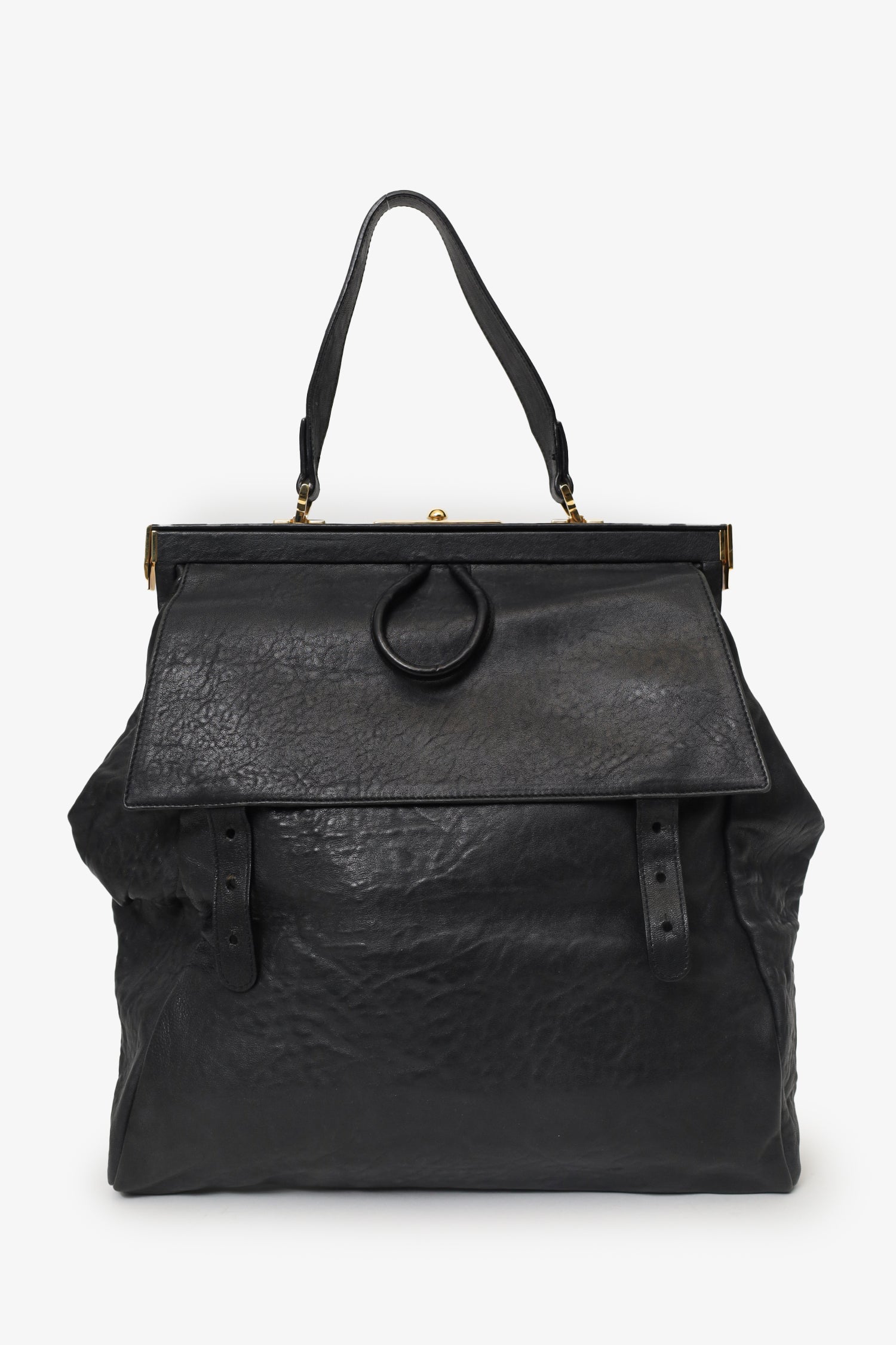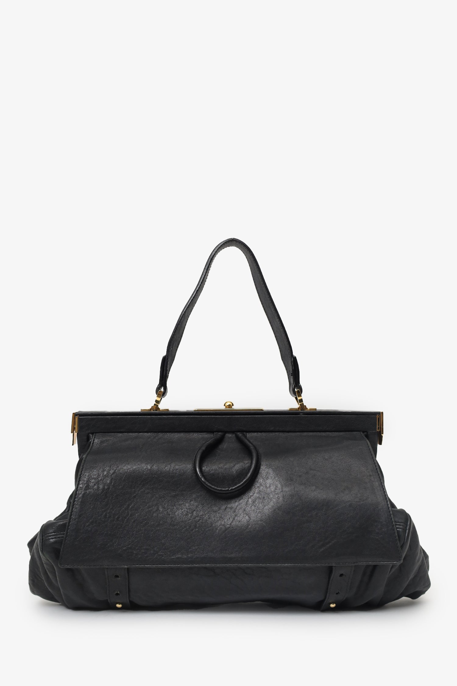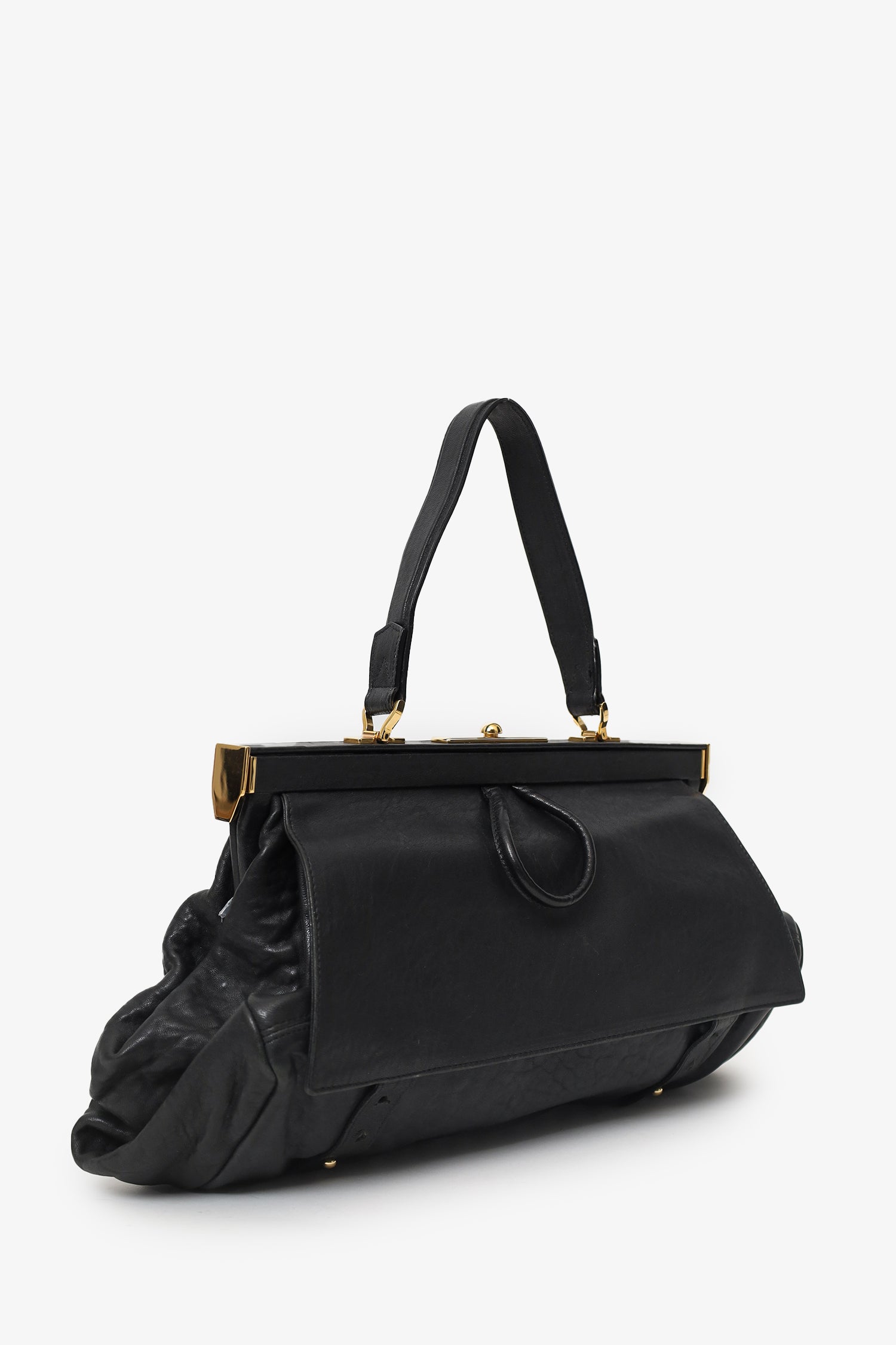 Balenciaga Black Leather Top Handle. Top push-lock closure. Top handle. Front fold-over flap with push-pin closure. Can be worn folded or unfolded. Single exterior zip pocket. Fabric-lined interior with single zip pocket. Gold-tone hardware. Tonal stitching.