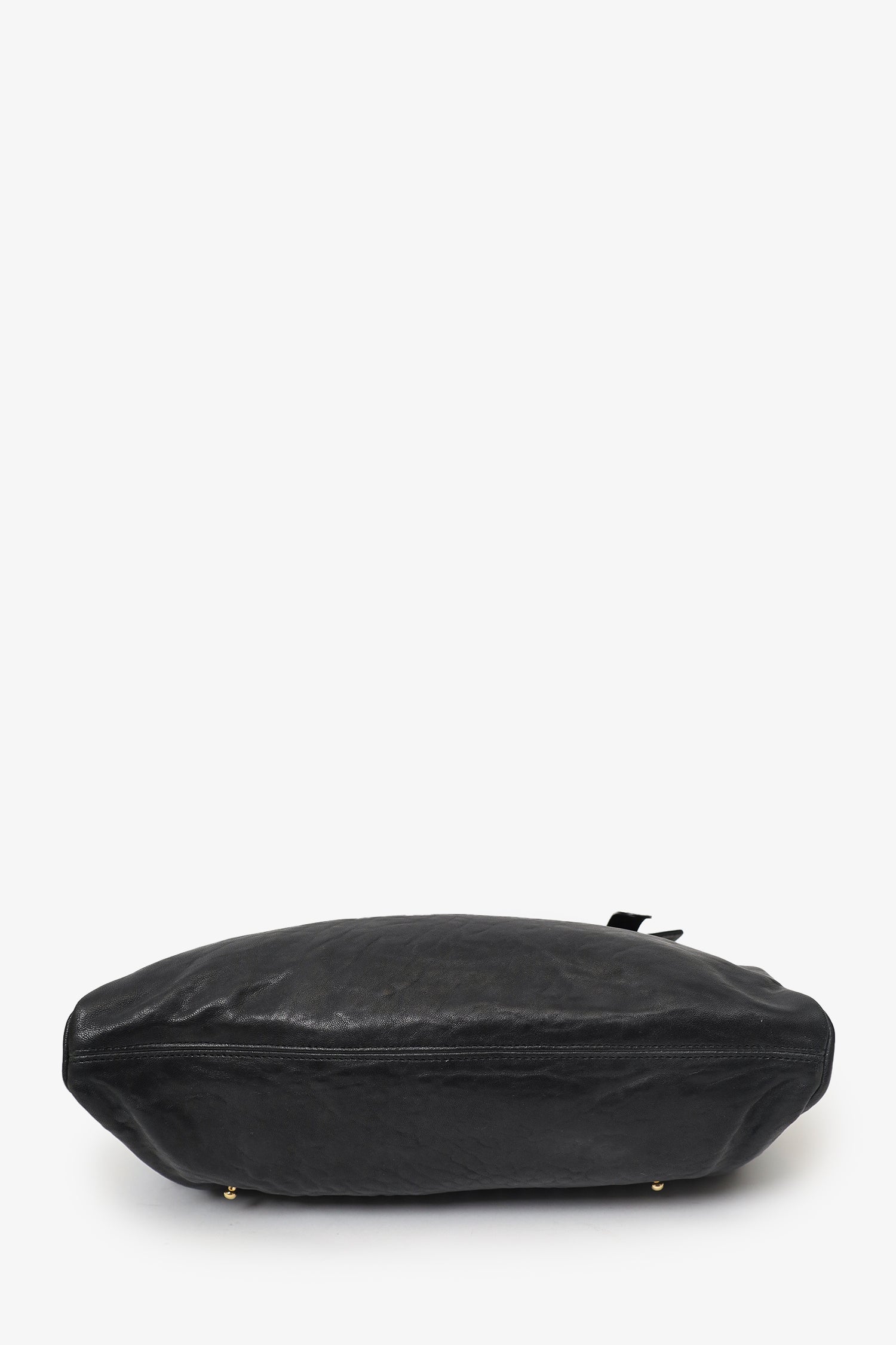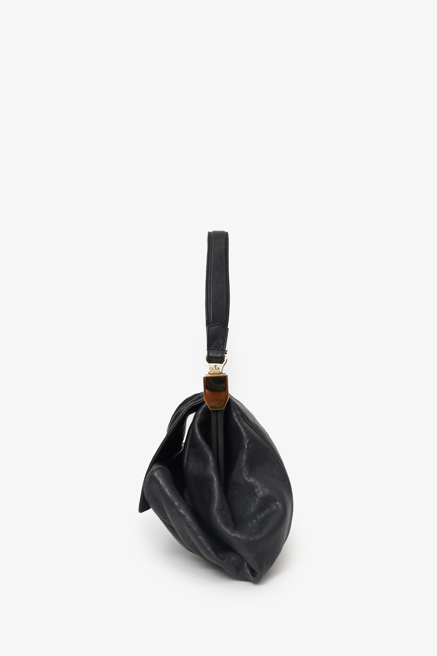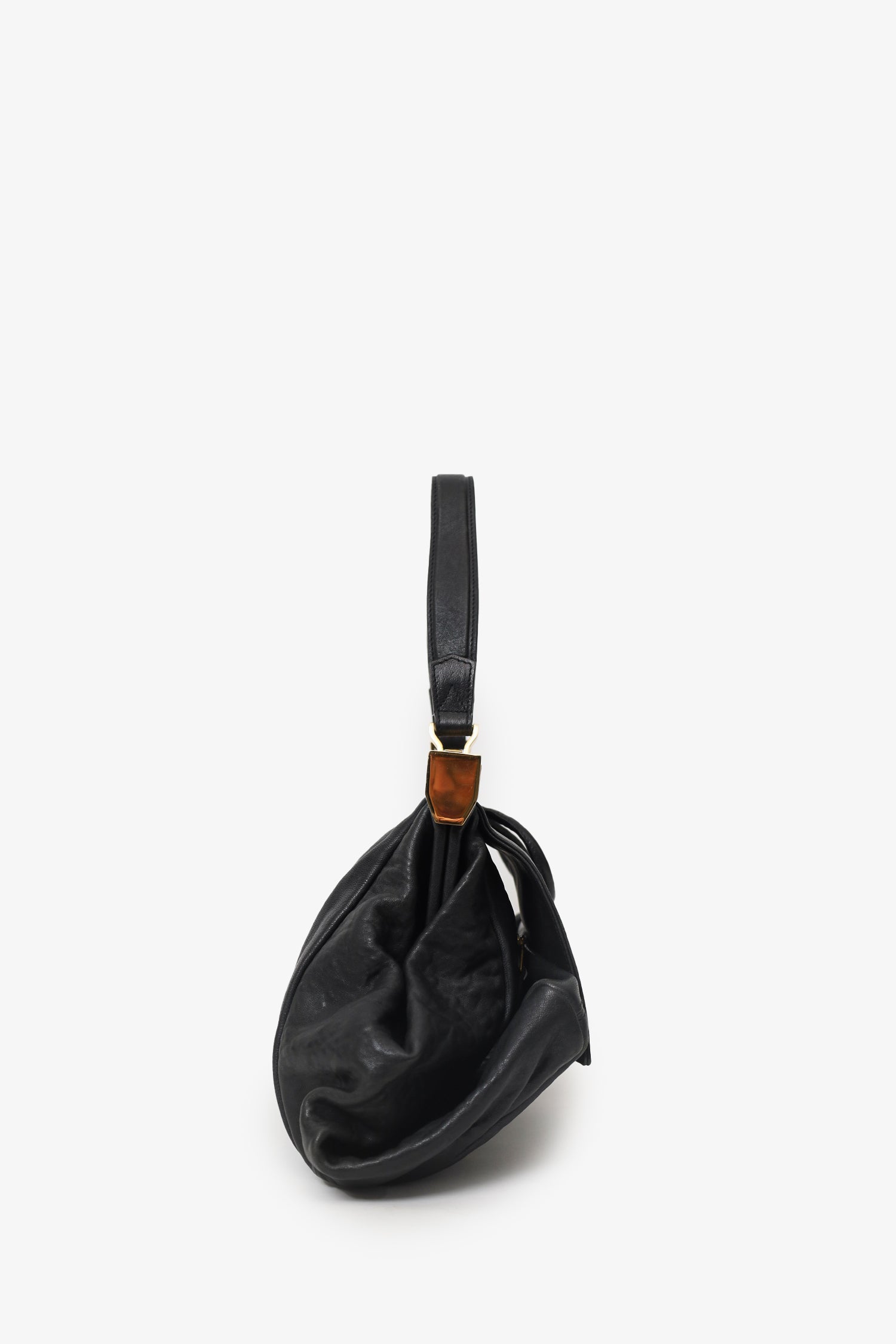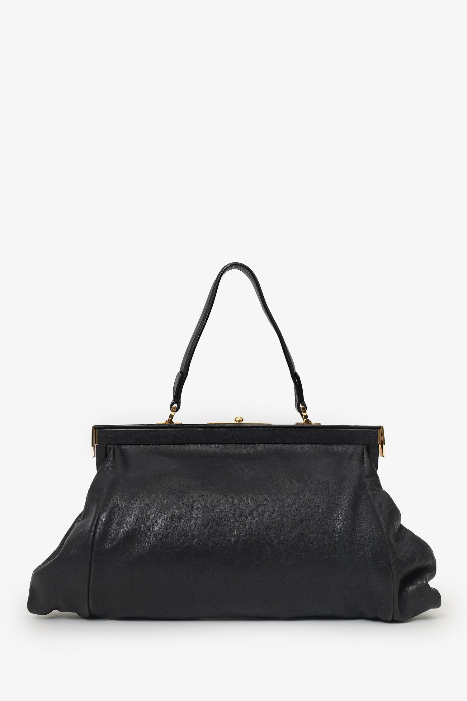 Balenciaga Black Leather Top Handle. Top push-lock closure. Top handle. Front fold-over flap with push-pin closure. Can be worn folded or unfolded. Single exterior zip pocket. Fabric-lined interior with single zip pocket. Gold-tone hardware. Tonal stitching.