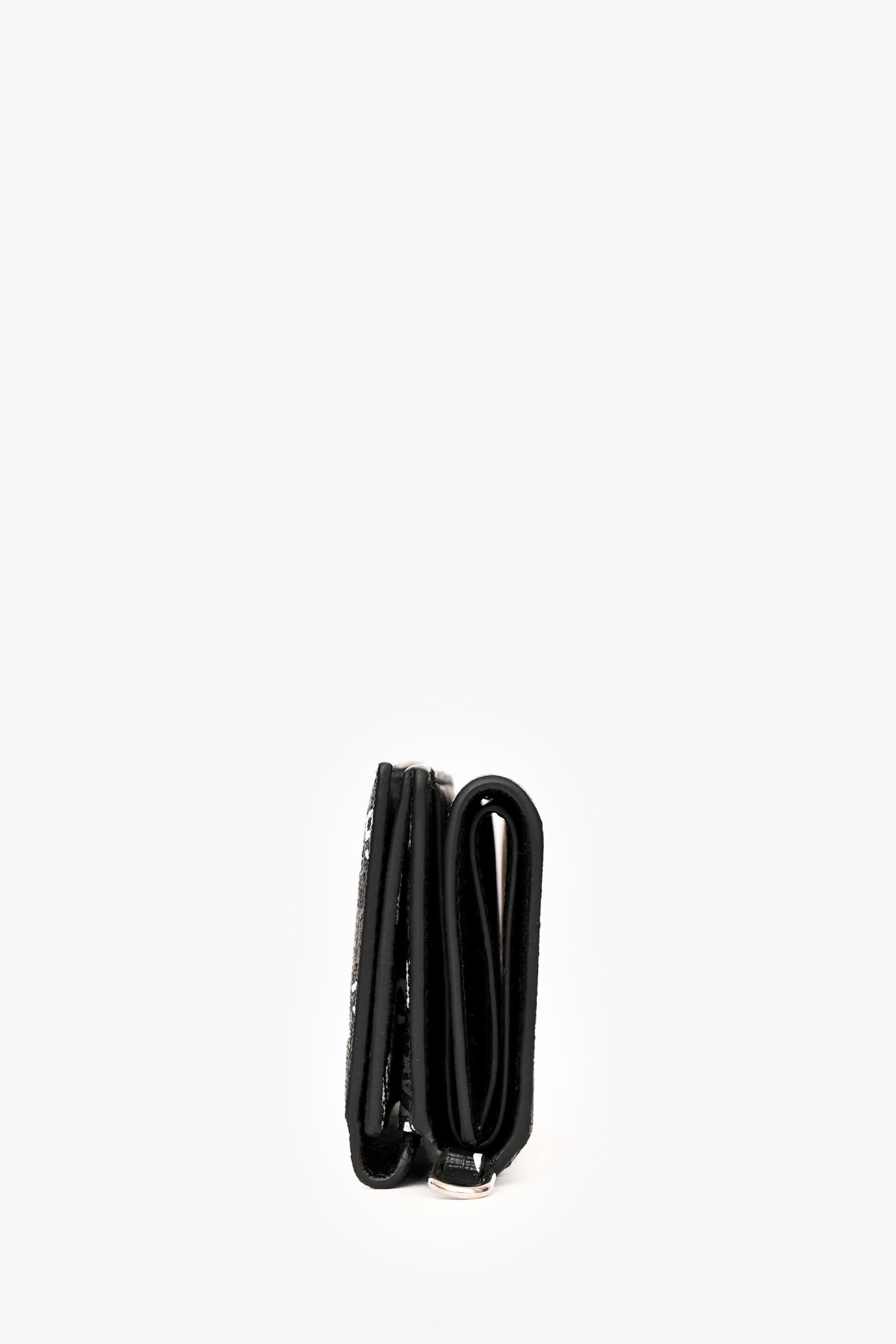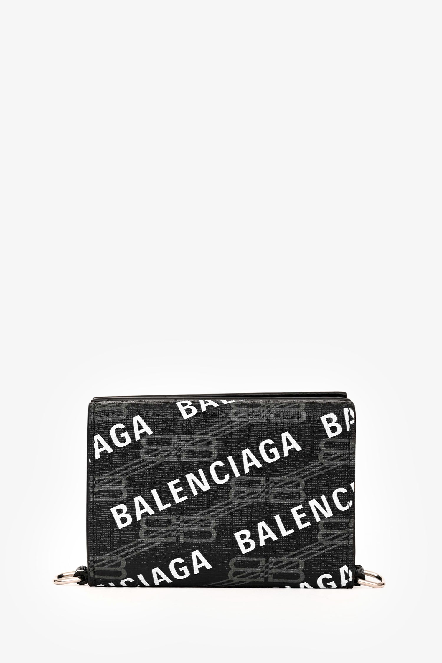 Refresh availabilityBalenciaga Black Logo Printed Trifold Wallet. 1 coin pocket. 1 bill slot with 3 card compartments. Coated trim. Chain-link strap. Tonal stitching.