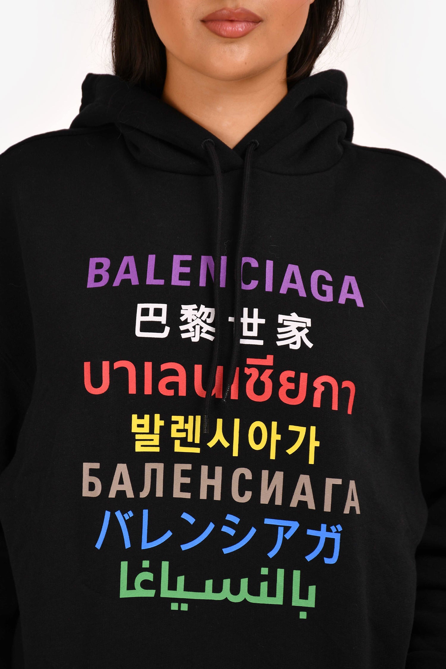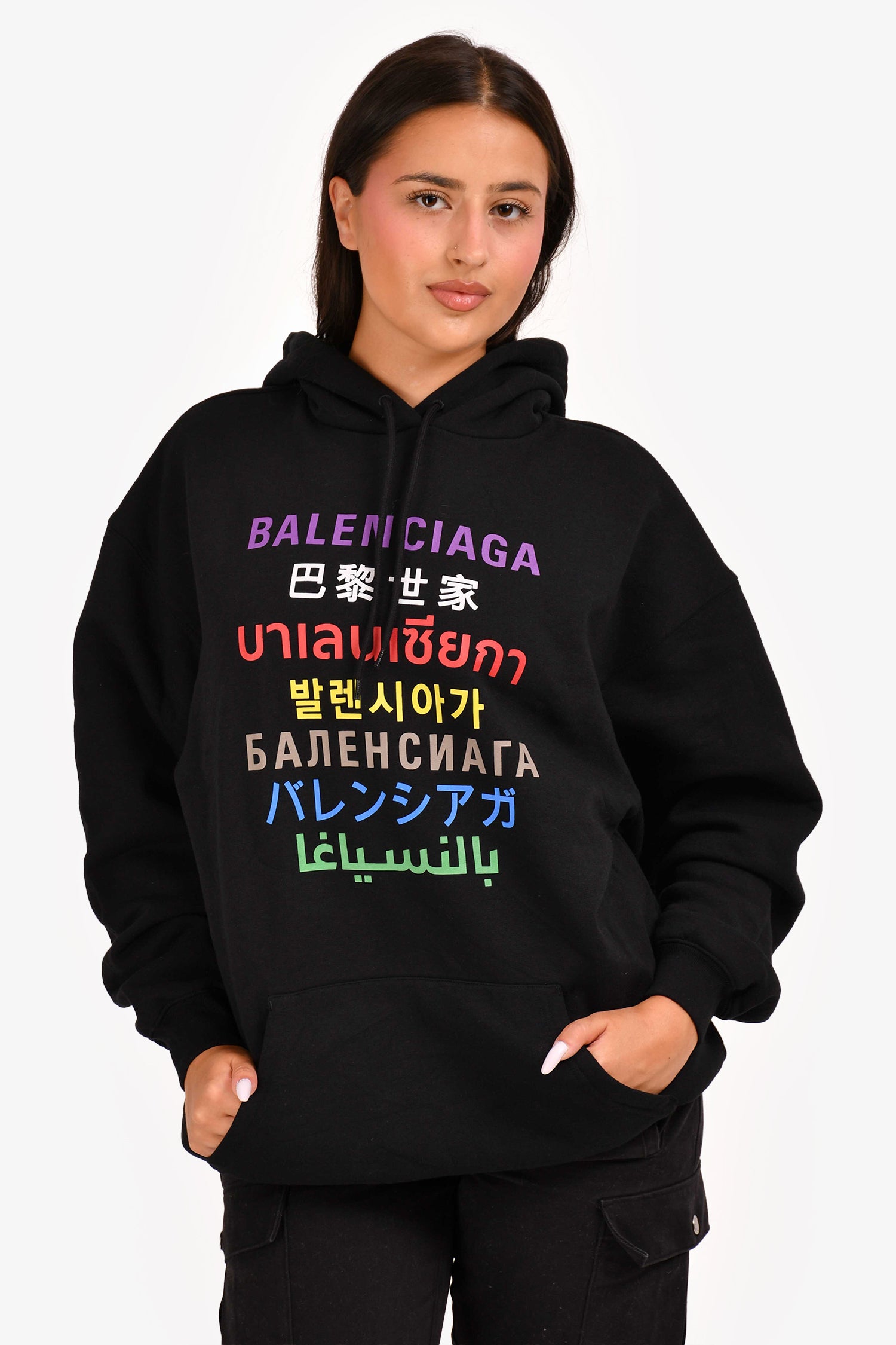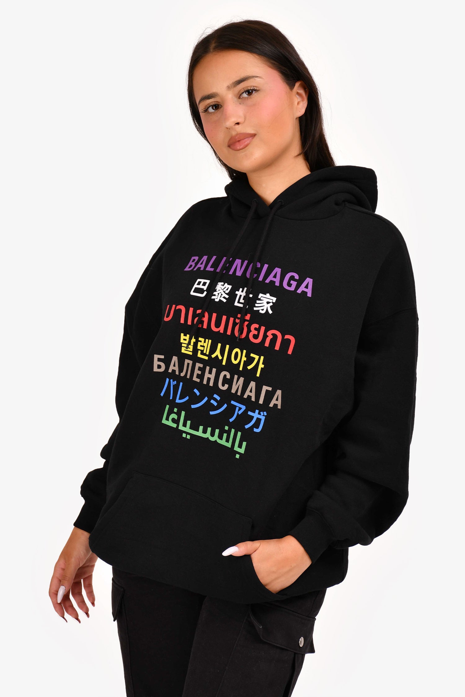 Refresh availabilityBalenciaga Black/Multicolour Logo Hoodie. Drawstring hood. Ribbed cuffs and hem. Multicolour logo print at chest. Kangaroo pocket. Tonal stitching.
