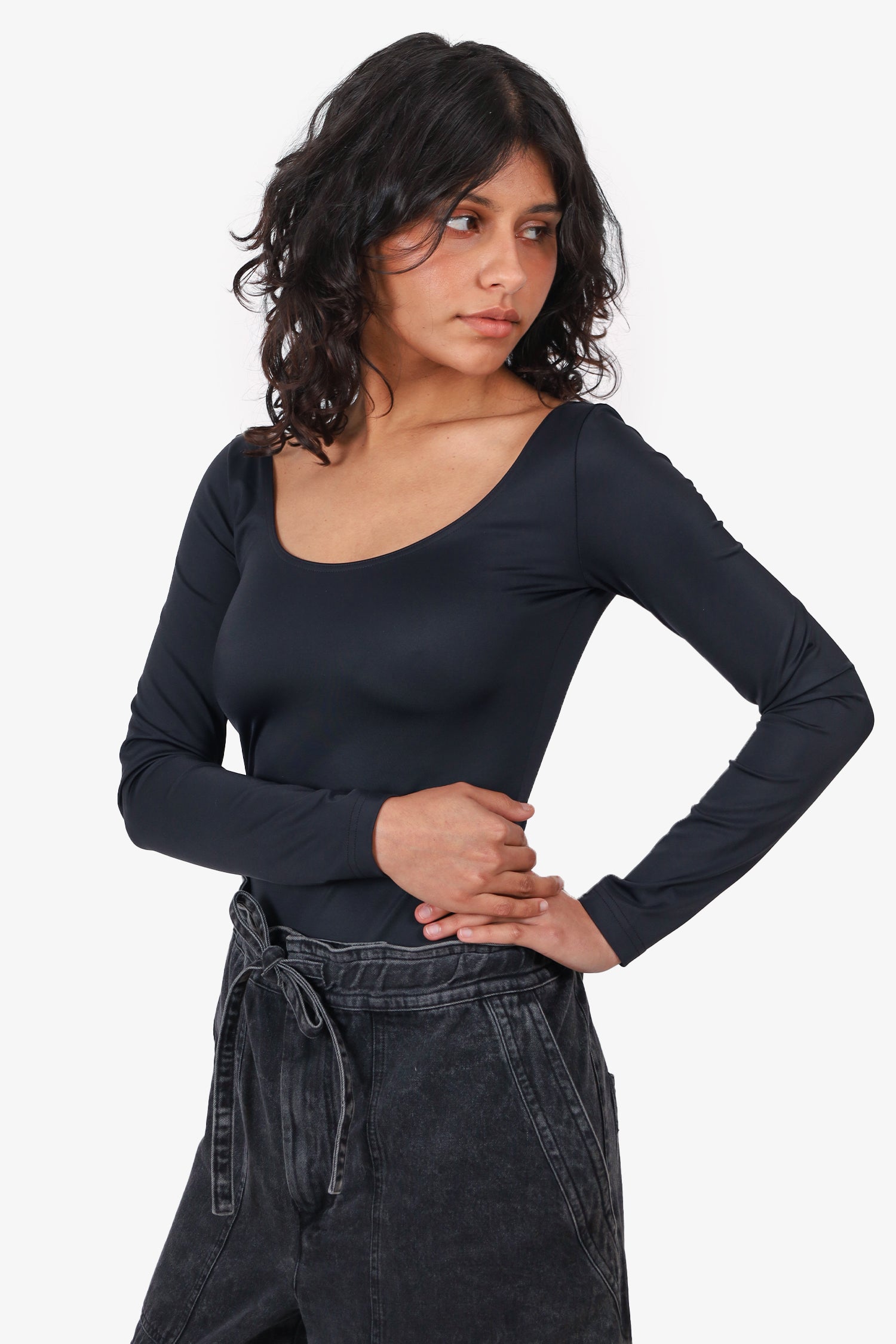 Refresh availabilityBalenciaga Black Spandex Bodysuit. Slip-on. Boat neckline. Bottom snap-button closure. Tonal stitching.