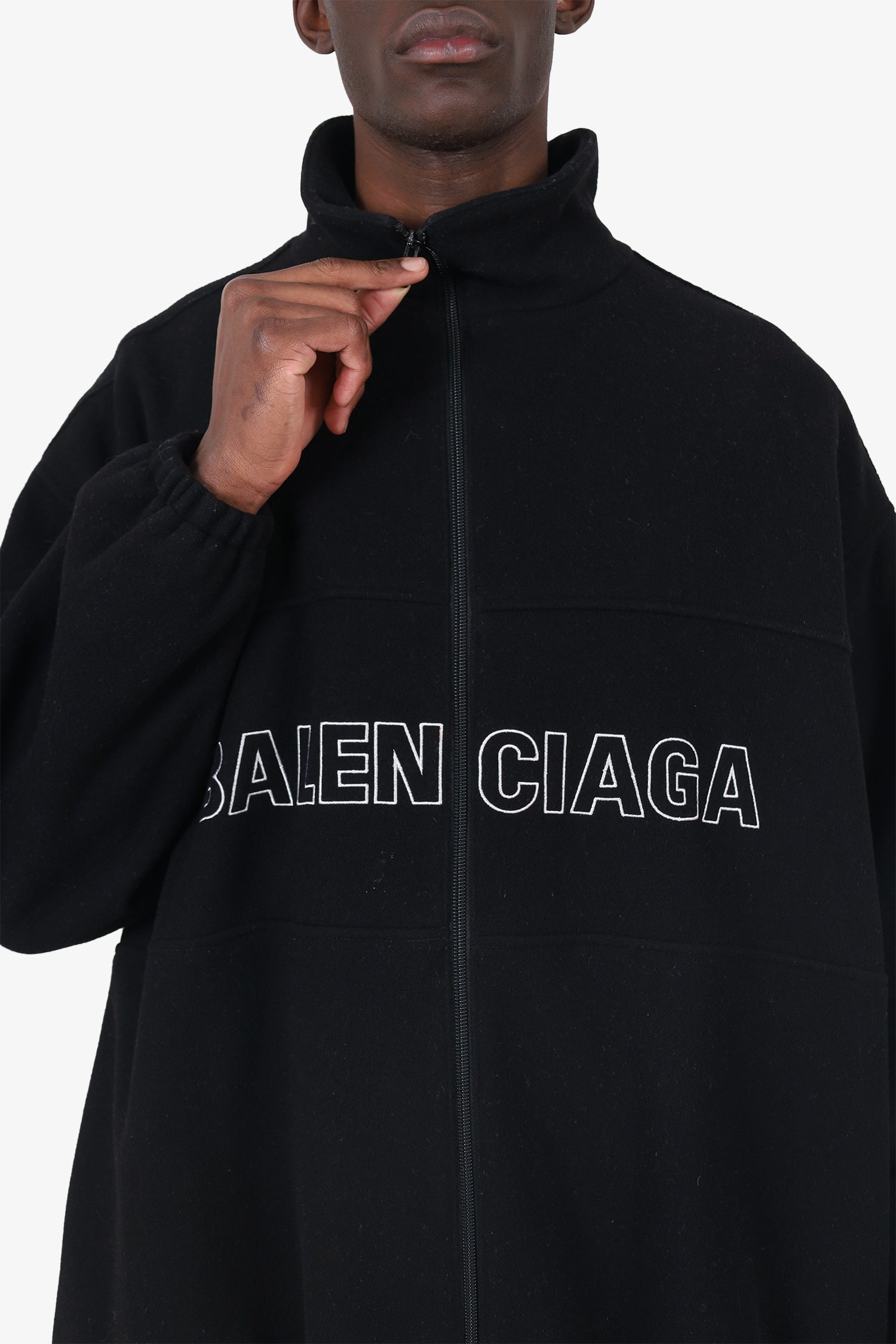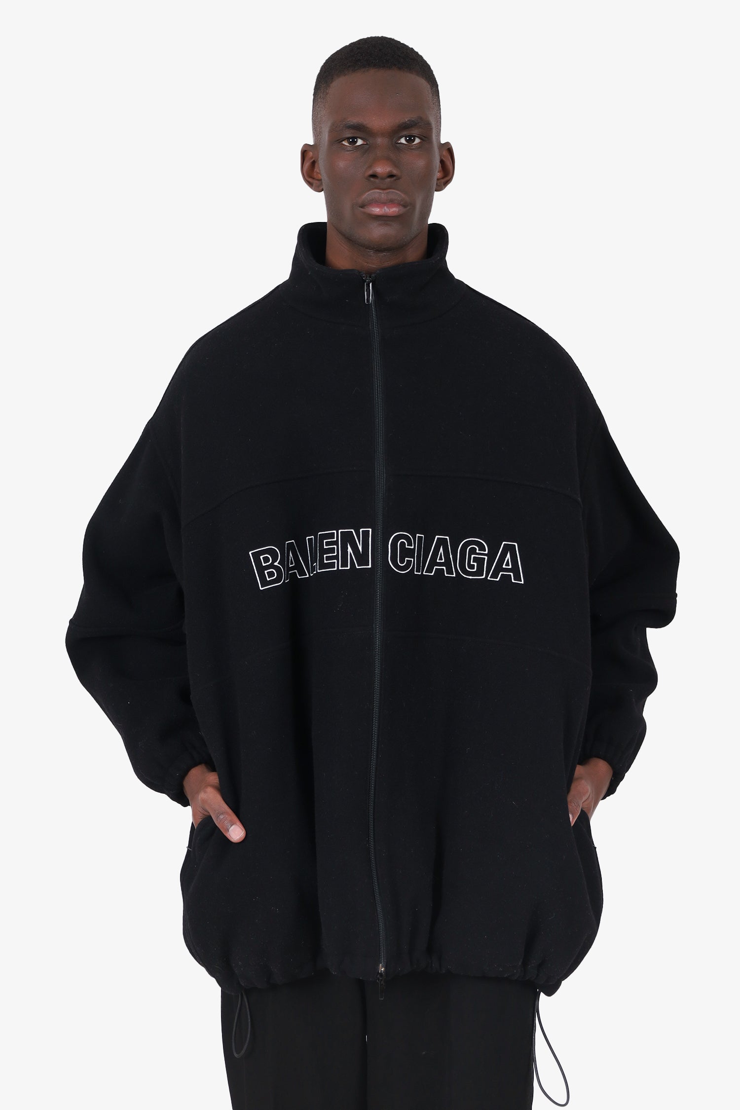 Refresh availabilityBalenciaga Black Wool Logo-Embroidered Zip-Up Jacket. Pull-on. Mock neckline. Front zip-up closure. 2 exterior side zip pockets. Elasticized sleeve cuffs. Elasticized waistband with cinching detail. Lined interior. Tonal stitching.