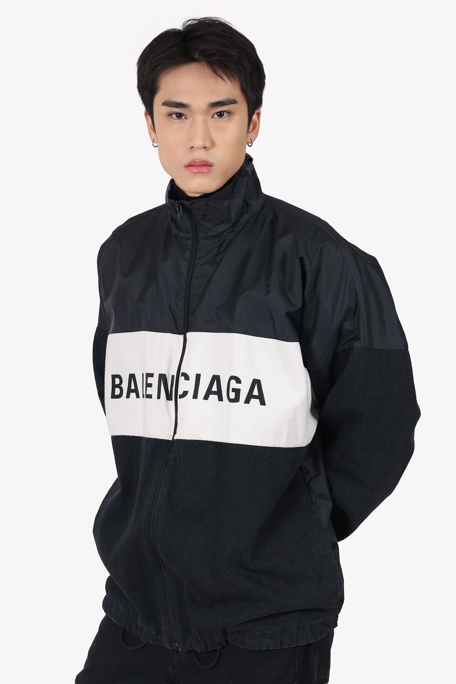 Refresh availabilityBalenciaga Black/White Denim Logo Jacket. Pull-on. High neckline. Front zip closure. Elasticated sleeve cuffs. Elasticized bottom hem with adjustable drawcord closure. 2 exterior side slip pockets. Mesh-lined interior. Tonal stitching.