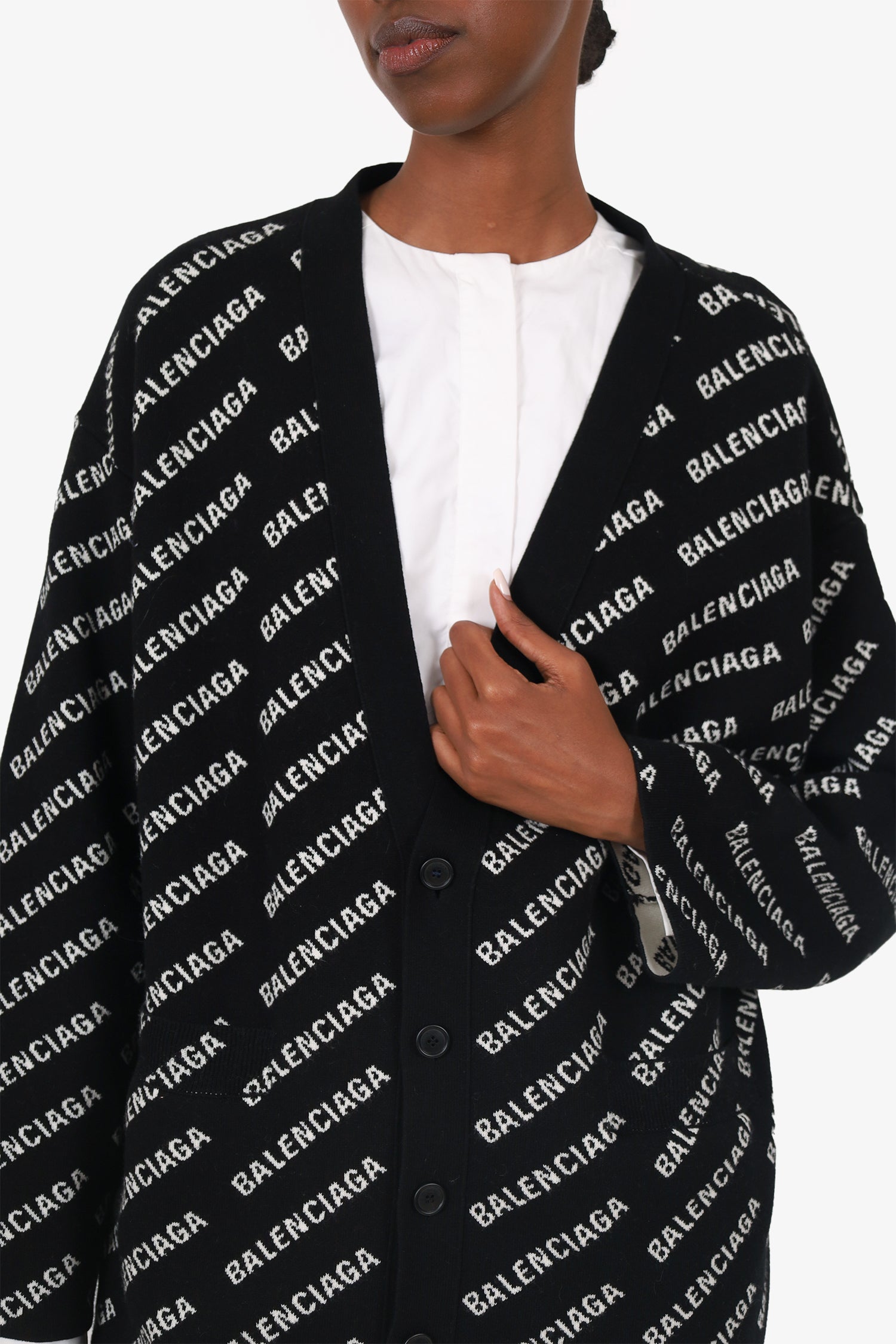 Refresh availabilityBalenciaga Black/White Logo Cardigan. Pull on. V-neckline. Front button-up closure. 2 front exterior slip pockets. Tonal stitching.