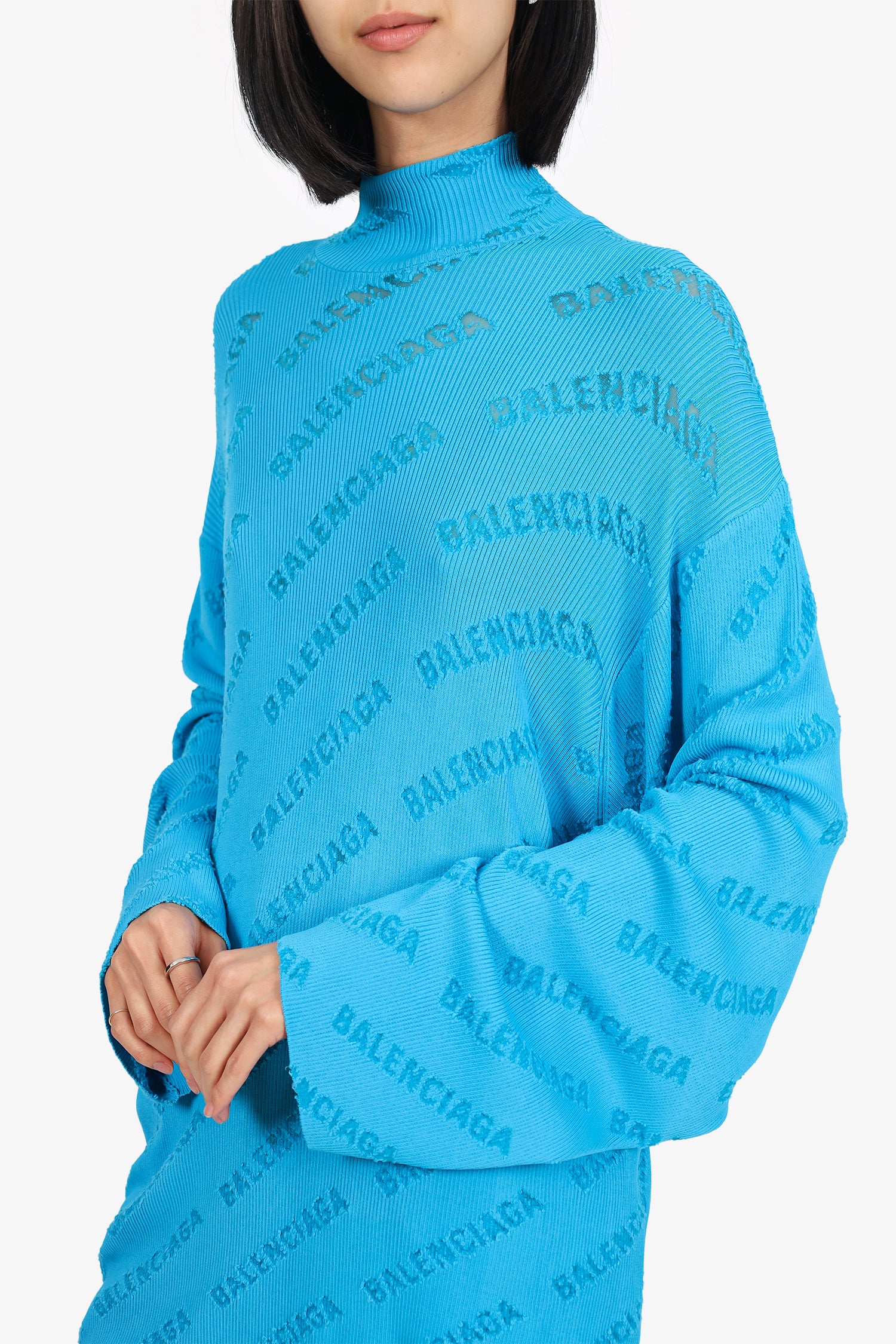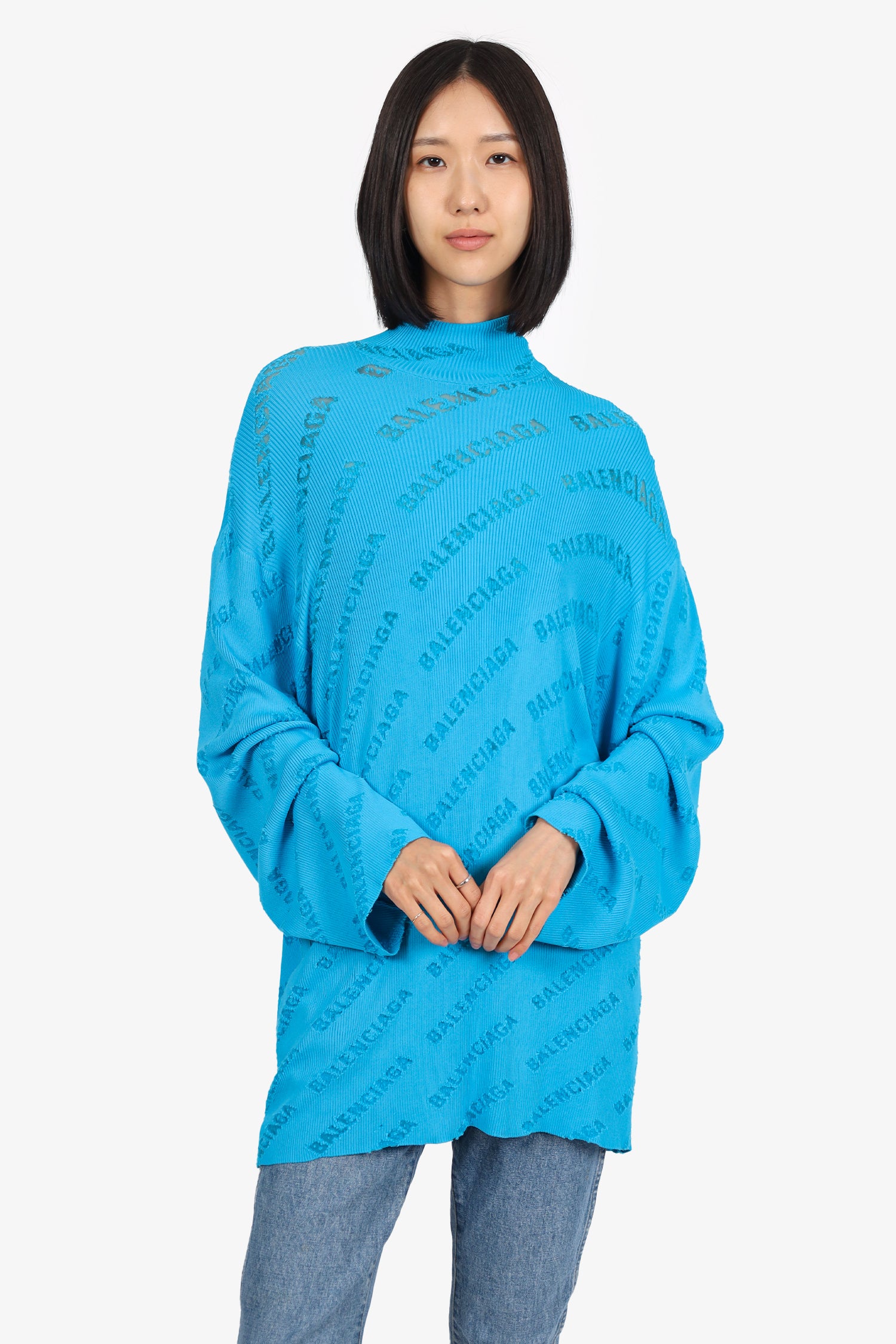 Refresh availabilityBalenciaga Blue All-Over Logo Oversized Ribbed Knit Sweater. Pull-on. Mock-neckline. Intentional distressing throughout. Tonal stitching.