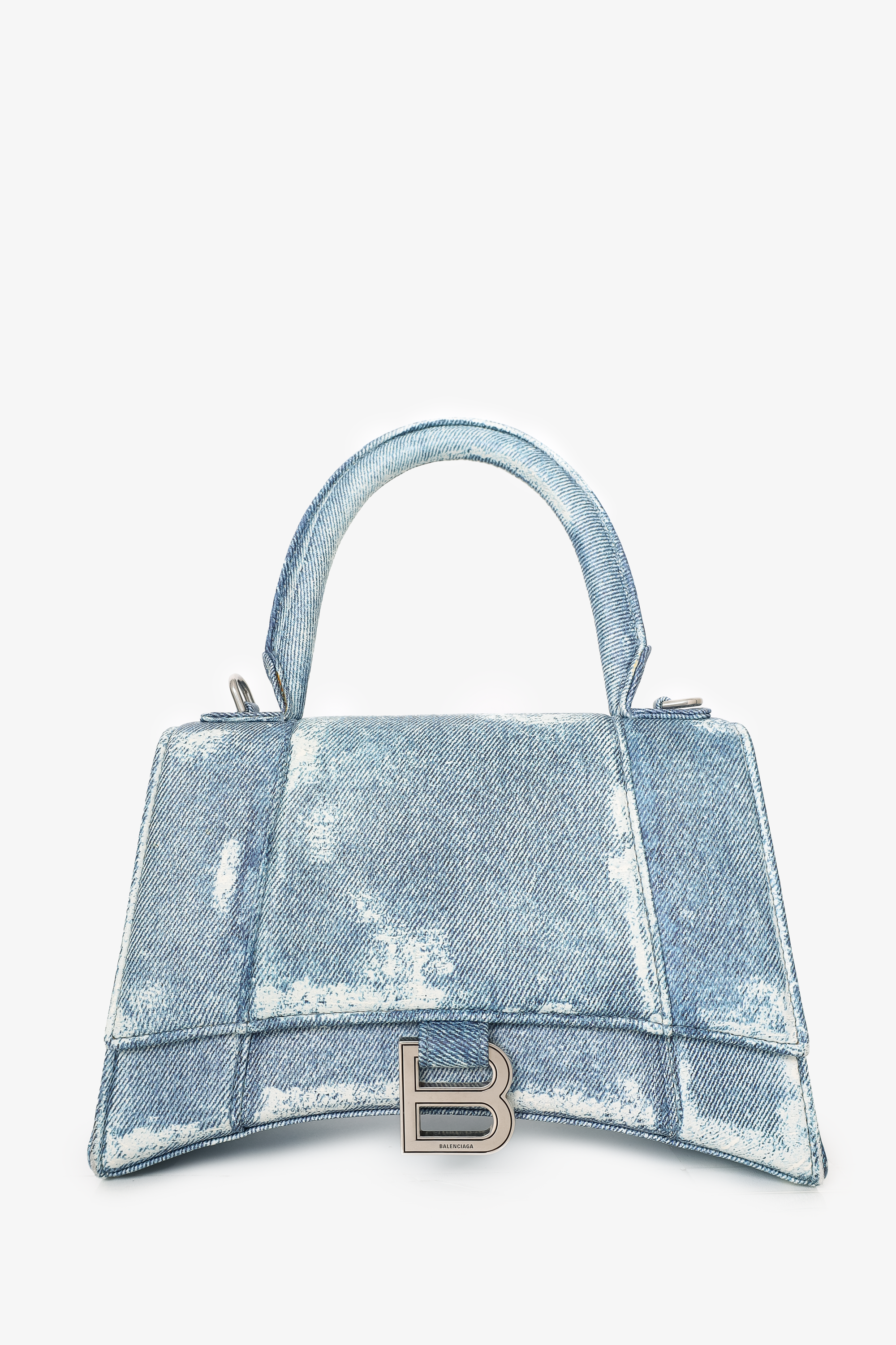 Refresh availabilityBalenciaga Blue Denim Painted Small Hourglass Top Handle with Strap. Magnetic button closure. Removable adjustable crossbody strap. Tonal stitching.