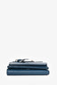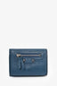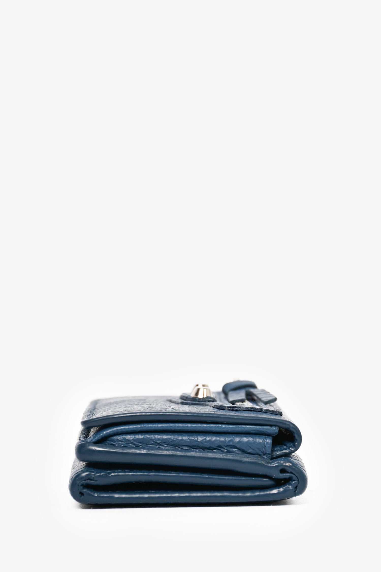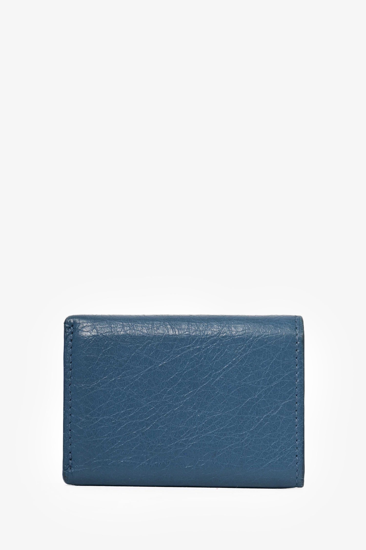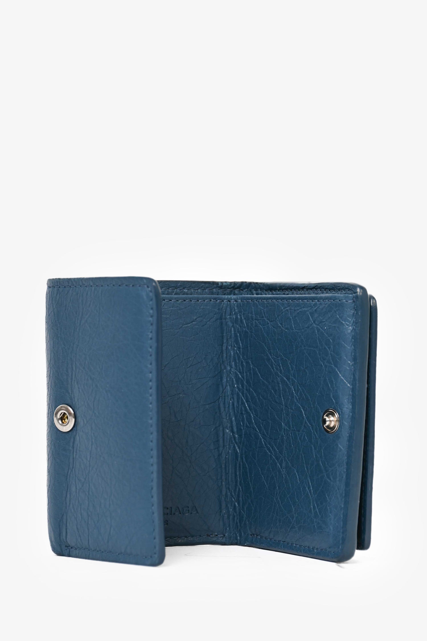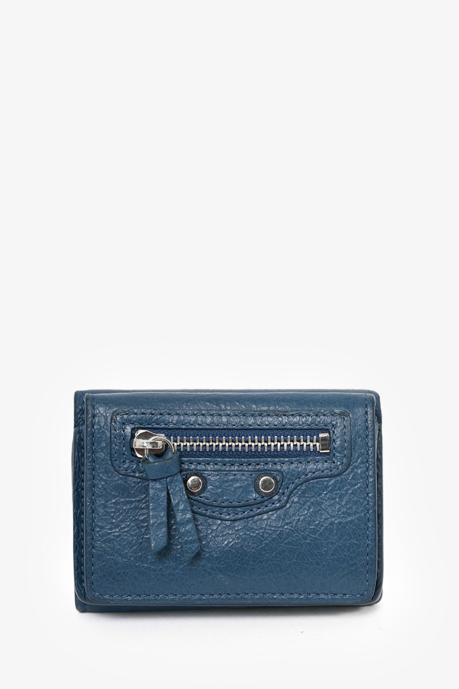 Refresh availabilityBalenciaga Blue Leather City Mini Wallet. Fold-open. Single rear coin pocket with zip closure. 3 interior card holder slots with 1 bill compartment. Silver-tone hardware. Tonal stitching.