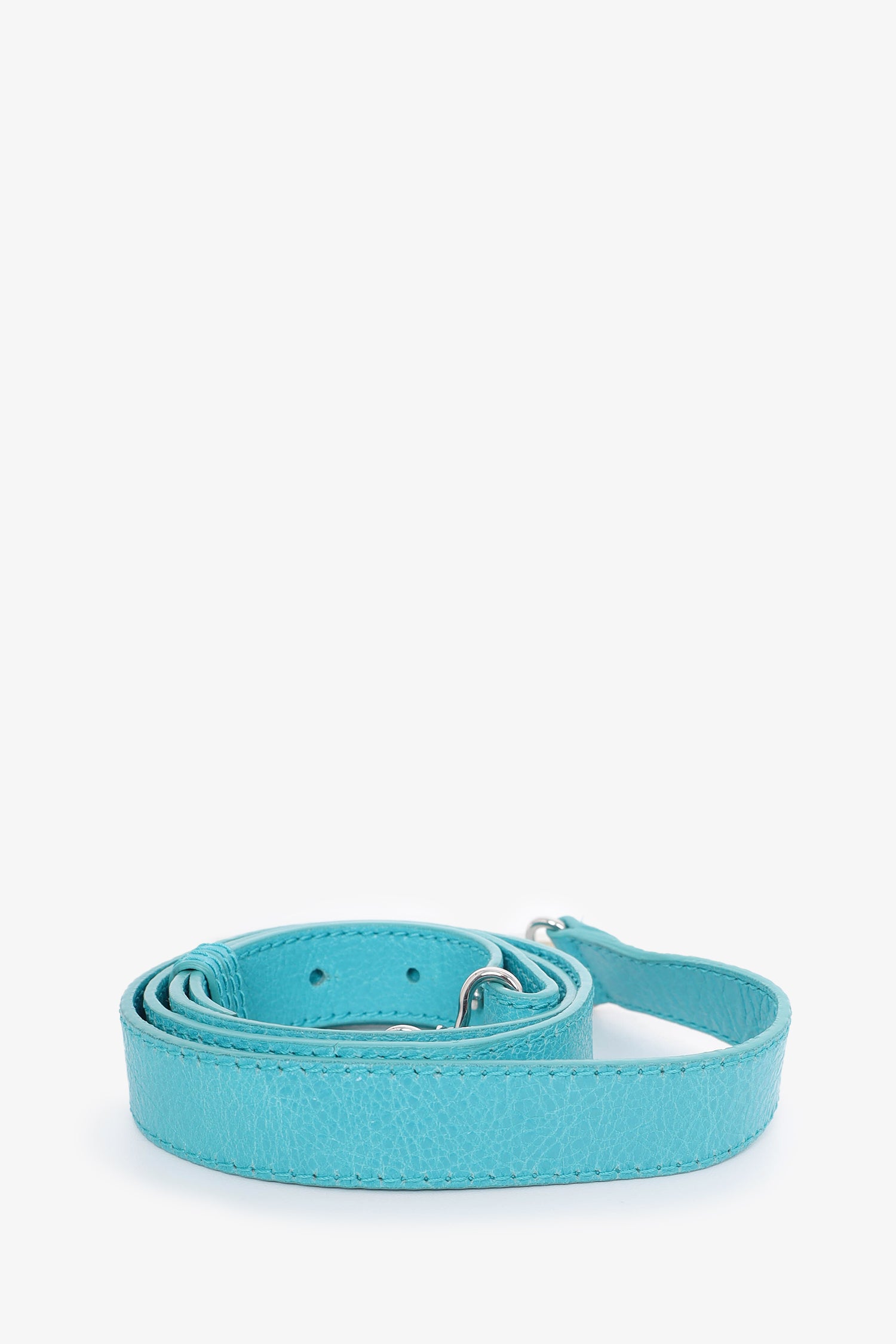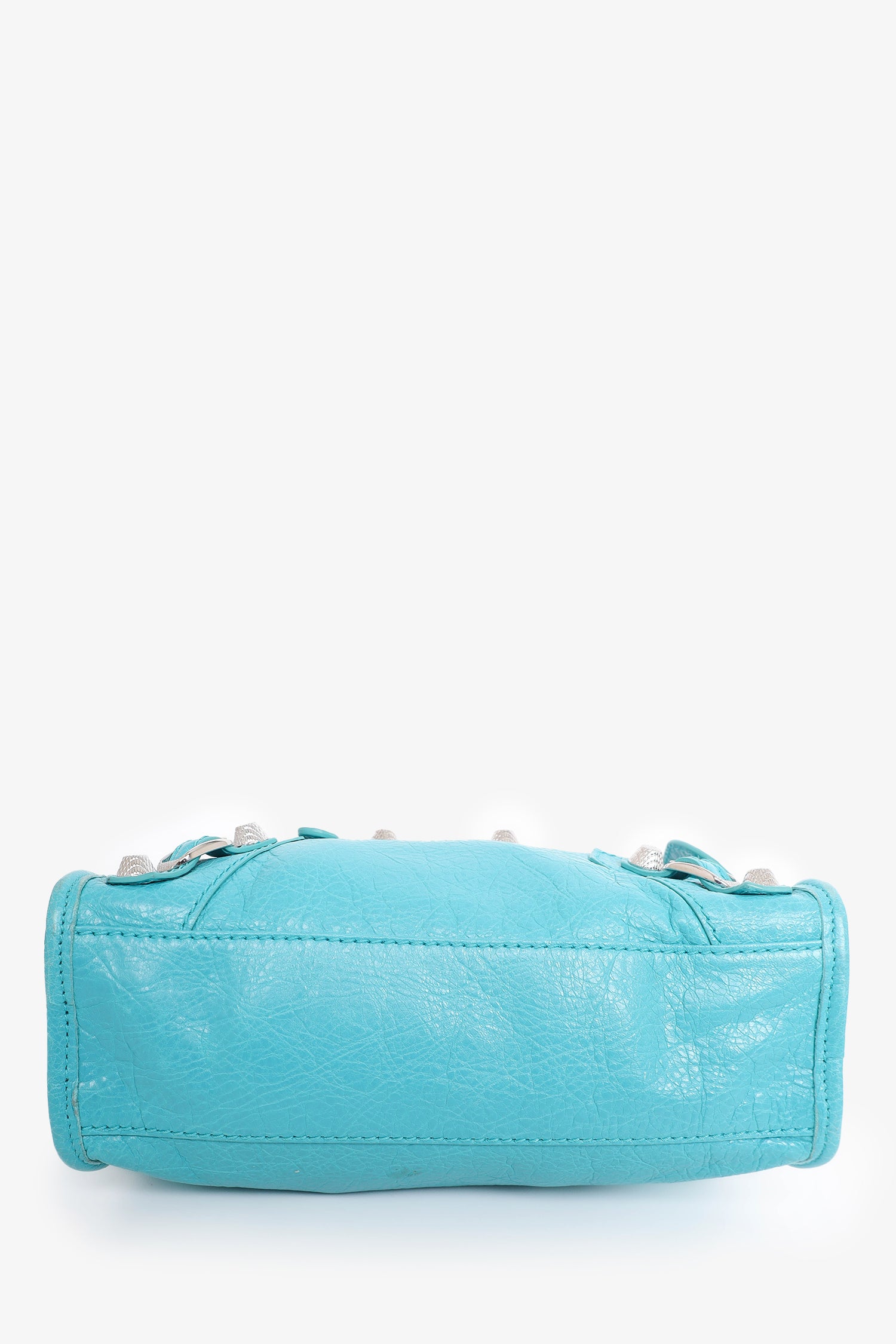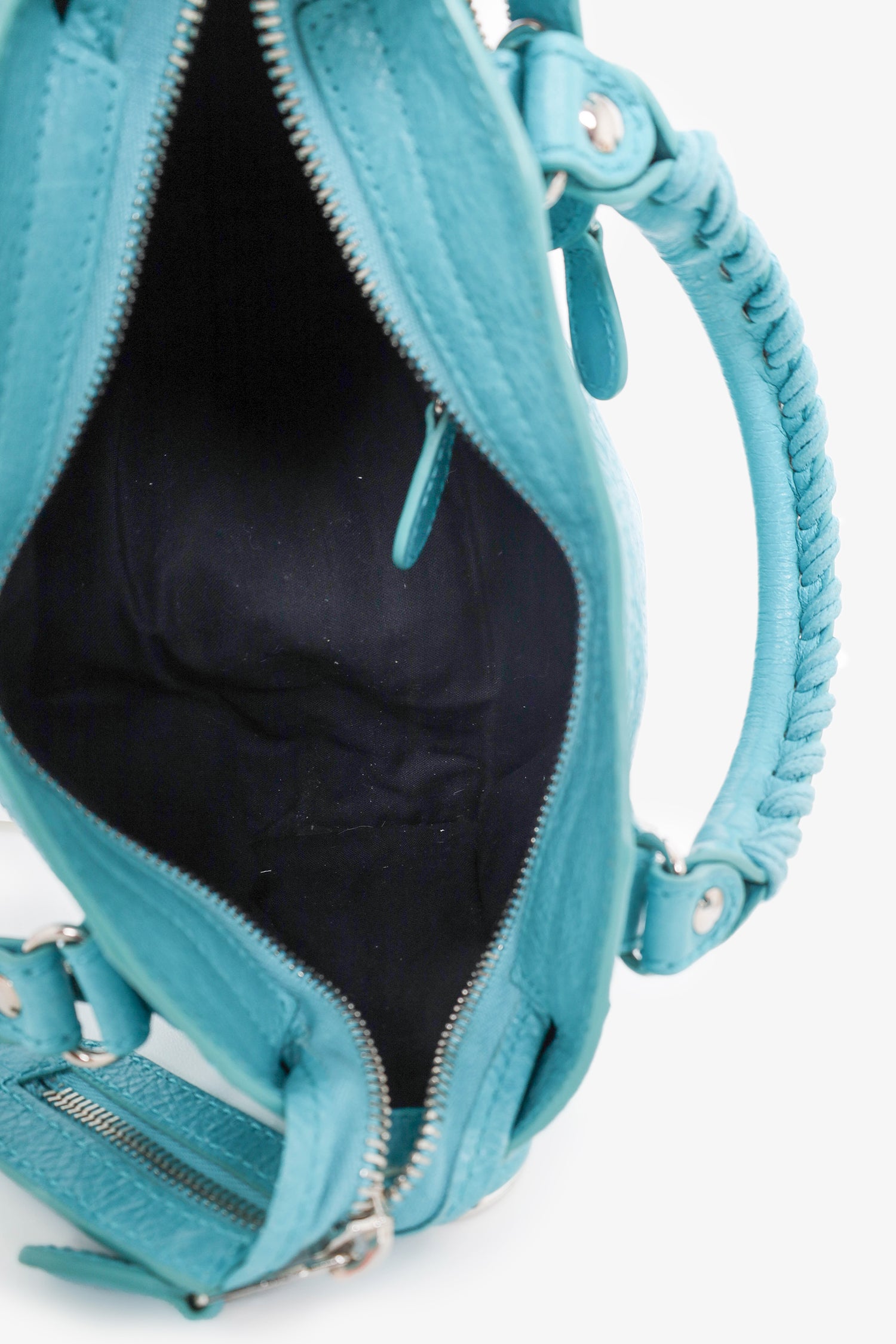 Balenciaga Blue Leather Classic Mini City Bag with Strap. Top zip closure. Interior wall pocket with zip closure. Exterior pocket with zip closure. Removable adjustable crossbody strap. Silver tone hardware. Tonal stitching.