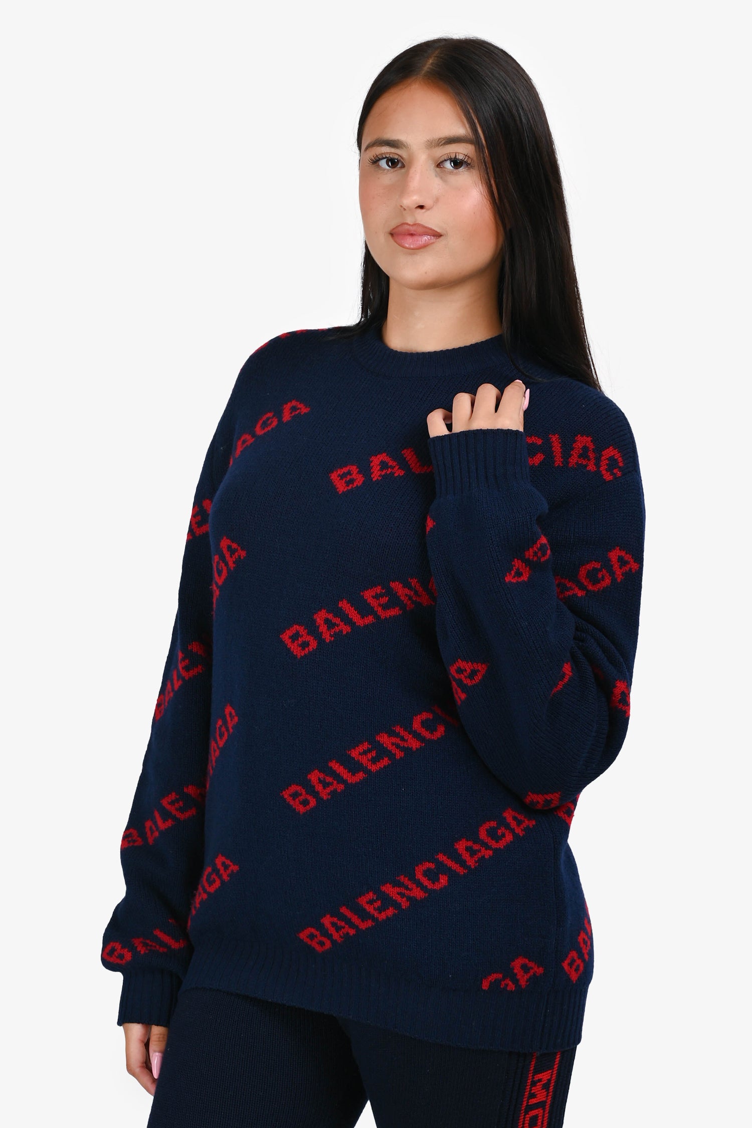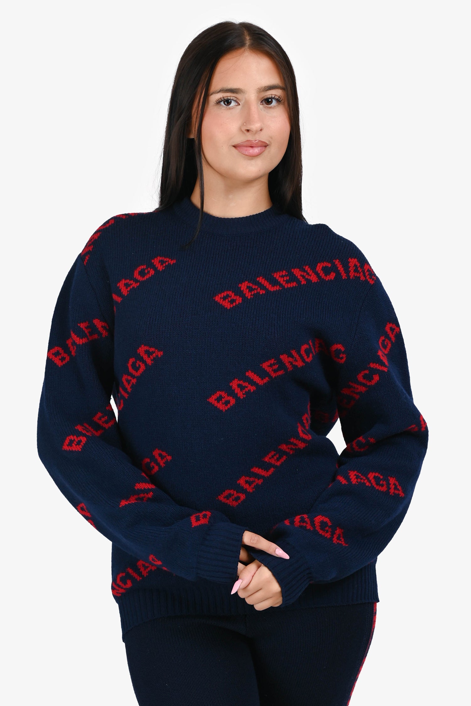 Refresh availabilityBalenciaga Blue/Red All Over Printed Wool Logo Sweater. Round neck. Pull-on. Ribbed neck, cuffs and hem.