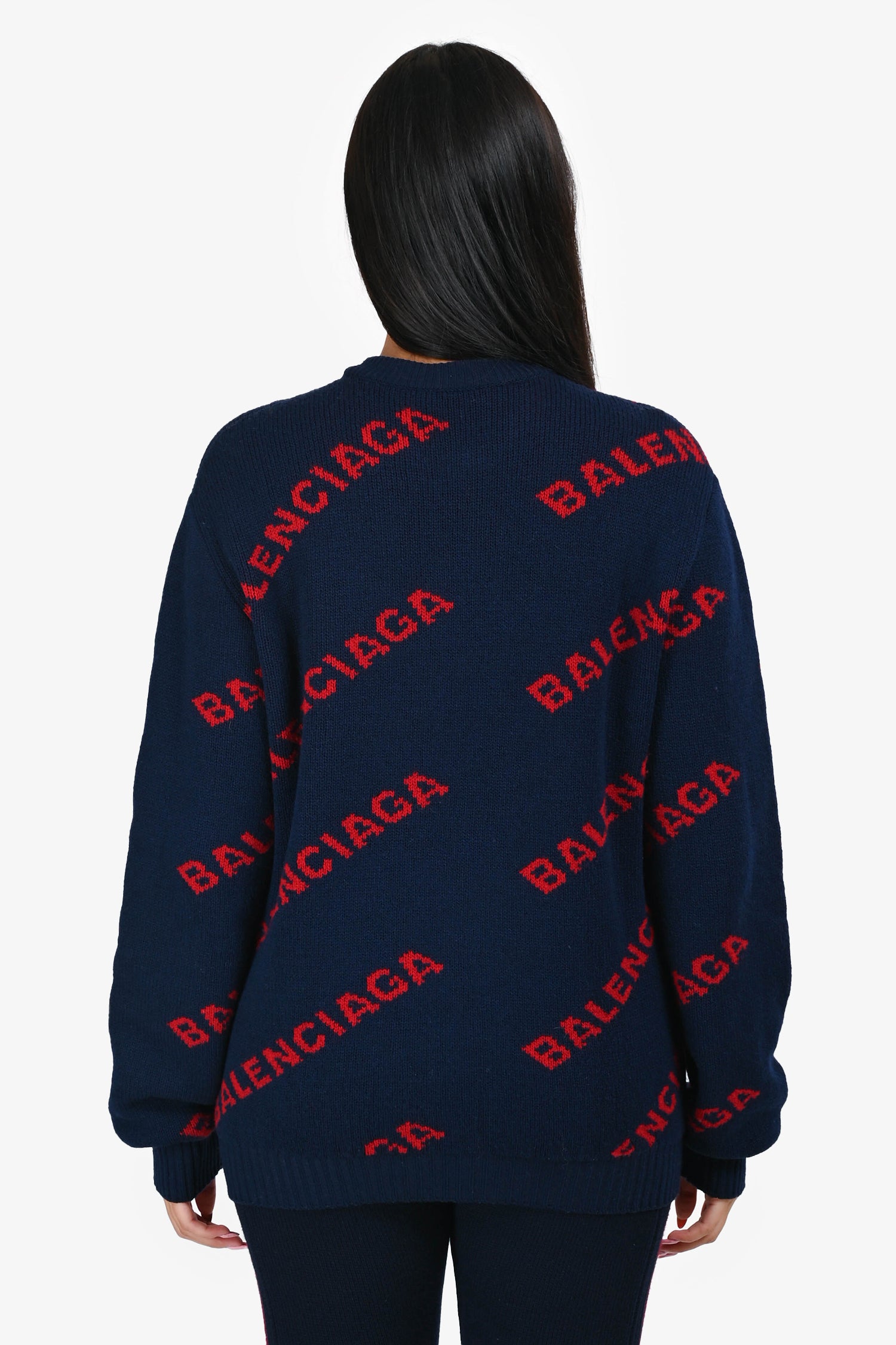 Balenciaga Blue/Red All Over Printed Wool Logo Sweater Size S Mens