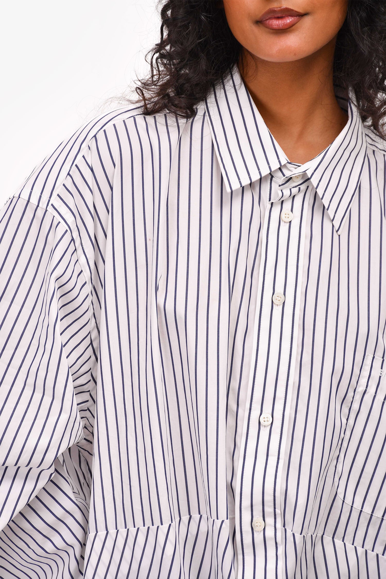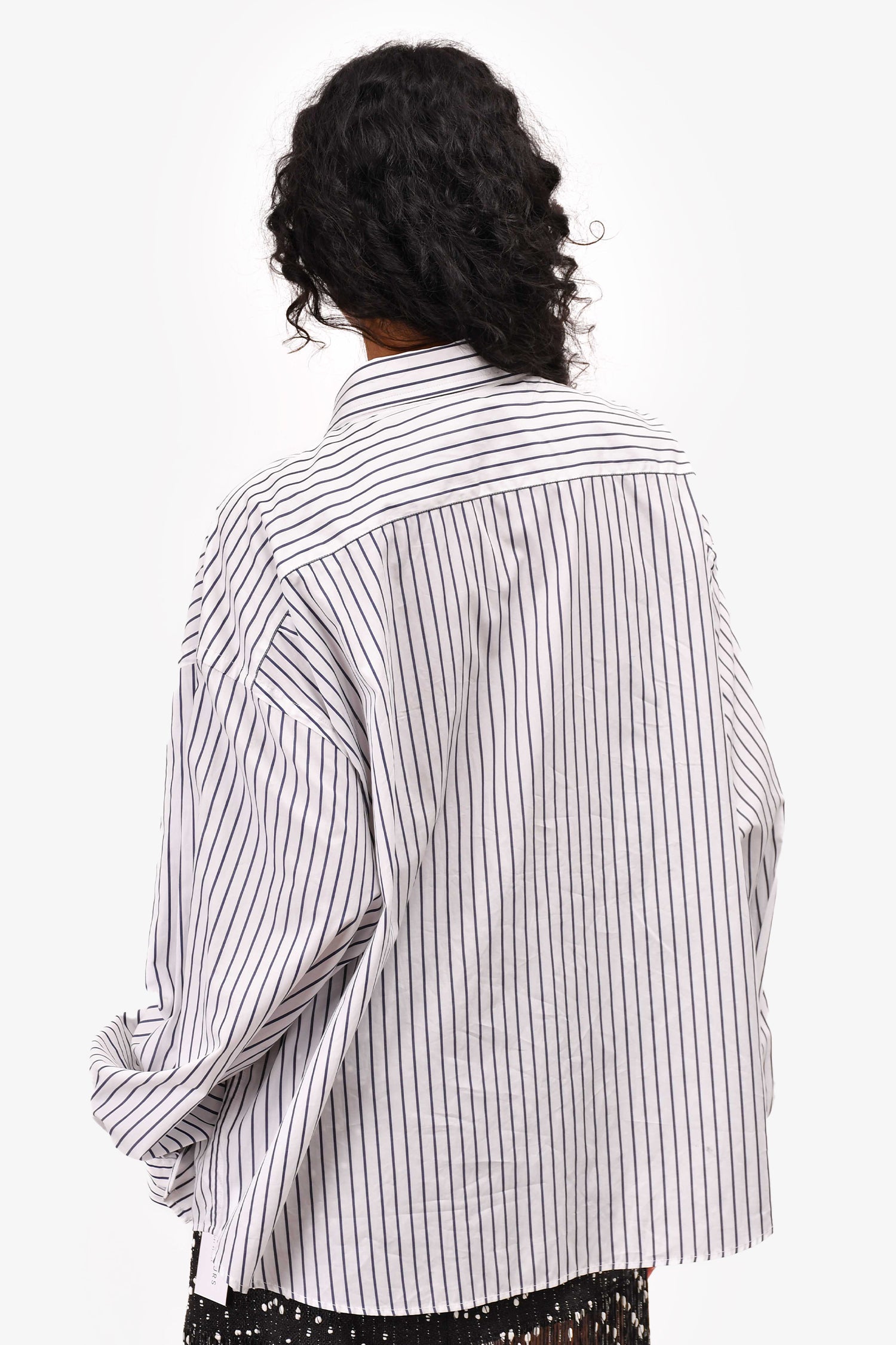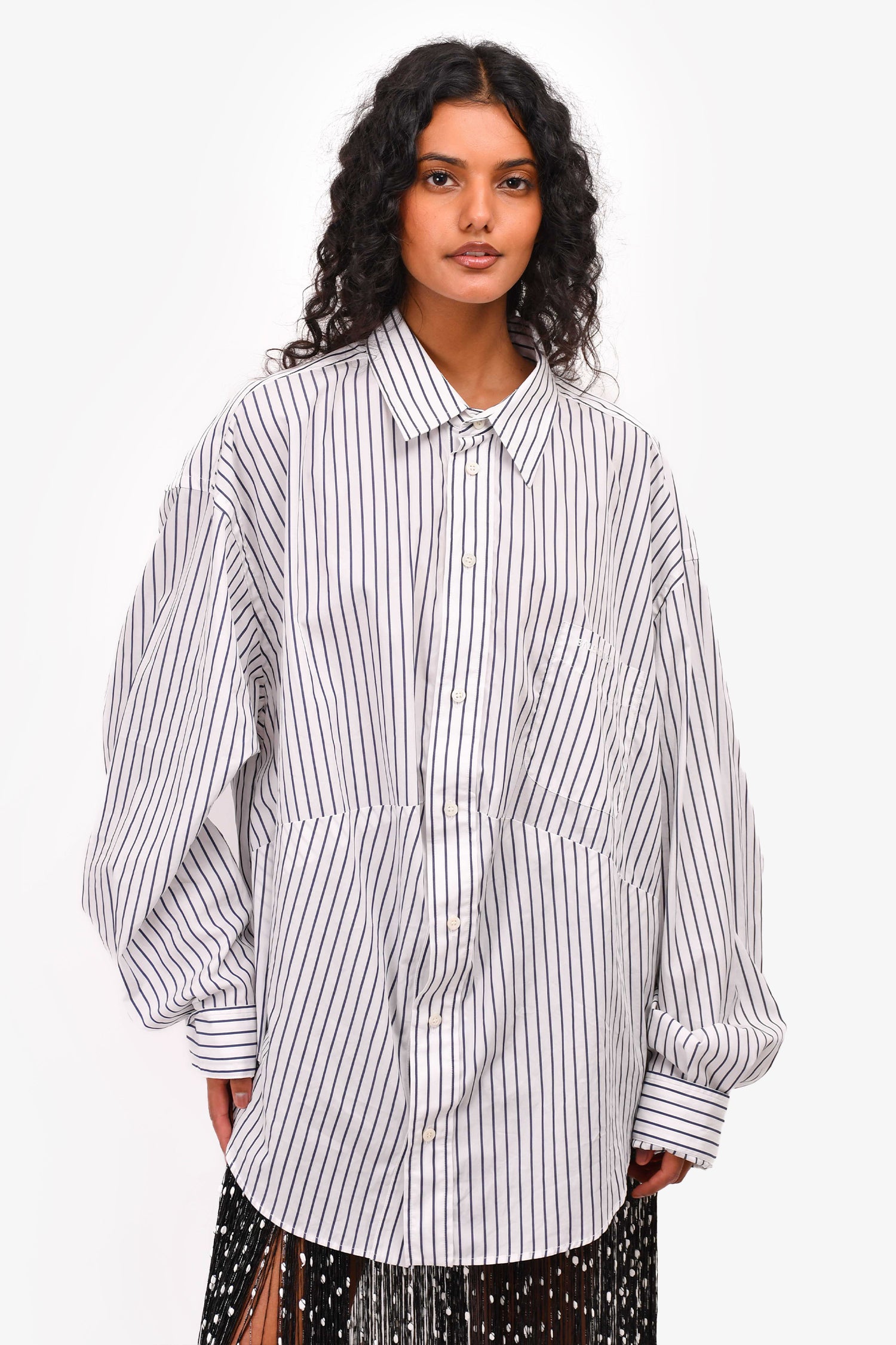 Refresh availabilityBalenciaga Blue/White Pinstriped Oversized Button Down Shirt. Single breast pocket with "BALENCIAGA" white stitching. Buttoned cuffs. Tonal stitching.