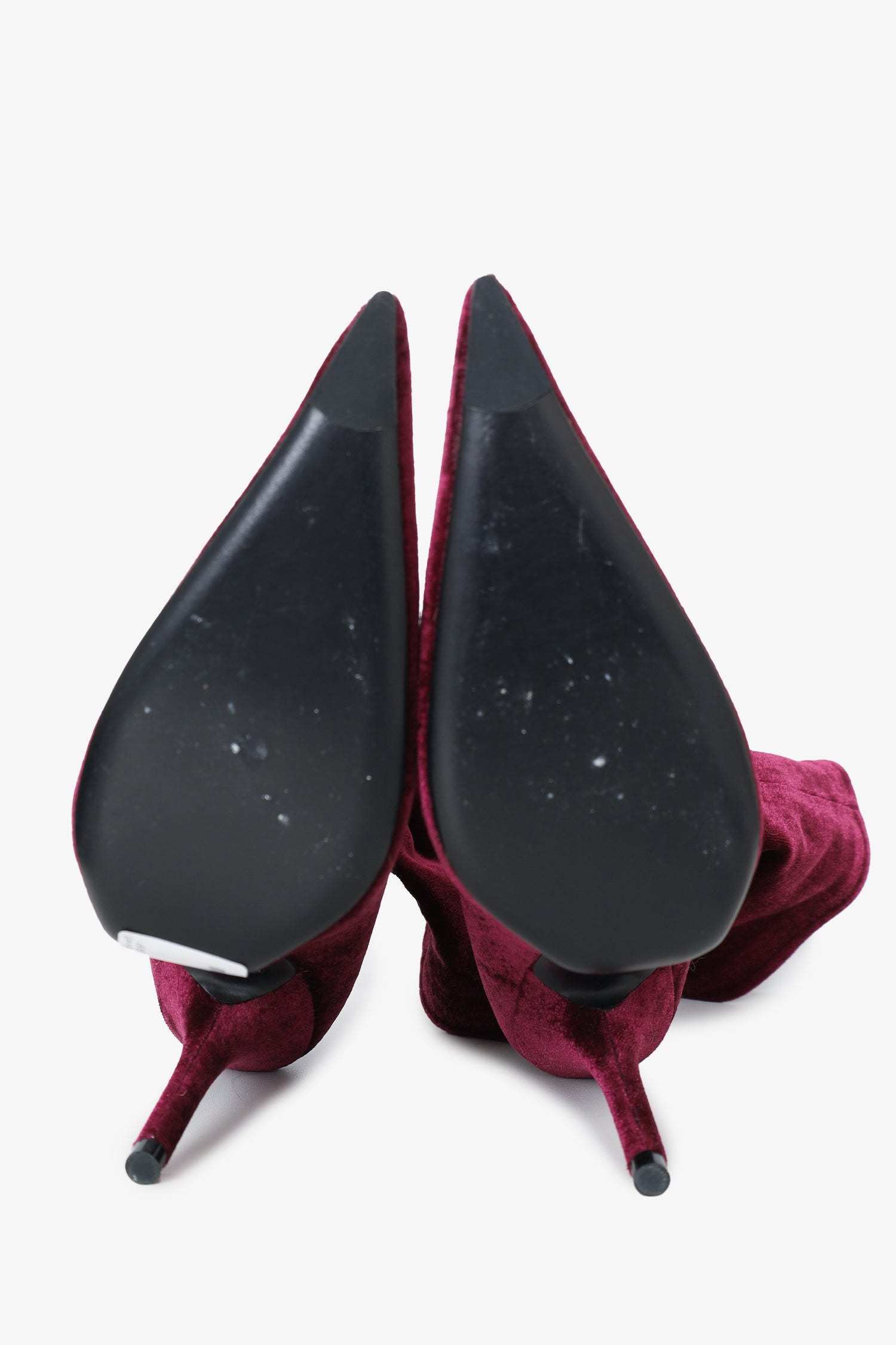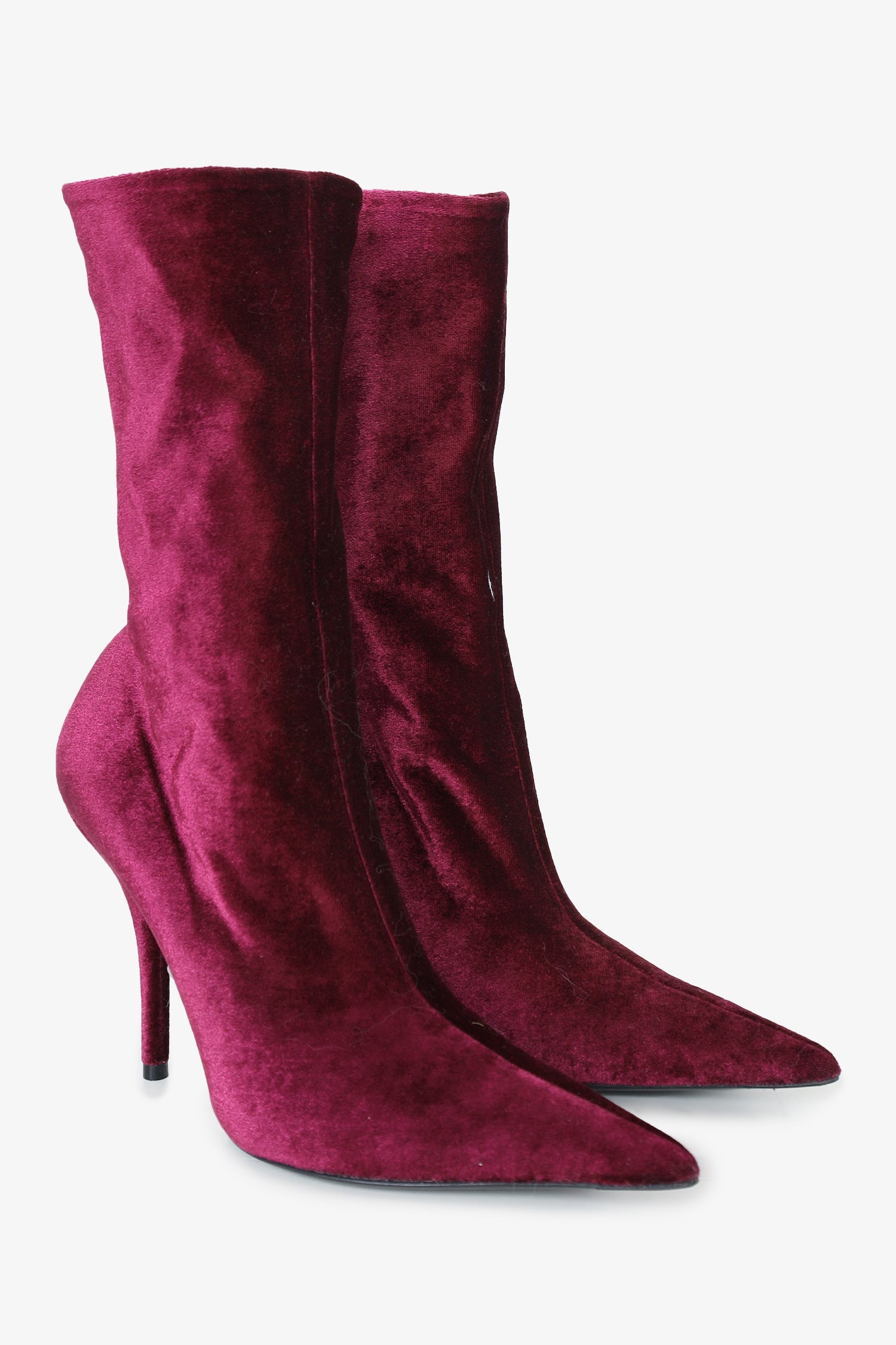 Refresh availabilityBalenciaga Burgundy Velvet Knife 110MM Sock Boots. Pointed toe. Slip-on. Stiletto heel. Tonal stitching.