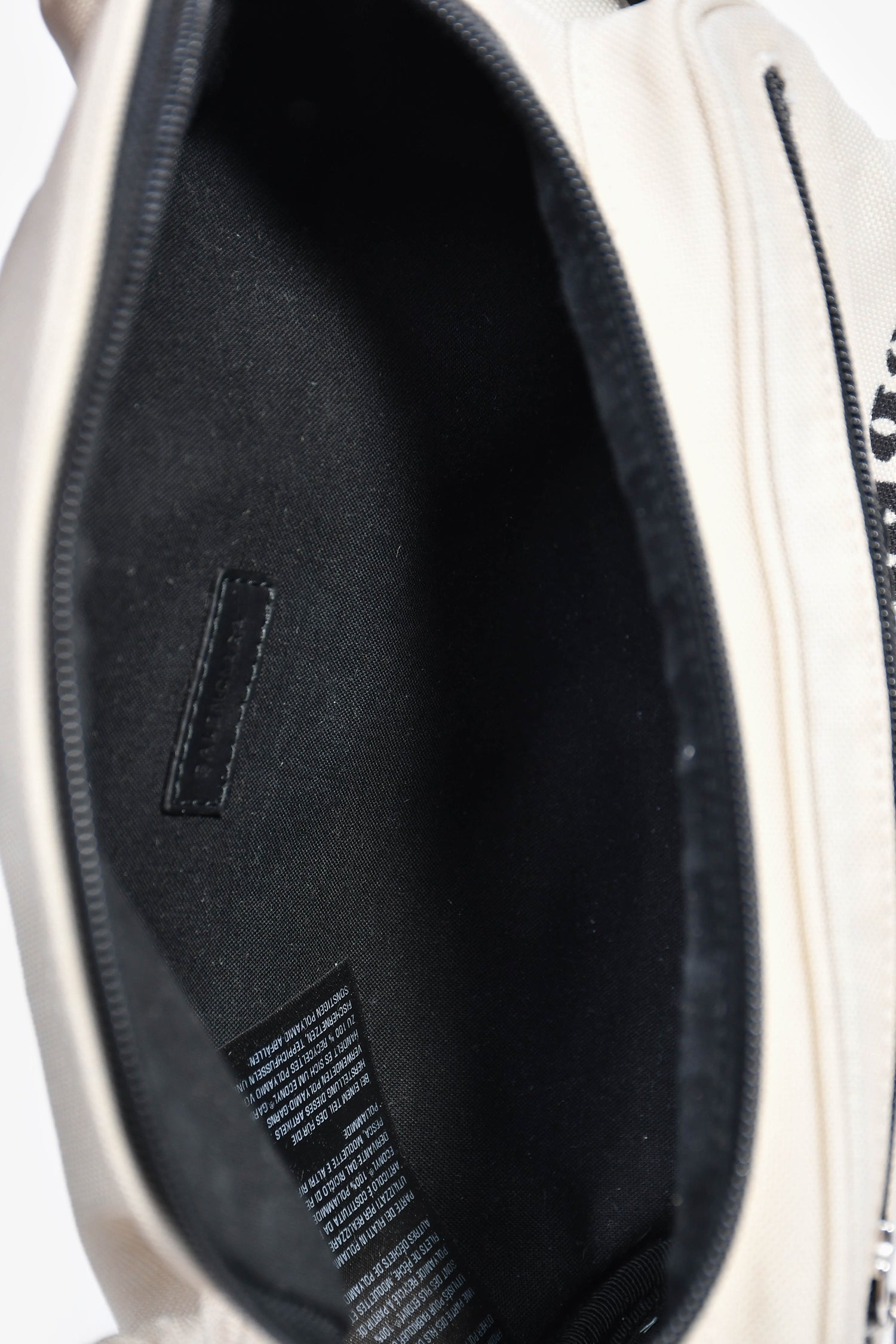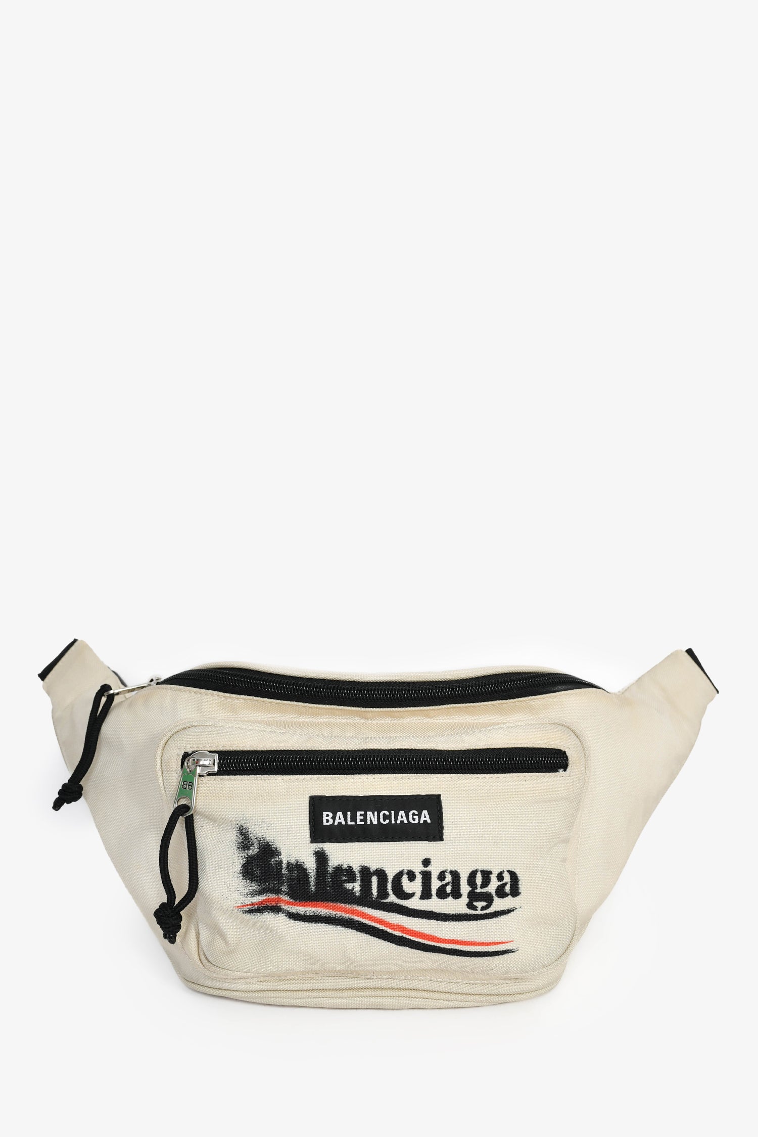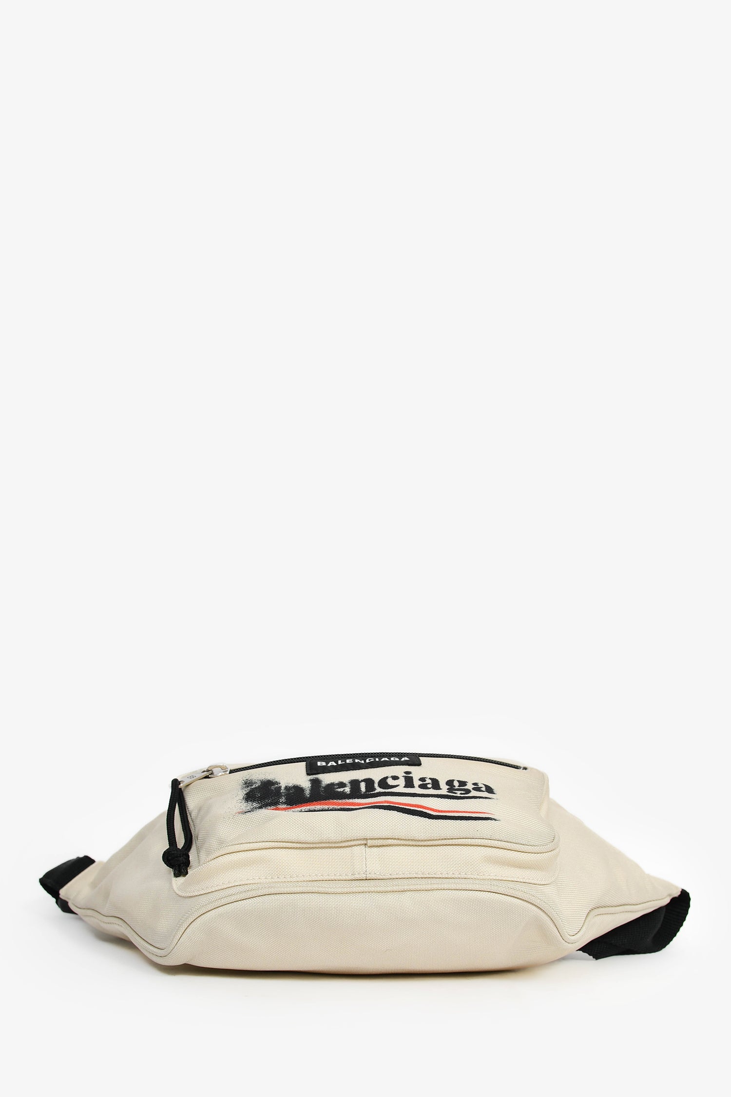 Refresh availabilityBalenciaga Cream Canvas Graffiti Logo Belt Bag. Top zip closure into main compartment. Front zip closure into second compartment. Open interior to both compartments. Adjustable and detachable belt strap. Tonal stitching. Silver-tone hardware.