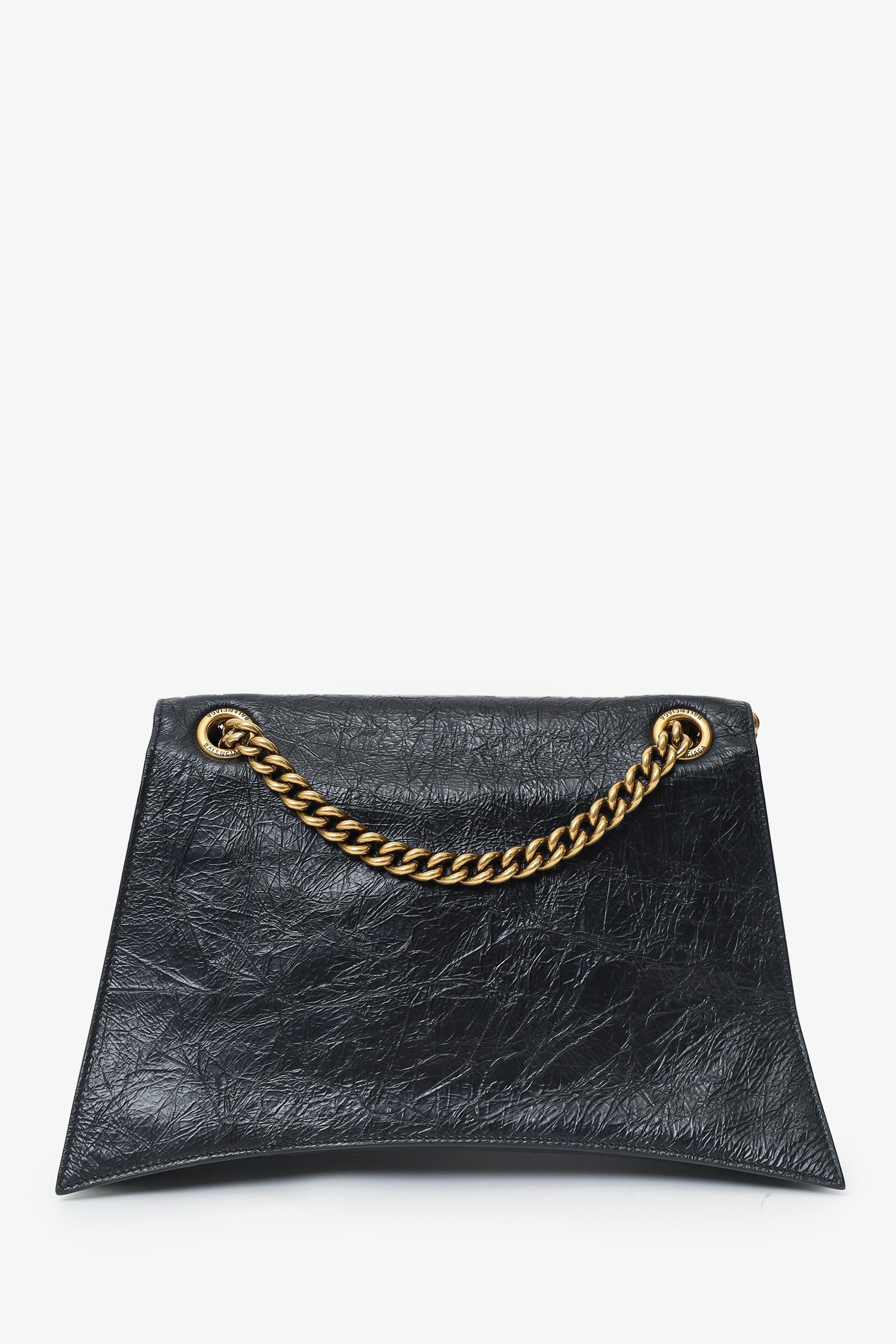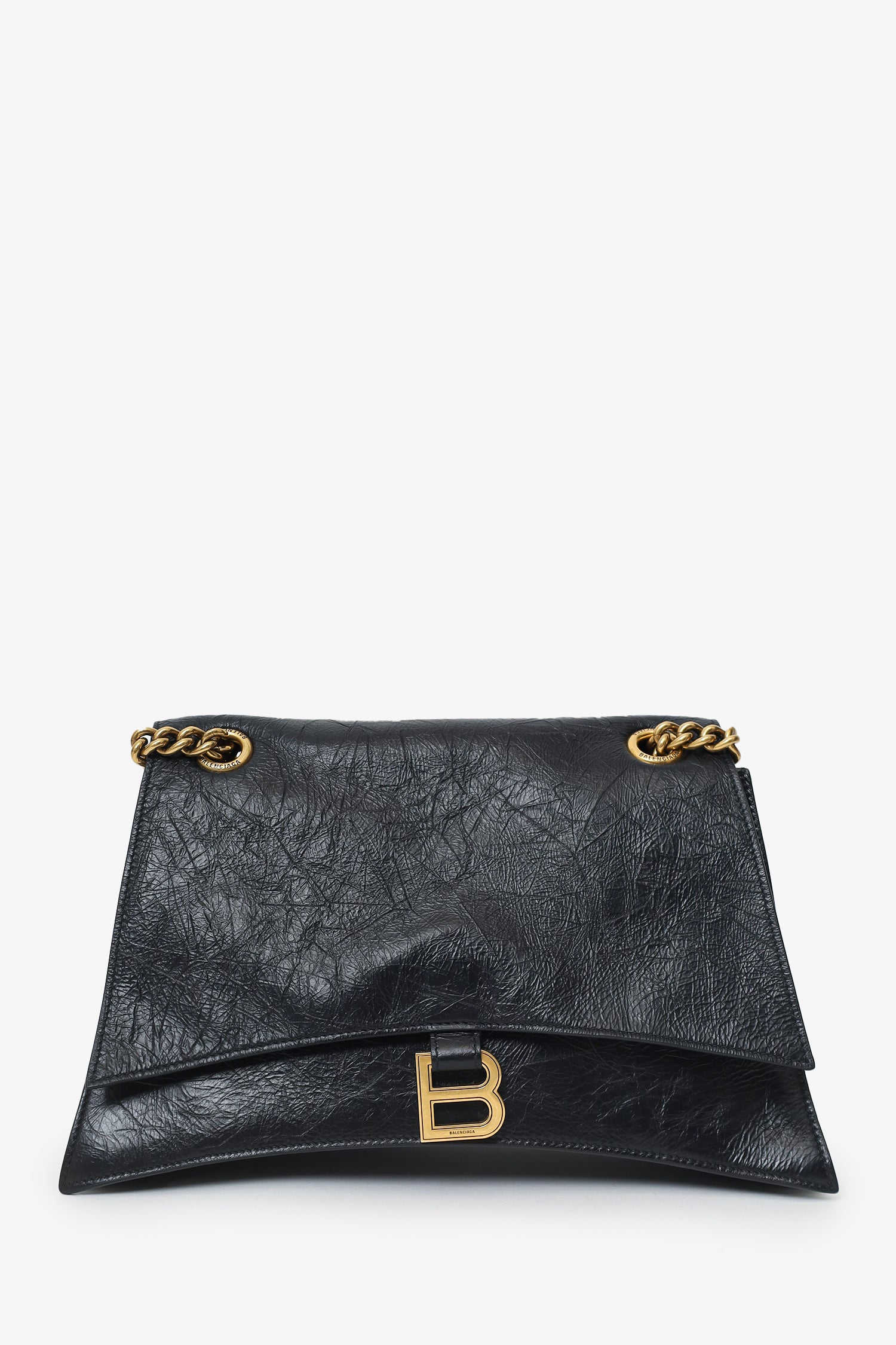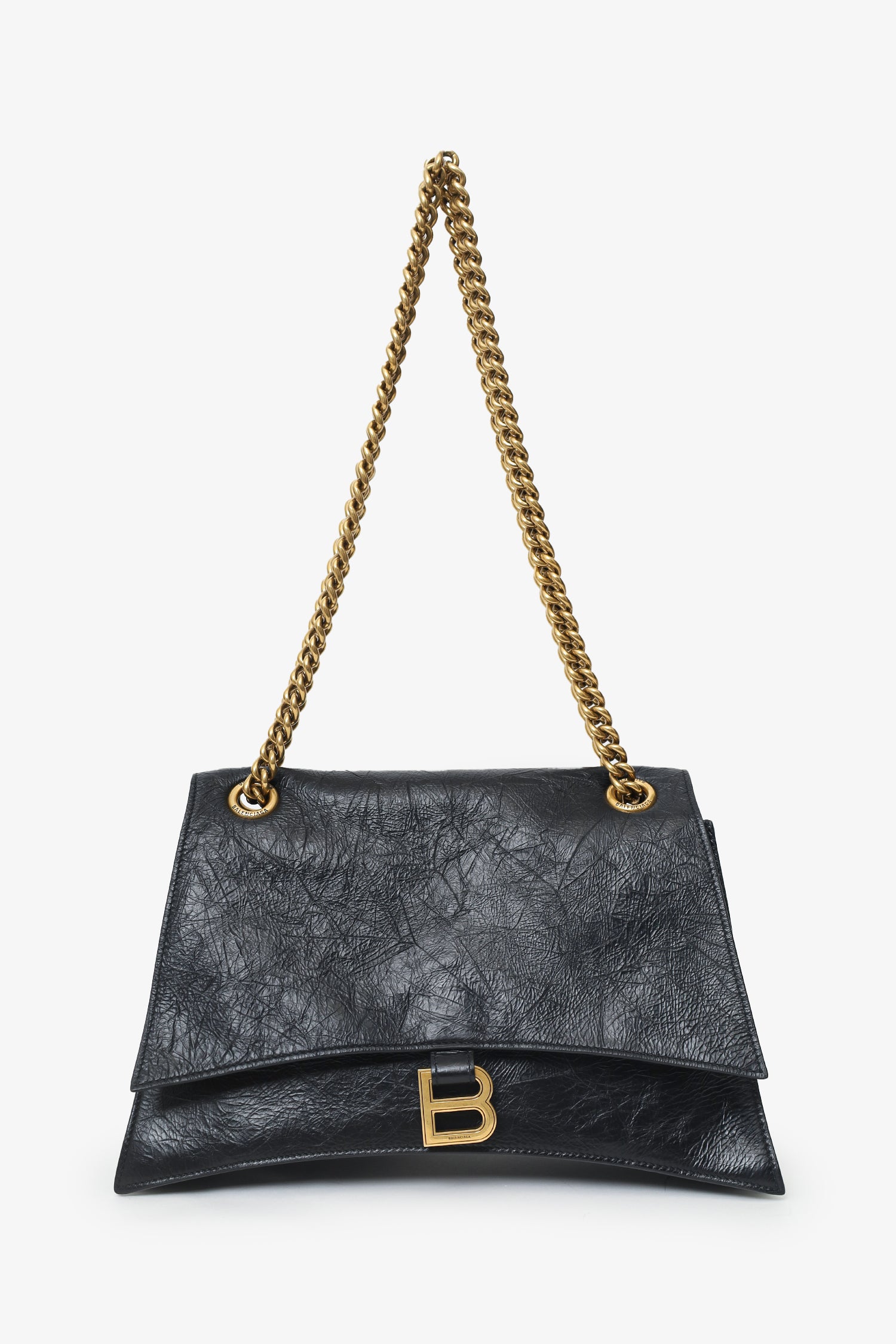 Refresh availabilityBalenciaga Black Crushed Calfskin Medium Crush Chain Bag. Front fold-over flap with magnetic snap-button closure. Twin chainlink strap that can be pulled into one longer strap. 5 interior compartments; 4 slip and 1 zip. Gold-tone hardware. Tonal stitching.