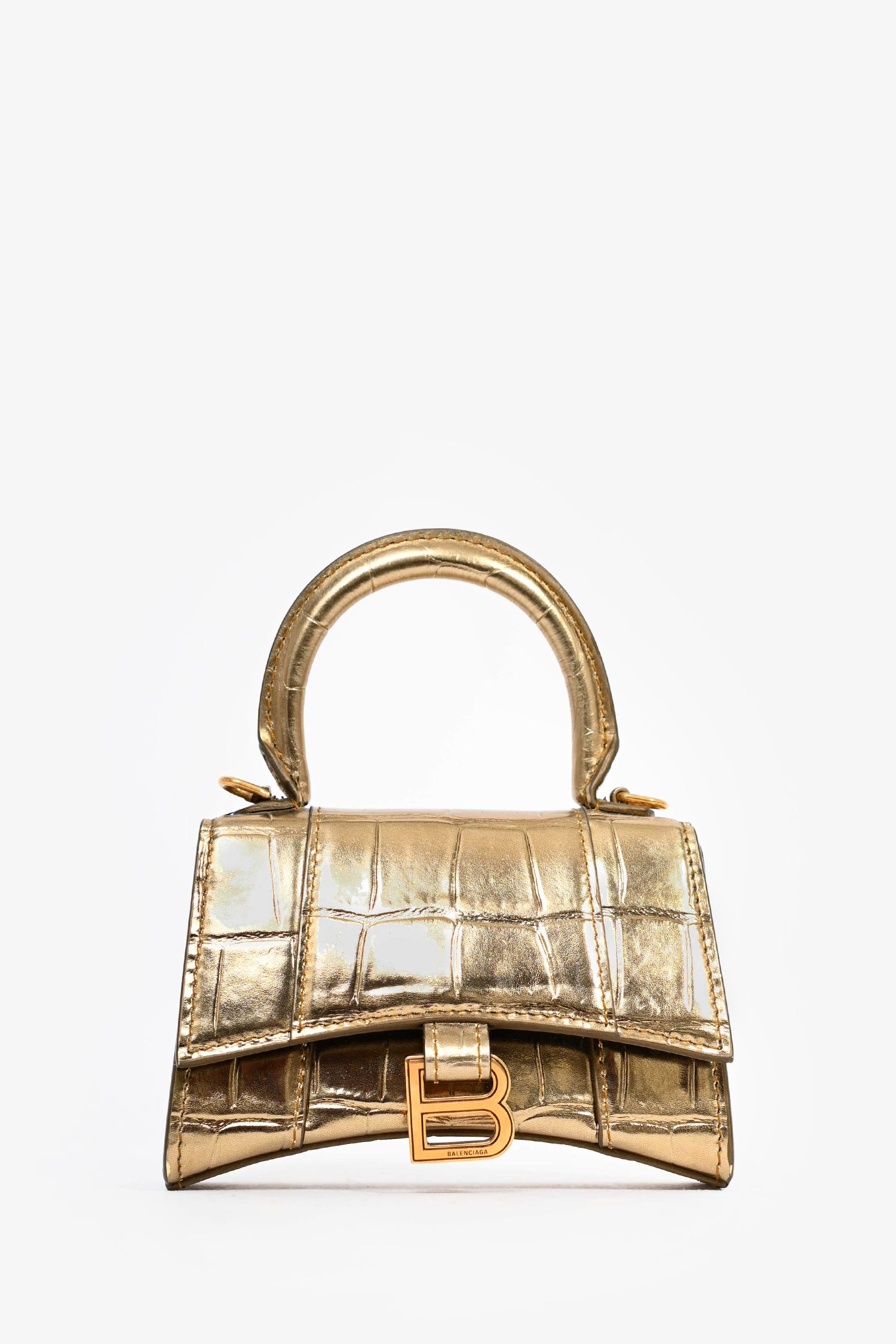 Refresh availabilityBalenciaga Gold Croc Embossed Leather Hourglass Nano Chain Bag. Single top handle. Gold-tone hardware. Coated trimming. Fold-over flap. Interior slip compartment. Chain-link strap.