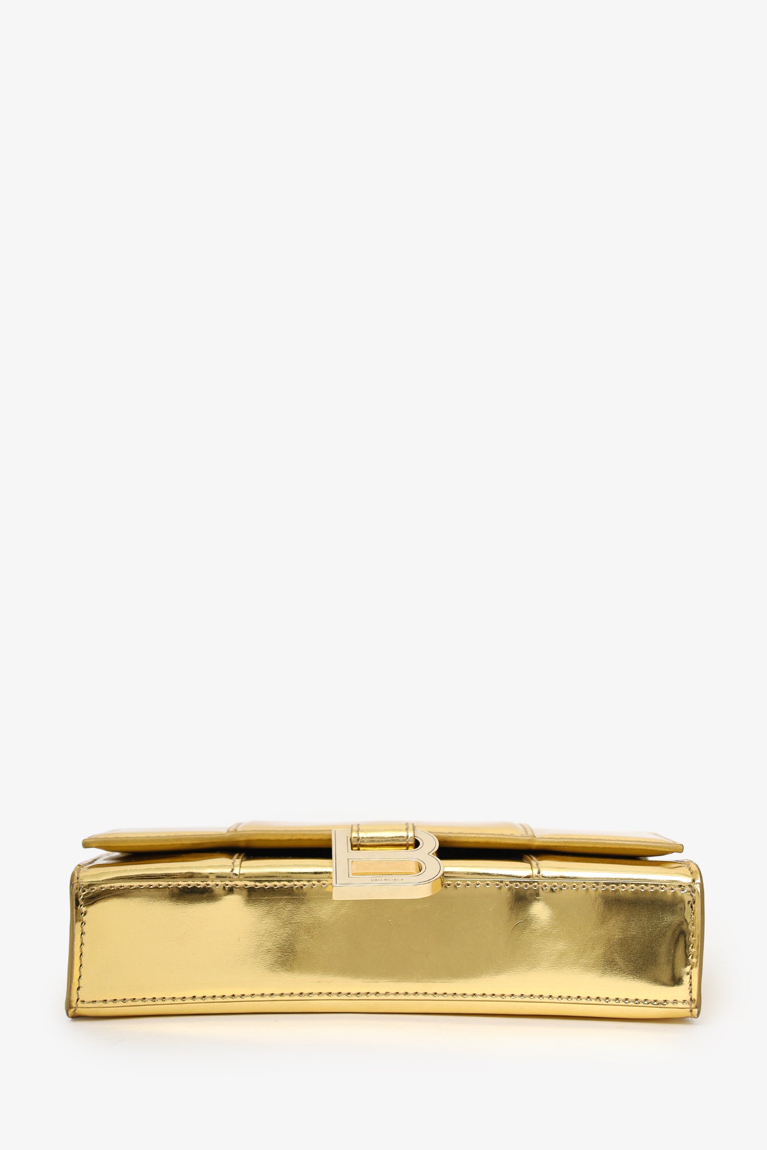 Refresh availabilityBalenciaga Gold Hourglass Wallet On Chain. Front fold-over flap with magnetic snap-button closure. Removable chainlink strap. Rear exterior slip pocket. Leather-lined interior. 2 interior slip pockets, 1 interior zip pocket and 6 interior card slots. Gold-tone hardware. Tonal stitching.